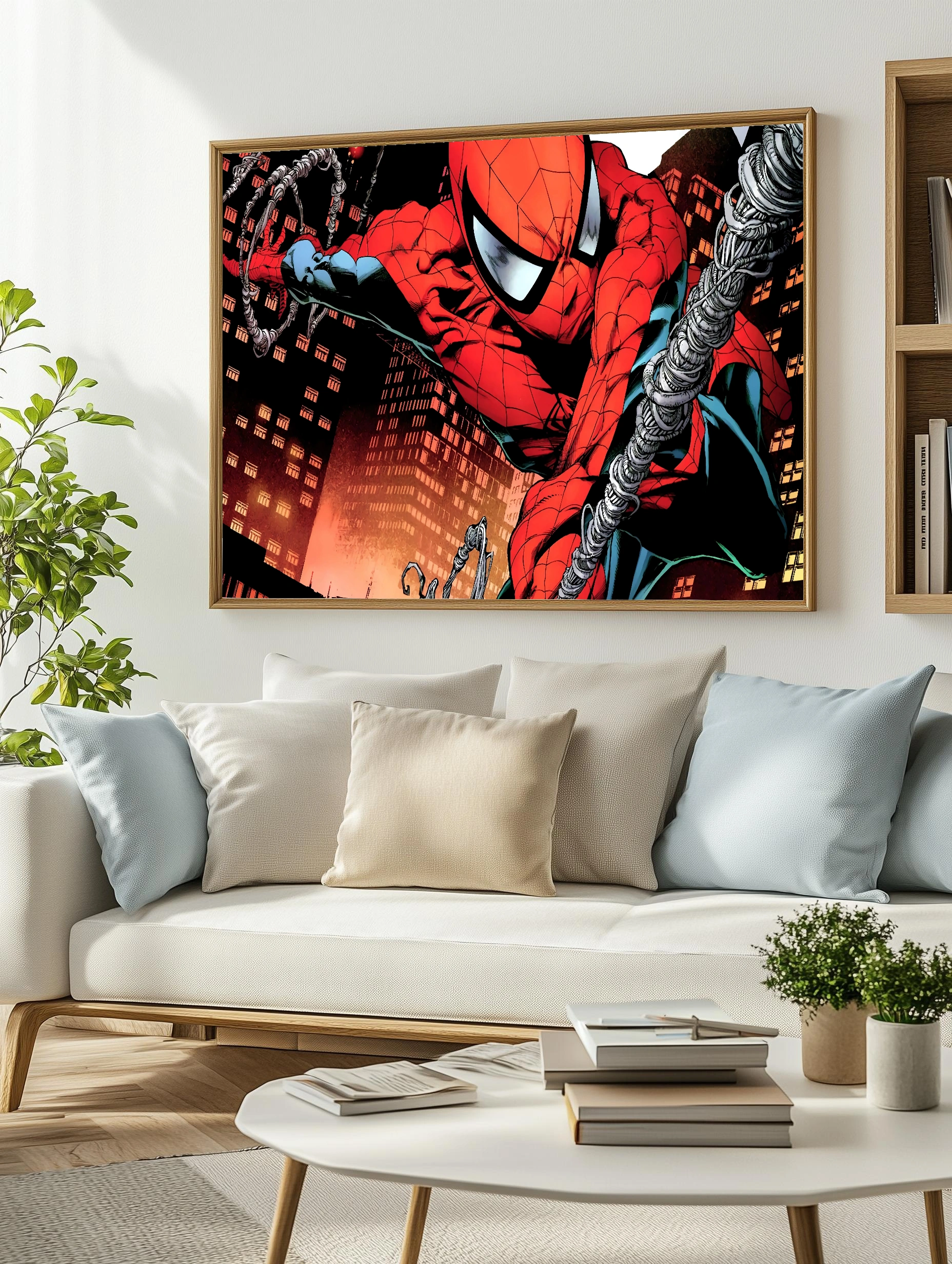 Этот интерьерный постер изображает Человека-паука в характерной красно-синей маске и костюме, выполняющего прыжок на фоне ночного городского пейзажа. Стиль арта комиксов с чёткими линиями и насыщенными цветами. Идеально подходит как декоративный плакат для гостиной или офиса, добавляя энергии и динамики в пространство.
