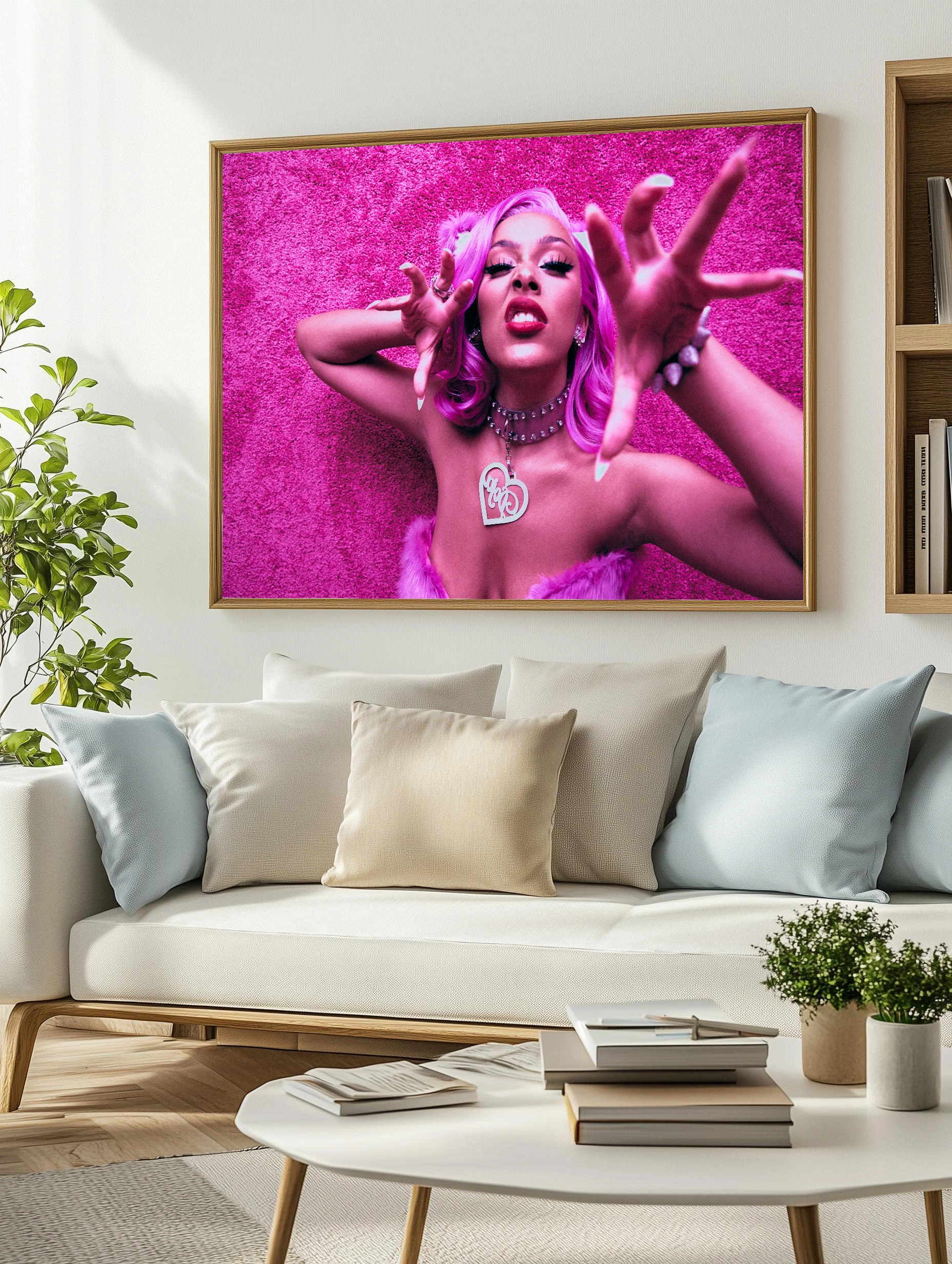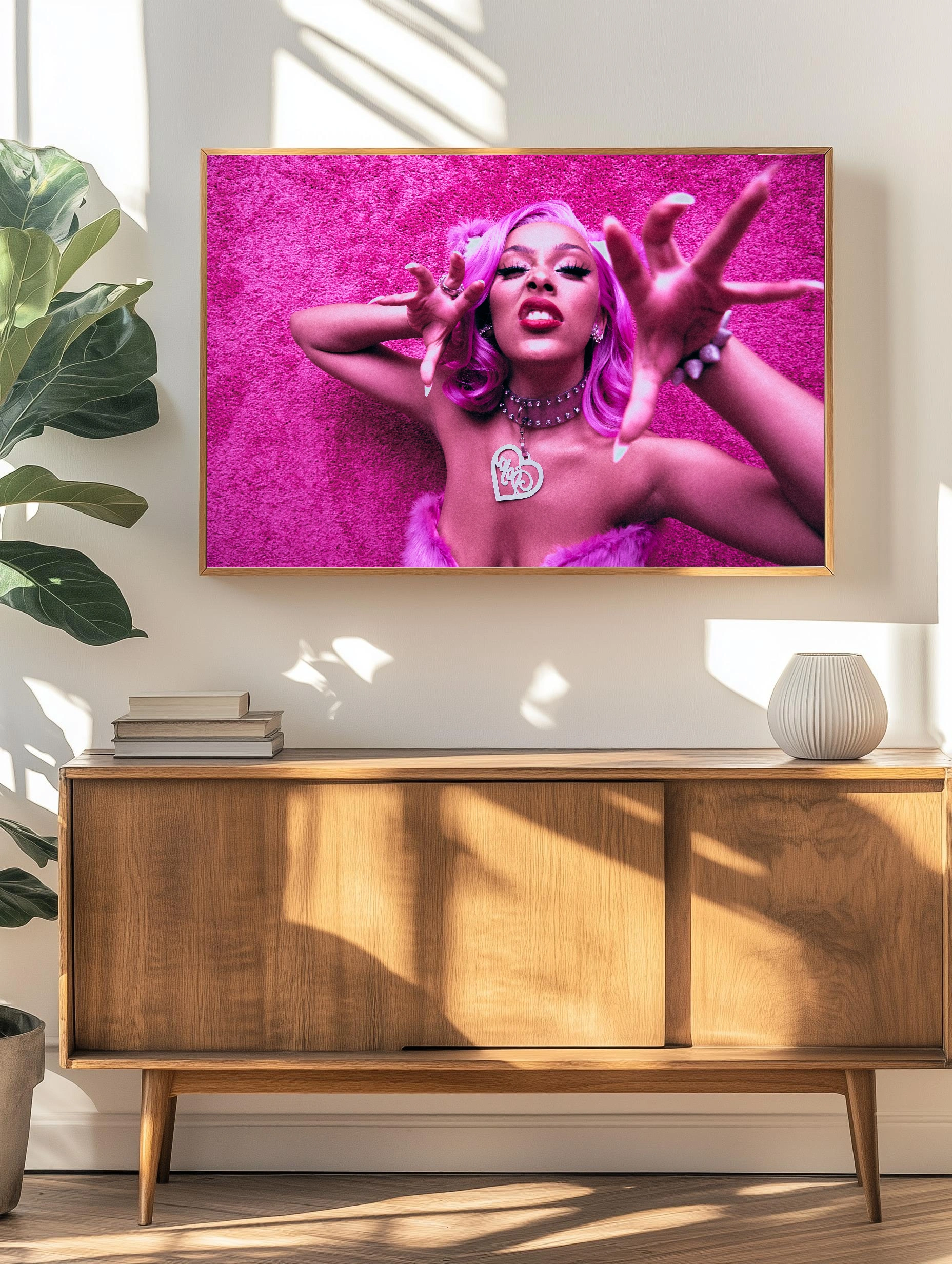 Декоративный фотопостер с изображением женщины с ярко-розовыми волосами и выразительным макияжем на однотонном розовом фоне. Стиль современного искусства, сочетающий дерзкий жест с насыщенной цветовой палитрой — розовый, светло-розовый и красный. Отличный выбор для интерьера, гостиной или спальни, добавит динамики и стильного декора стен.