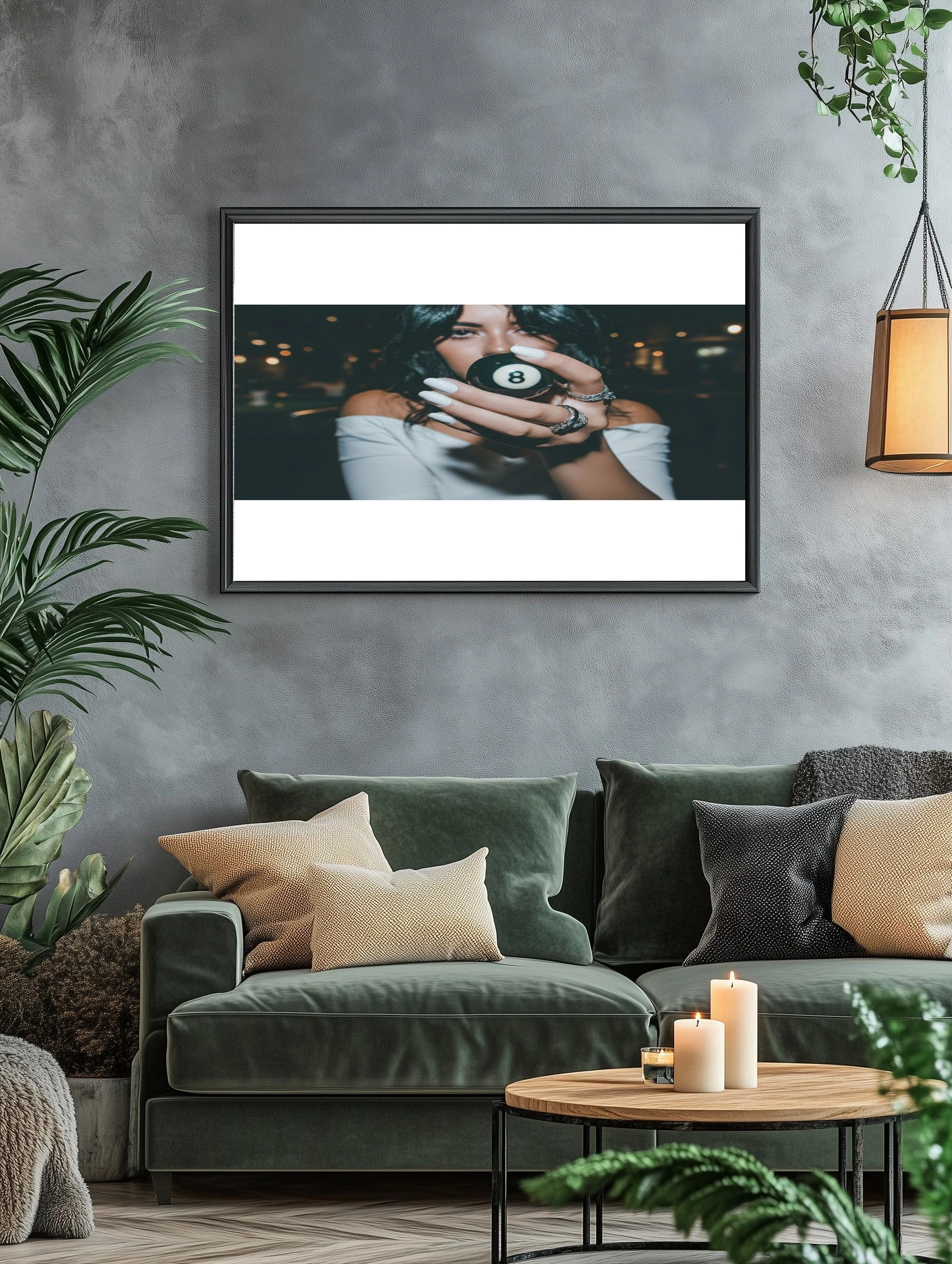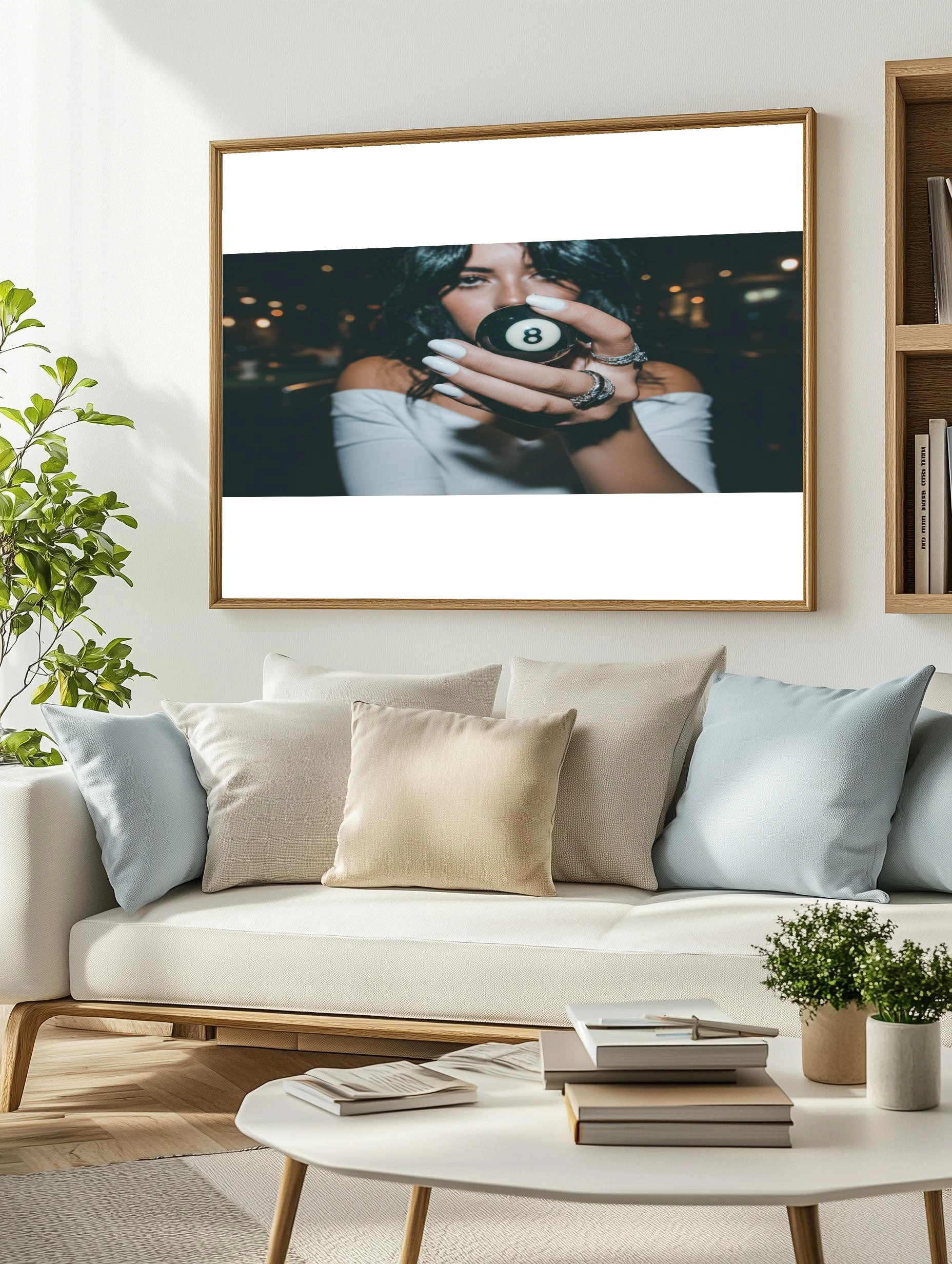 На этом постере изображена стильная девушка, держащая в руках бильярдный шар с номером 8. Она одета в белую блузку с открытыми плечами, что подчеркивает её элегантность и уверенность. На её руках сверкают несколько серебряных колец, добавляя образу нотки роскоши. Фон размыт, создавая атмосферу уюта и загадочности, с мягким освещением, которое акцентирует внимание на главном объекте. Постер выполнен в современном стиле, идеально подходящем для молодежных интерьеров. Яркие детали и контрастные цвета делают его привлекательным для креативщиков и любителей бильярда, добавляя изюминку в любое пространство.