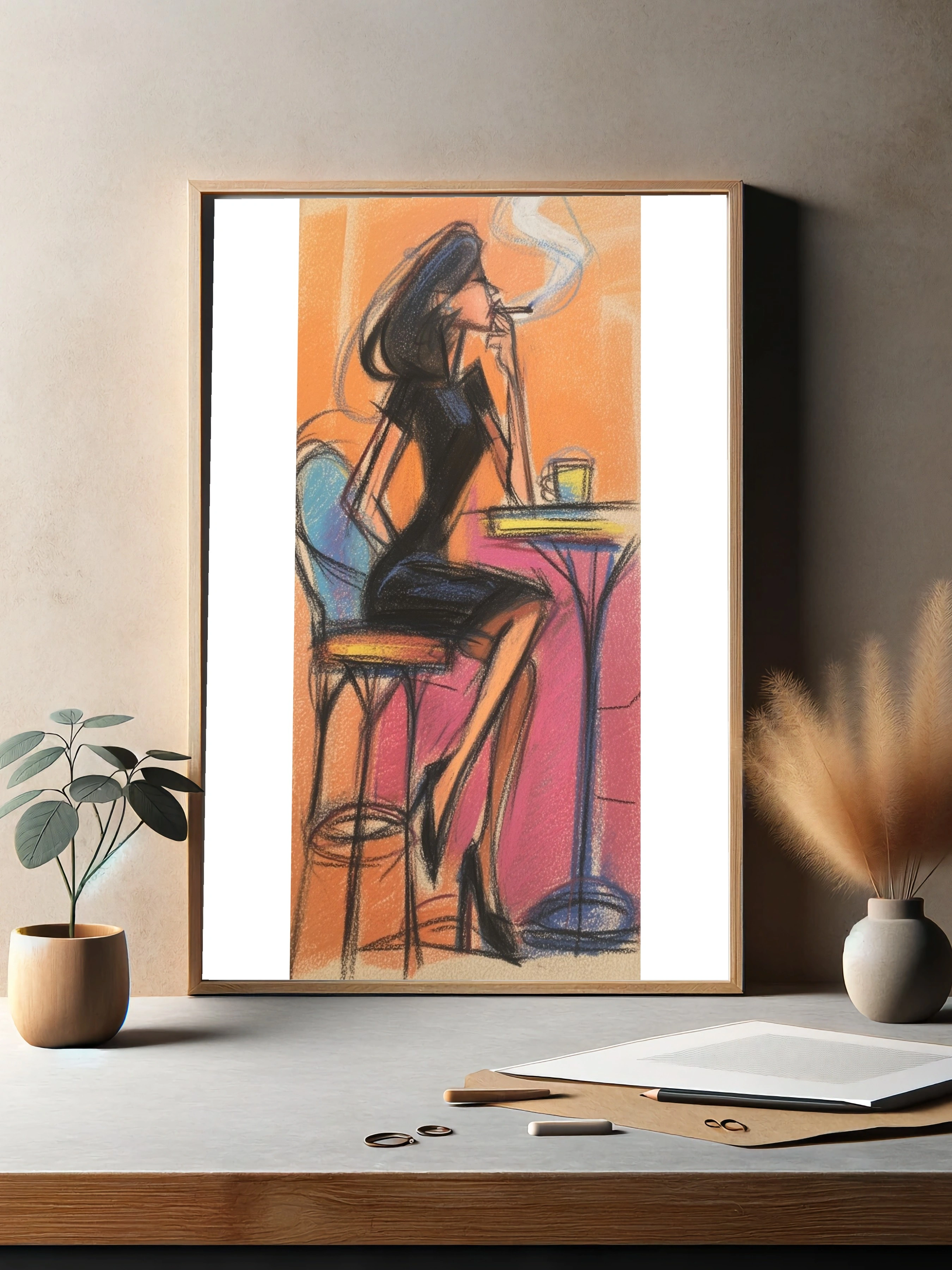 На этом постере изображена элегантная женщина, сидящая за столиком в кафе. Она одета в стильное черное платье, что подчеркивает её утонченность и уверенность. В одной руке она держит сигарету, из которой поднимается легкий дым, создавая атмосферу загадочности. На столе рядом с ней стоит чашка с горячим напитком, а также яркий стул с голубой спинкой, который добавляет яркий акцент в композицию. Фон выполнен в теплых оранжевых и розовых тонах, создавая уютное и расслабляющее настроение. Этот постер идеально впишется в интерьер гостиной или офисного пространства, добавляя нотку стиля и креативности. Он привлечет внимание молодежи и креативщиков, ценящих искусство и элегантность.