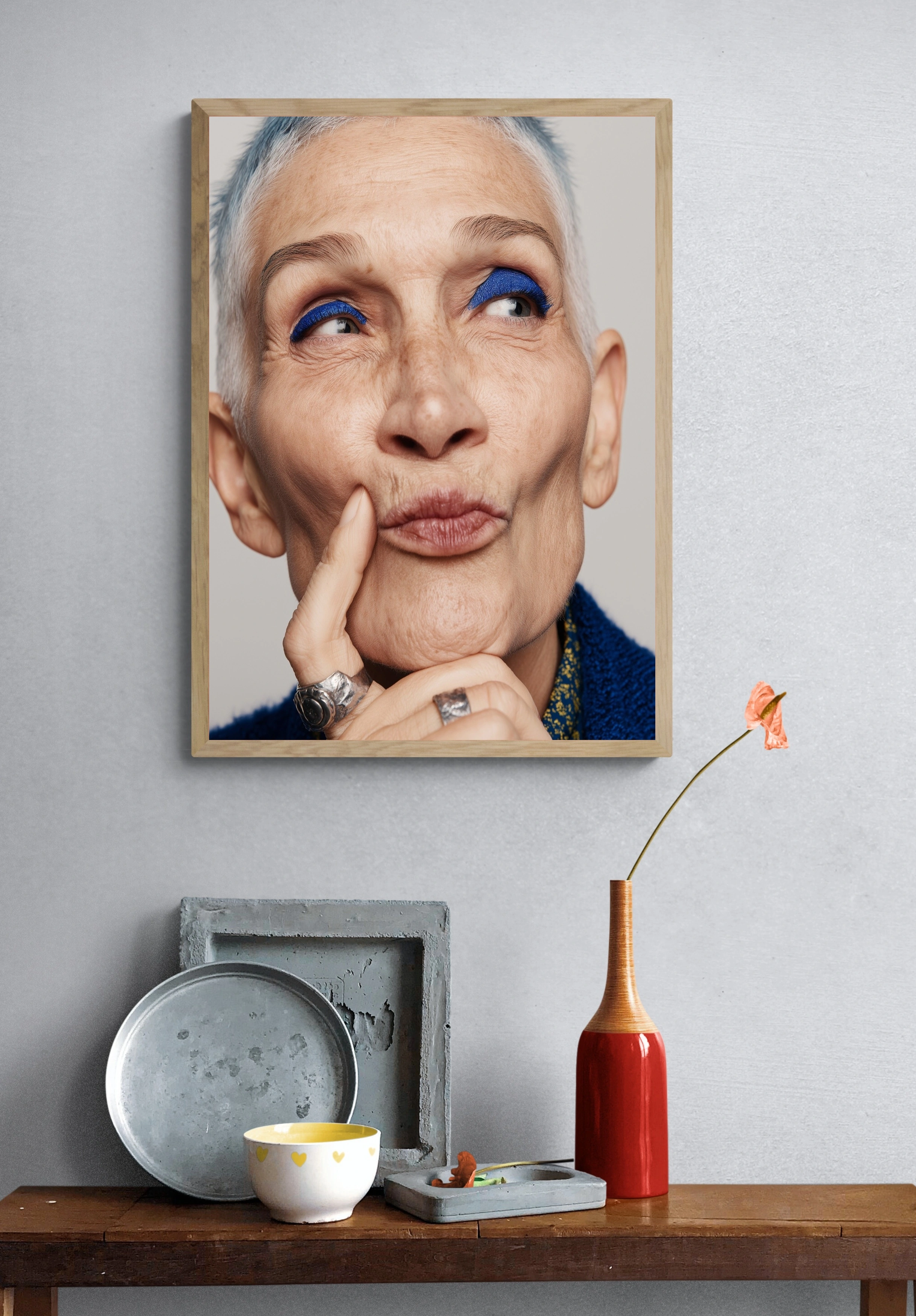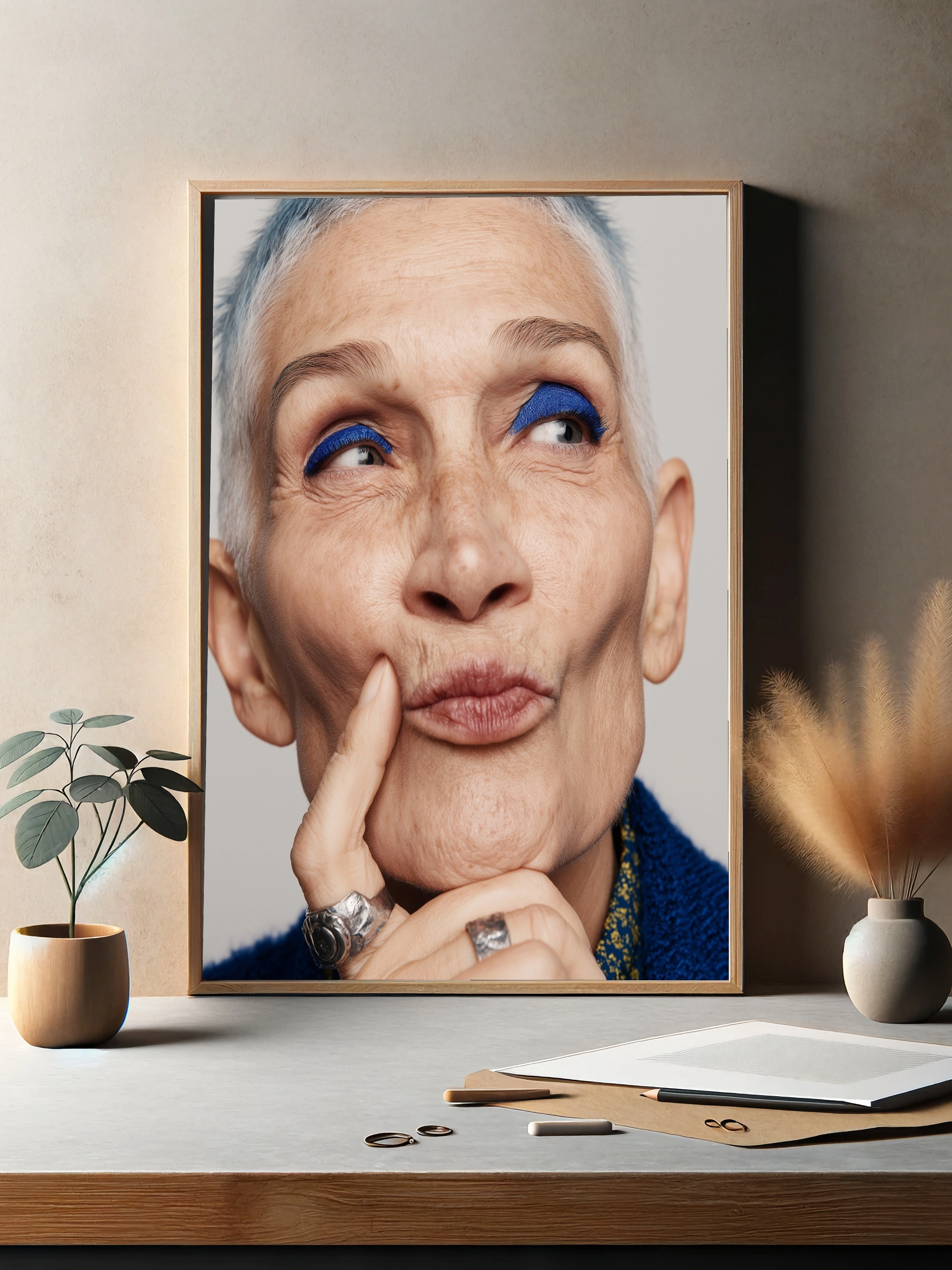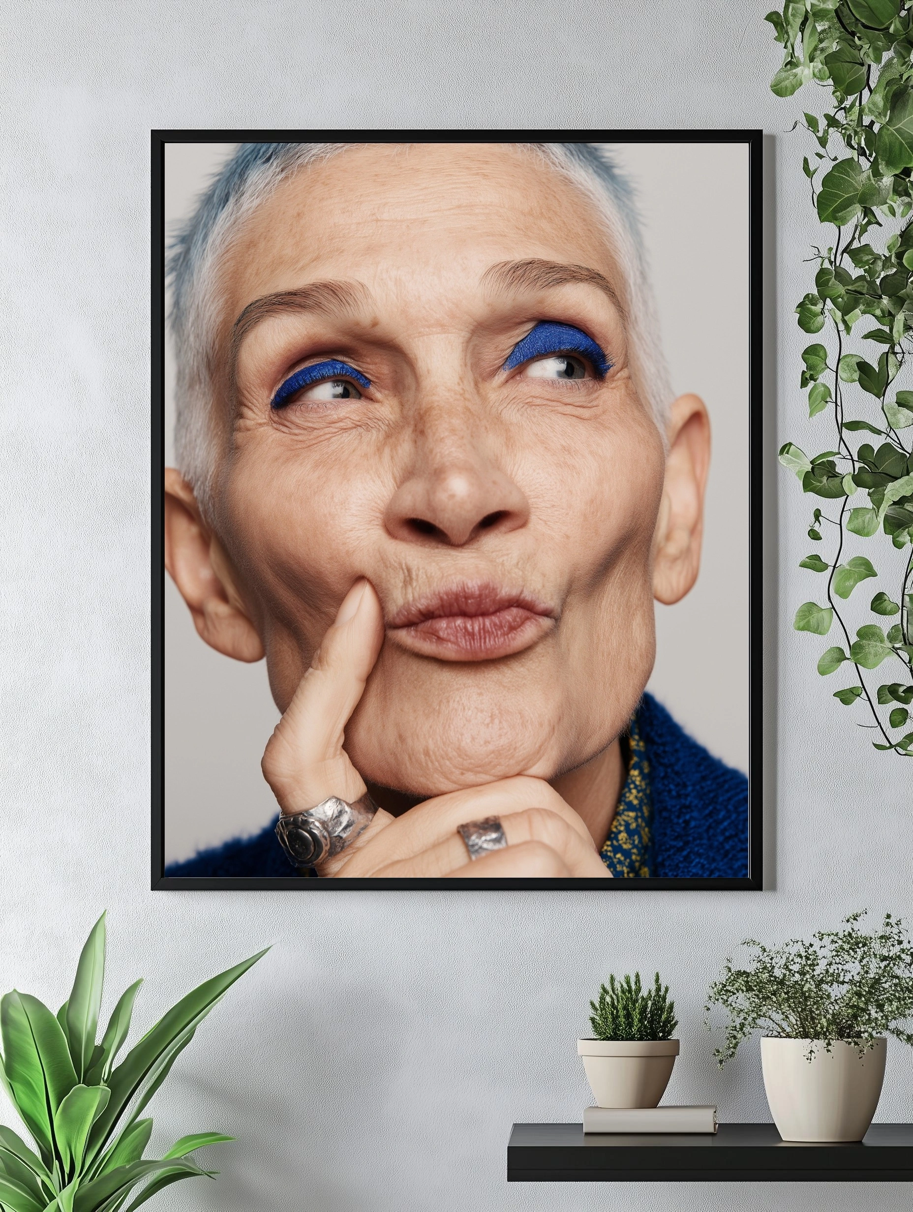 На этом постере изображена элегантная женщина с короткой серебристой стрижкой и ярким синим макияжем глаз, который привлекает внимание. Ее выразительное лицо с глубокими морщинами и тонкими чертами передает уверенность и жизненный опыт. Женщина задумчиво прикасается к щеке, что добавляет образу интриги и загадочности. Фон выполнен в нейтральных светлых тонах, что подчеркивает яркость макияжа и текстуру кожи. Этот постер в стиле современного портрета идеально впишется в интерьер гостиной или офиса, добавляя нотку креативности и стиля. Он станет отличным выбором для молодежной аудитории и креативщиков, ценящих индивидуальность и самовыражение.