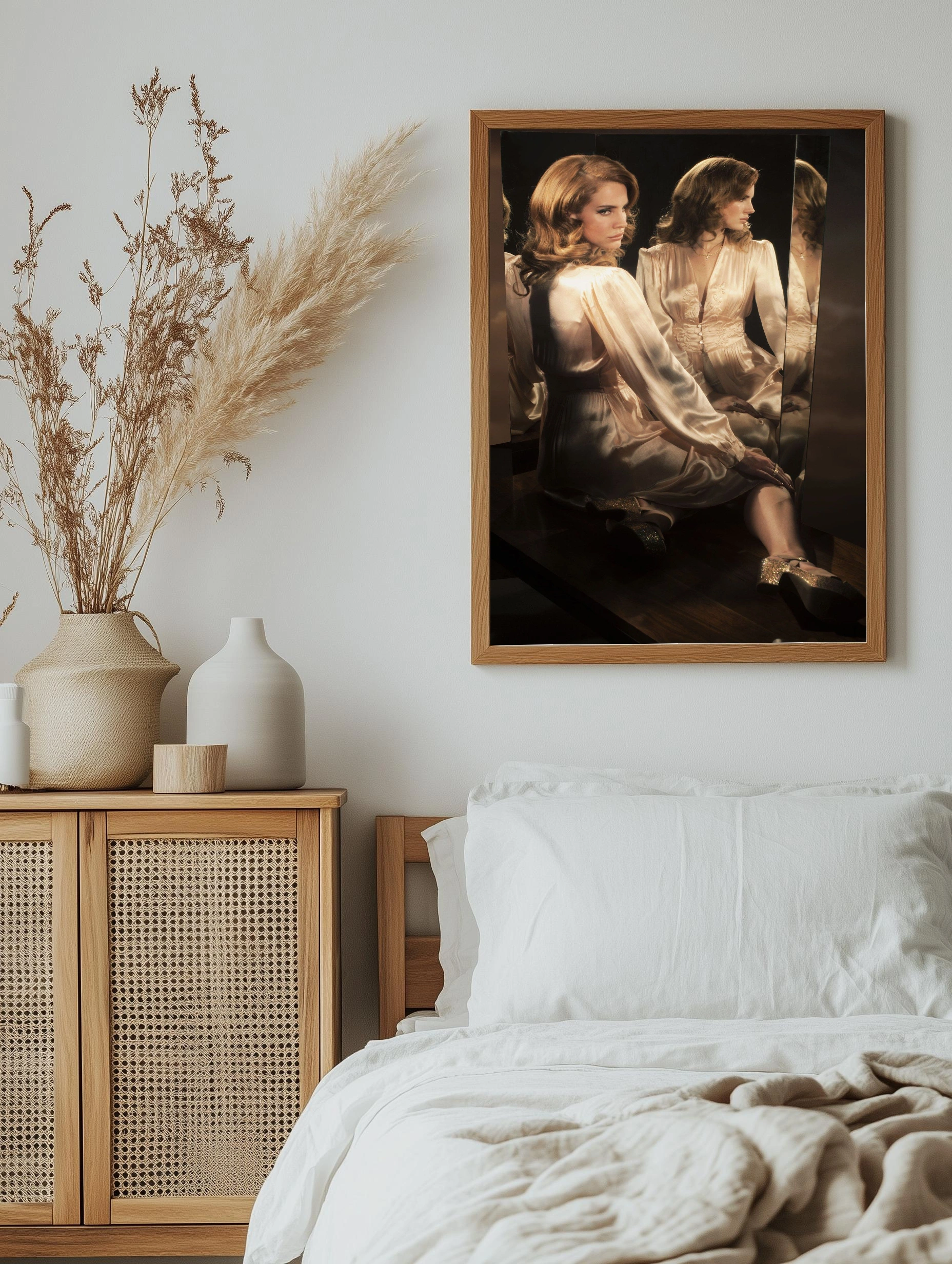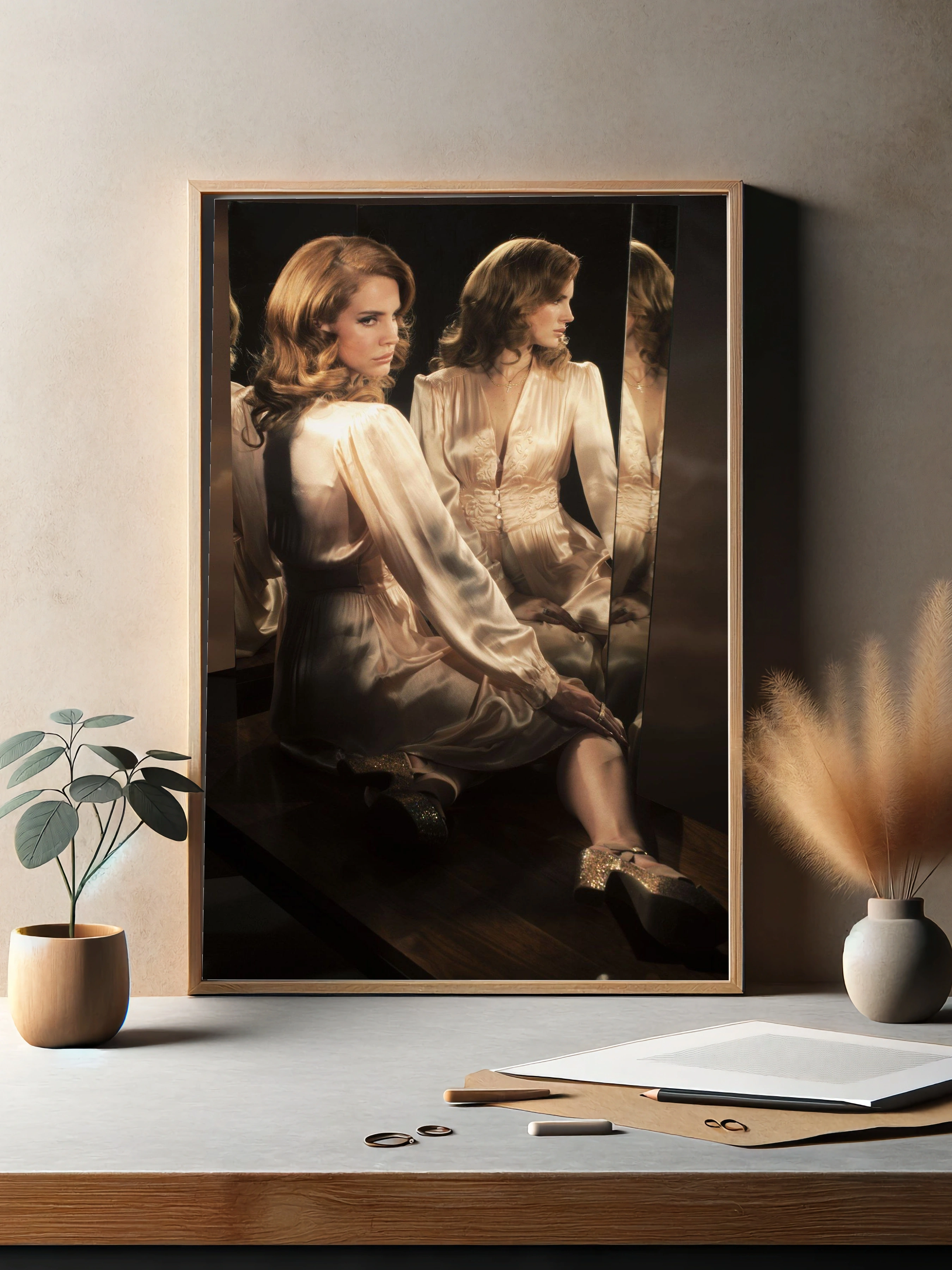 На изображении запечатлена женщина в светлом, шелковистом платье, сидящая перед несколькими зеркалами, создающими множество отражений. Картина выполнена в нежных золотисто-бежевых тонах с теплым освещением, что подчеркивает мягкость тканей и утонченность образа. Это современное искусство для стен, которое идеально подойдет в качестве декоративного плаката или интерьерного постера, добавляя стильный декор стен в спальню, гостиную или офис.