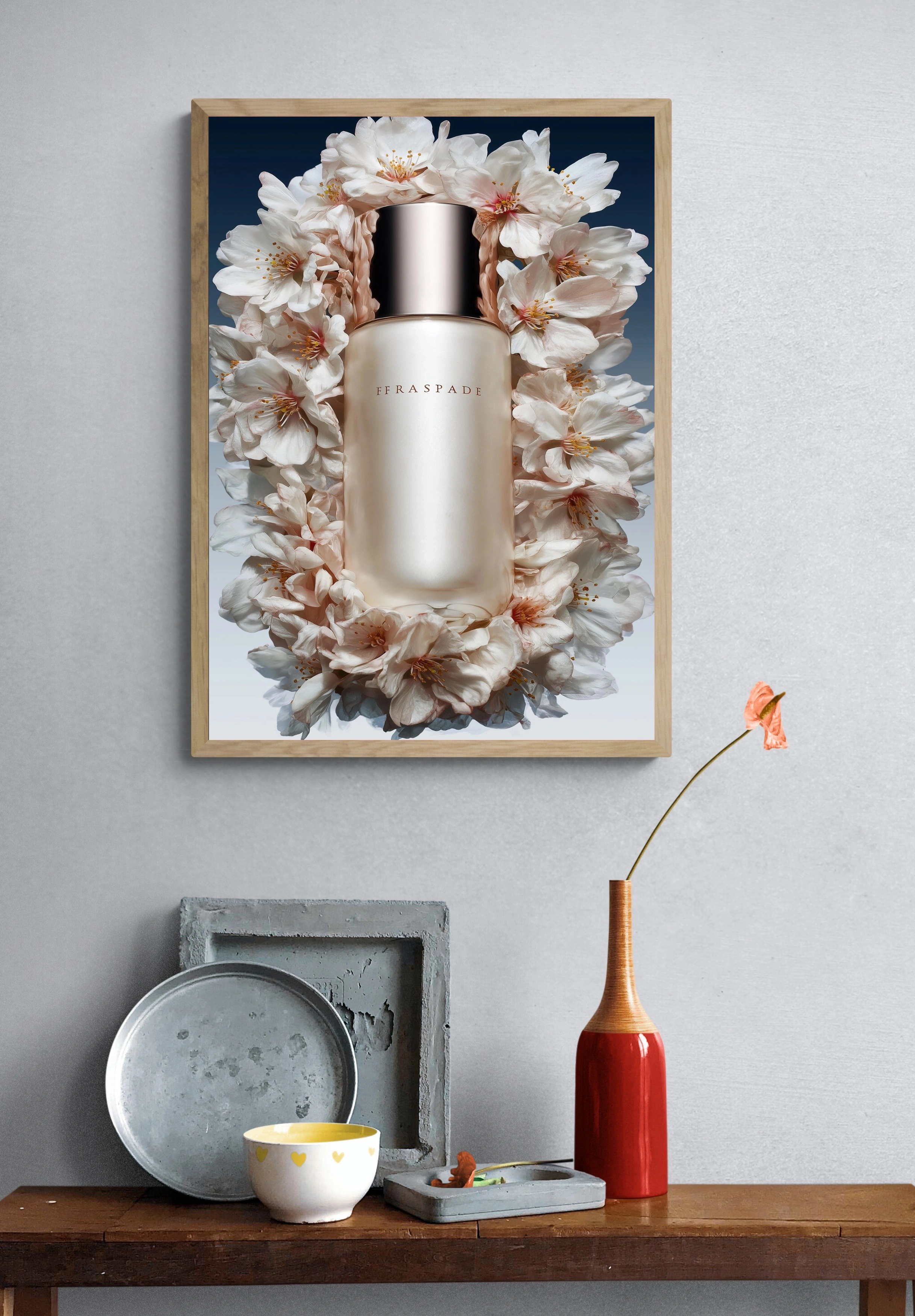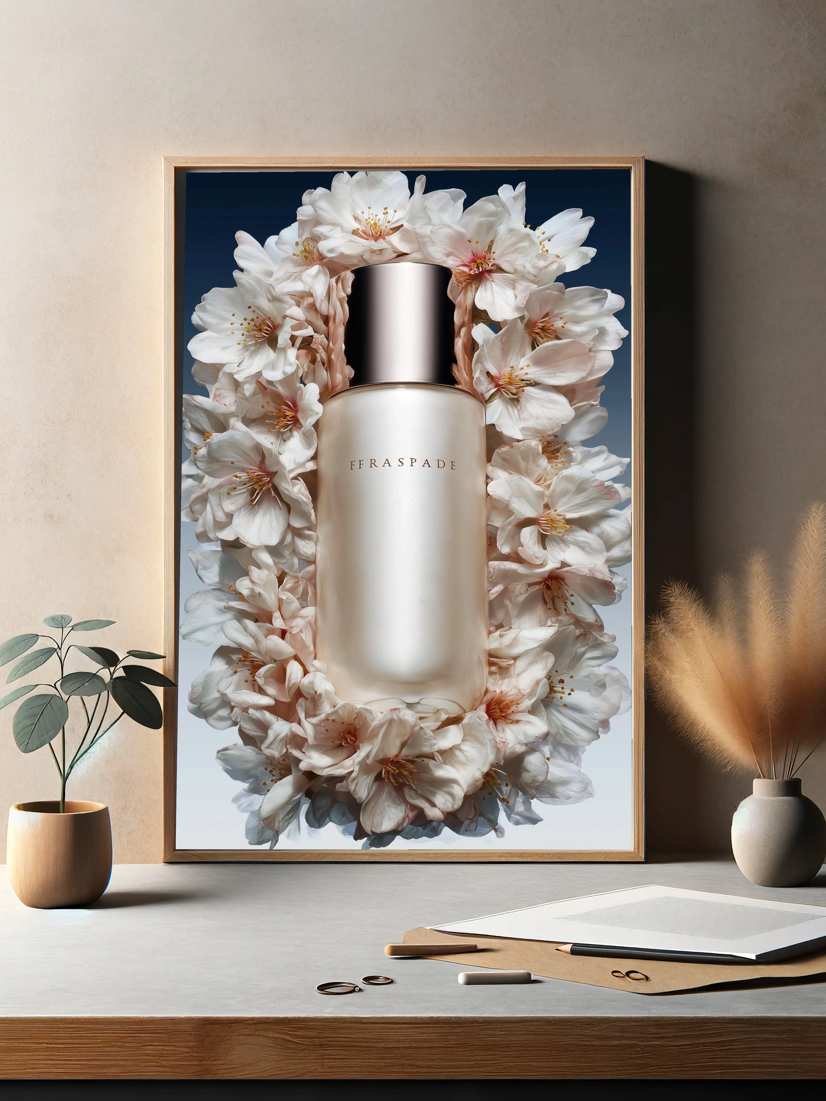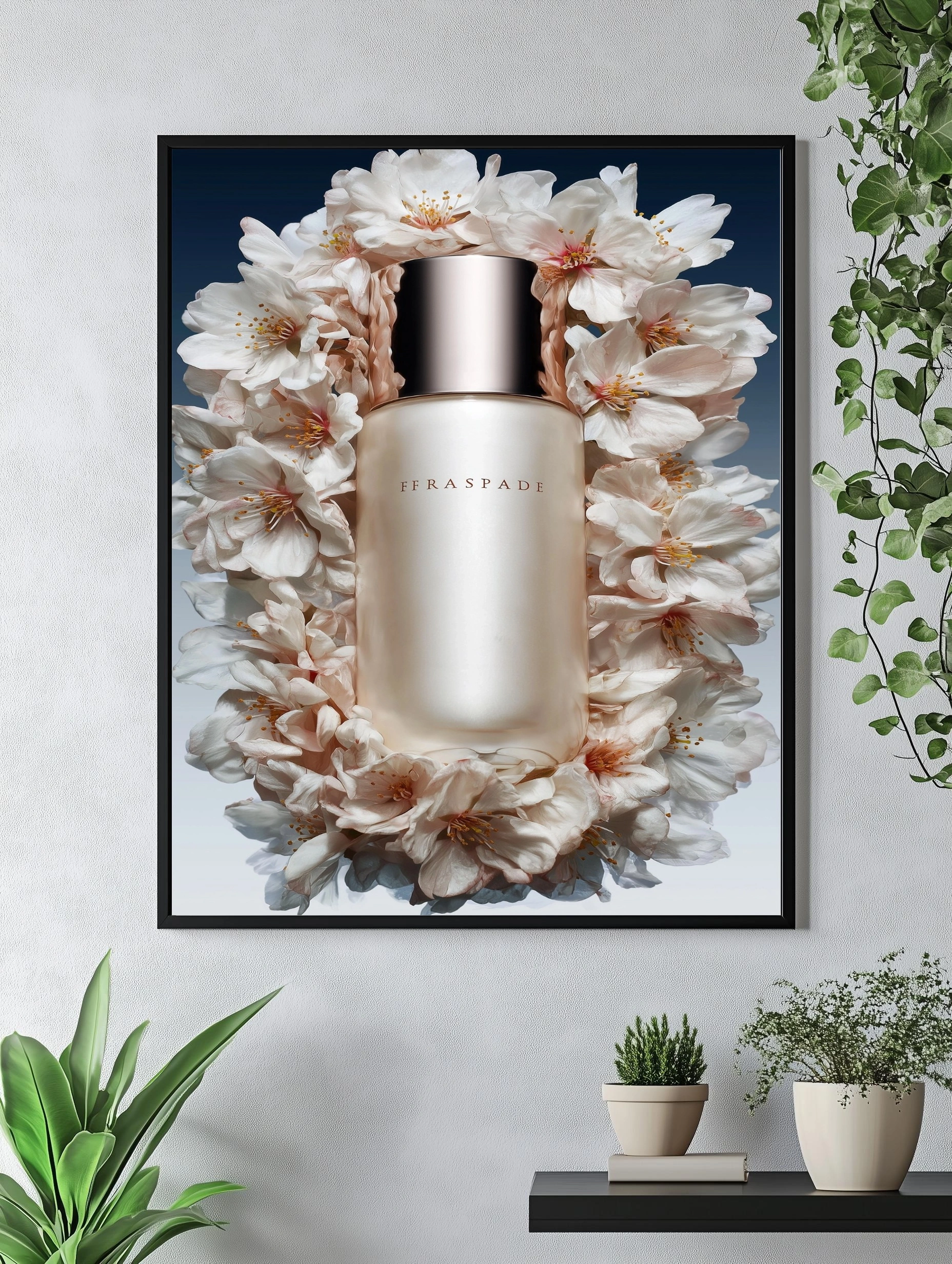 Этот изысканный постер представляет собой великолепный флакон парфюма FFRASPADA, окруженный нежными цветами вишни. Флакон с гладкой, слегка перламутровой поверхностью и золотистым колпачком привлекает внимание своей утонченной простотой. Цветы, в основном белые с легким розовым оттенком, создают романтичную и свежую атмосферу, подчеркивая элегантность продукта. Нежные лепестки и яркие тычинки добавляют живости и текстуры, создавая эффект цветочного венка. Постер выполнен в минималистичном стиле, что делает его идеальным акцентом для спальни, ванной или парфюмерного уголка. Он будет привлекателен для молодежи и любителей красоты, стремящихся добавить нотку изысканности в свой интерьер.