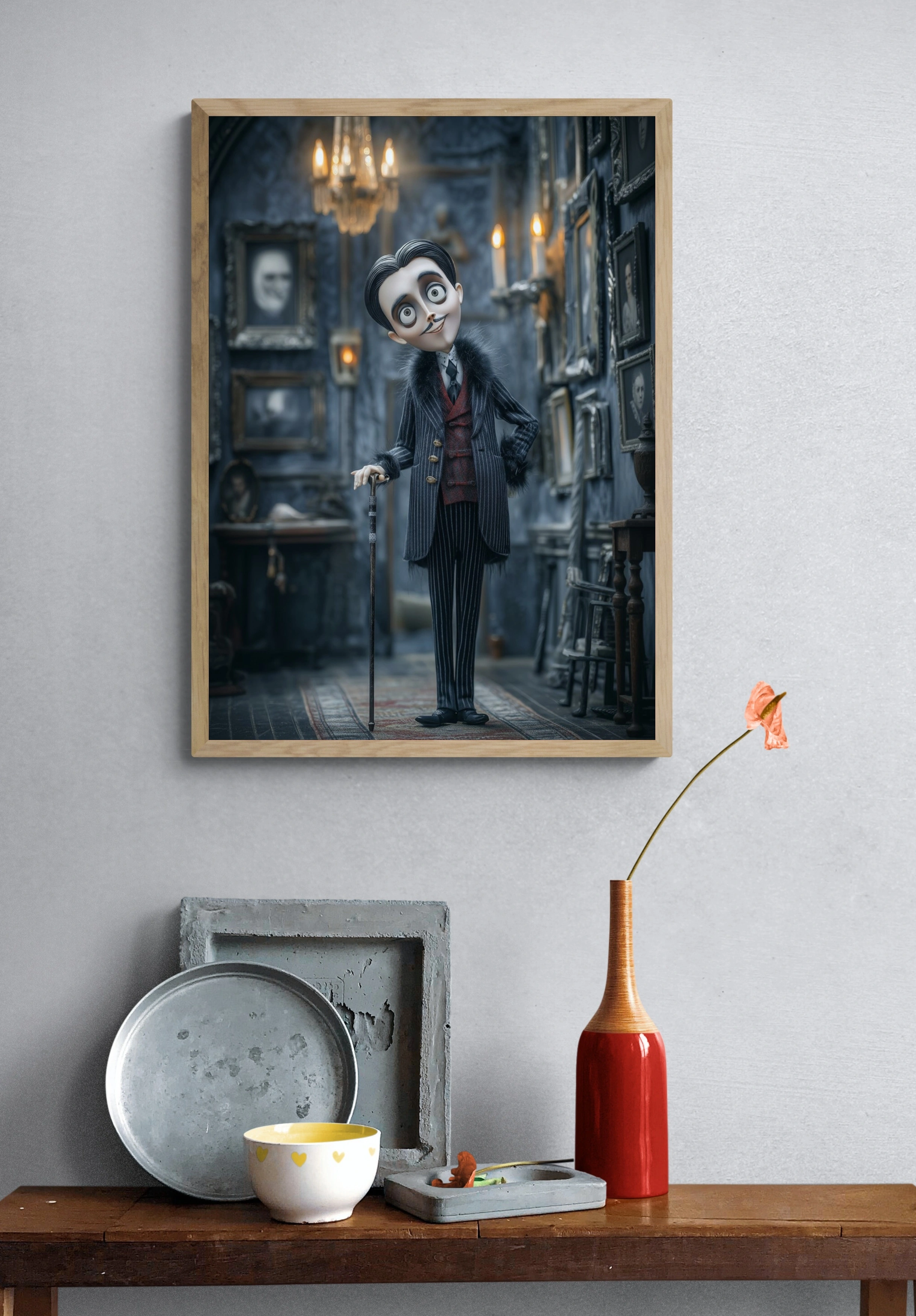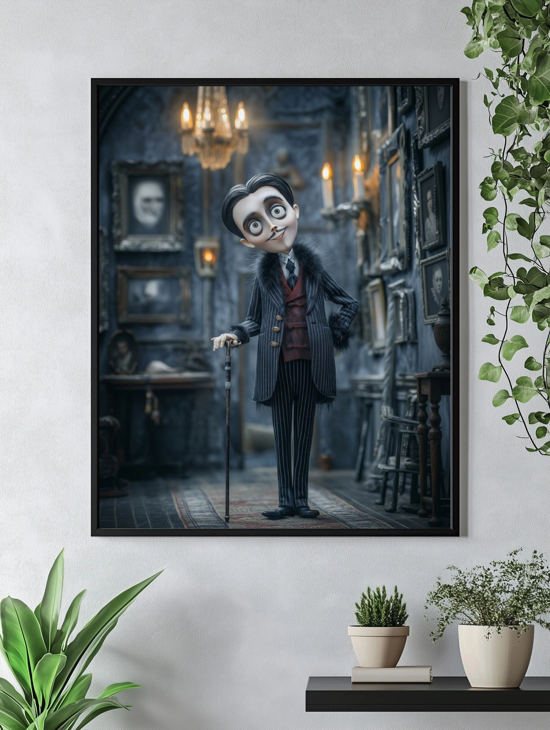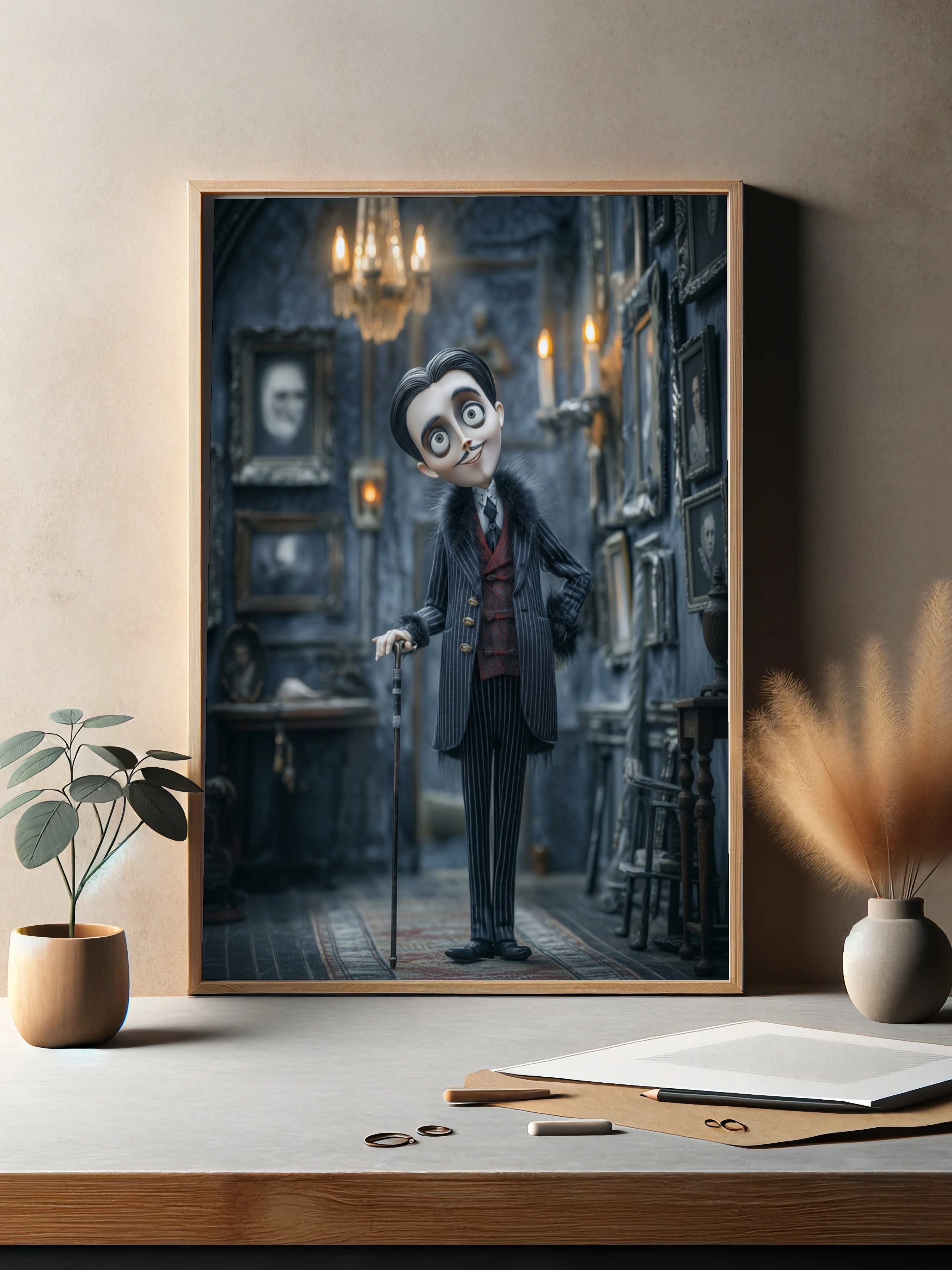 Погрузитесь в атмосферу загадки и элегантности с этим уникальным постером, на котором изображён стильный персонаж в готическом интерьере. Он стоит в центре комнаты, облачённый в строгий полосатый костюм с красным жилетом и меховыми акцентами. Его выразительные глаза и улыбка создают интригующее впечатление. На заднем плане видны старинные портреты в ornate рамках, а мягкий свет от свечей и люстры придаёт сцене таинственность. Цветовая гамма включает глубокие оттенки серого и черного, а также яркие акценты красного. Этот постер станет идеальным дополнением для гостиной или кабинета, привнося в пространство нотки креативности и стиля. Он привлечёт внимание молодежи и любителей необычного искусства.
