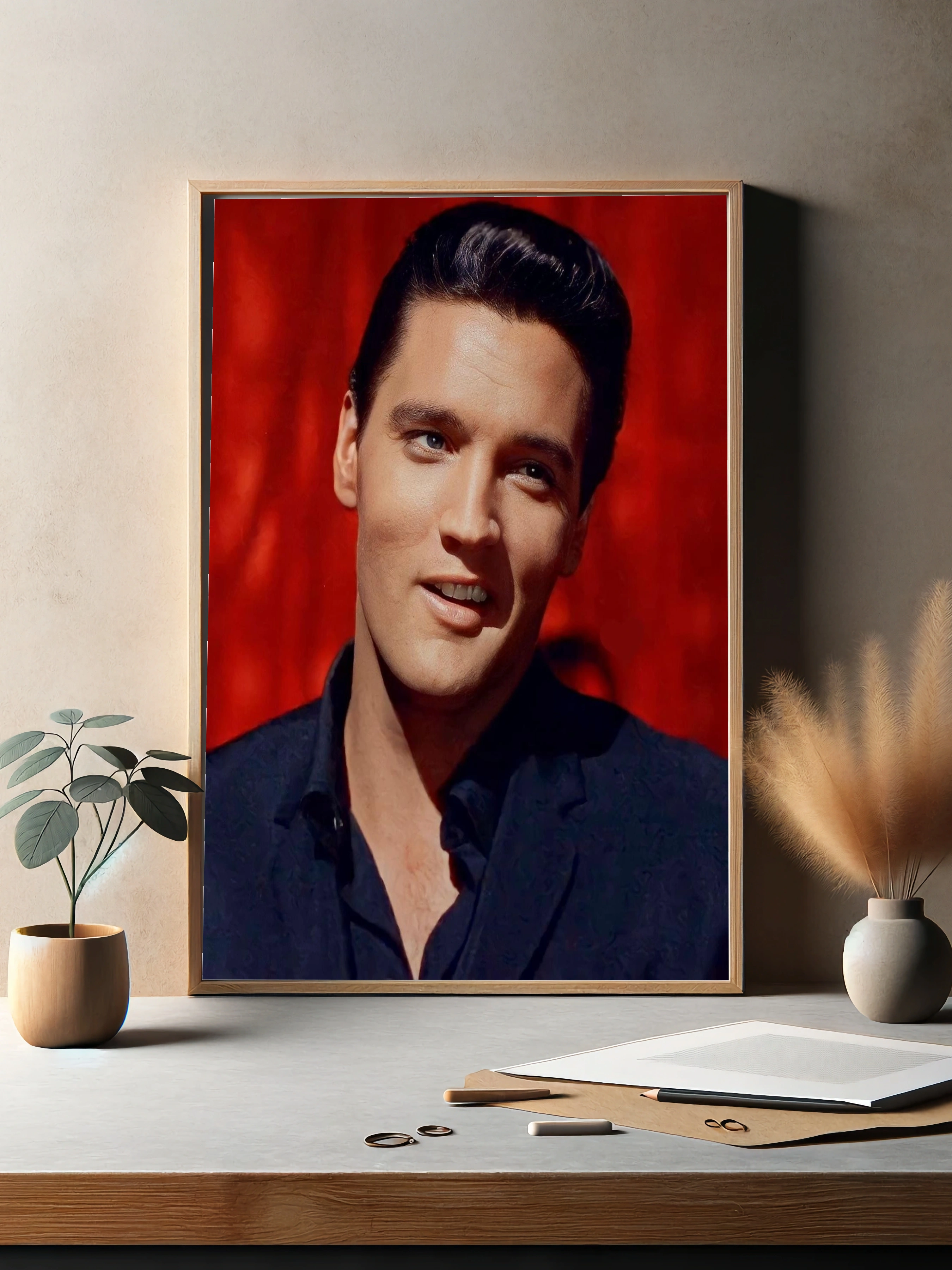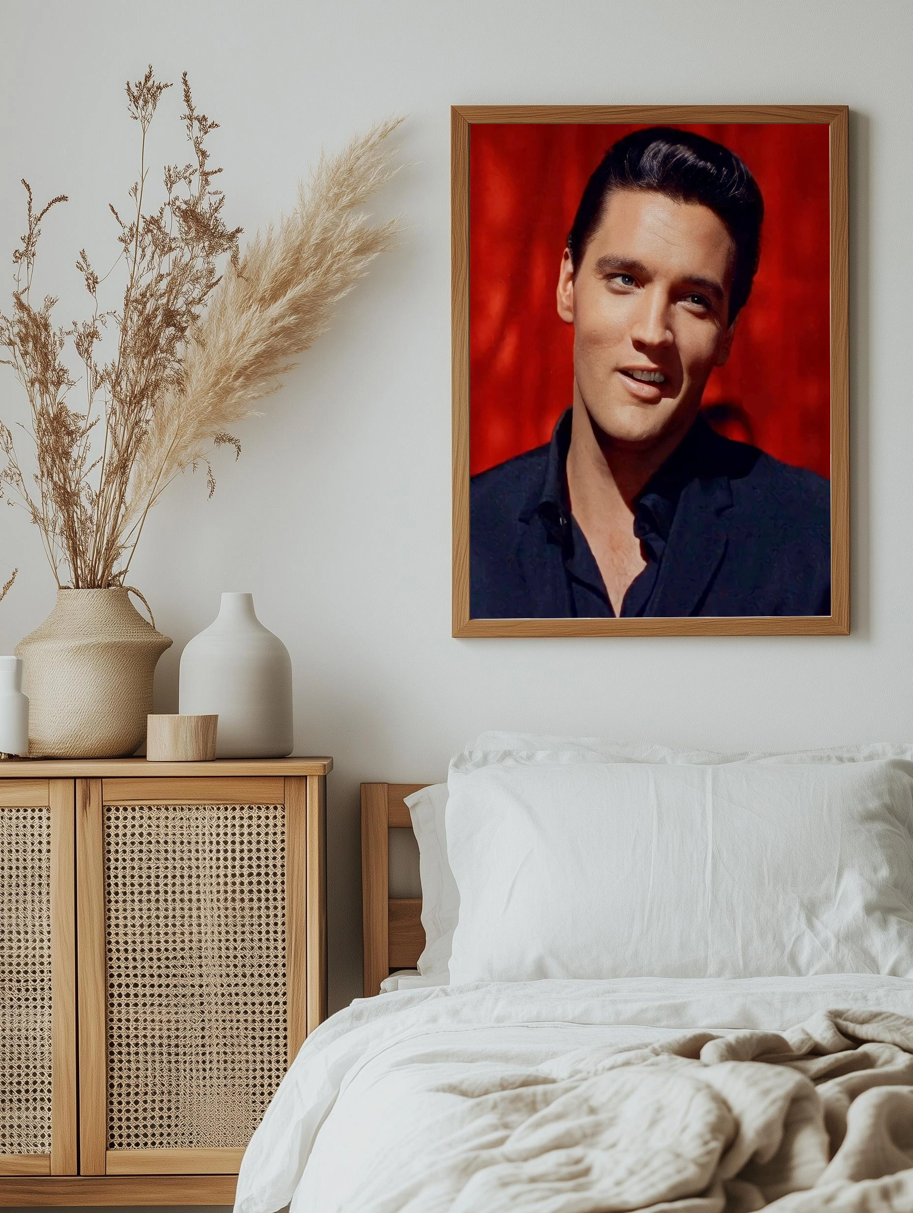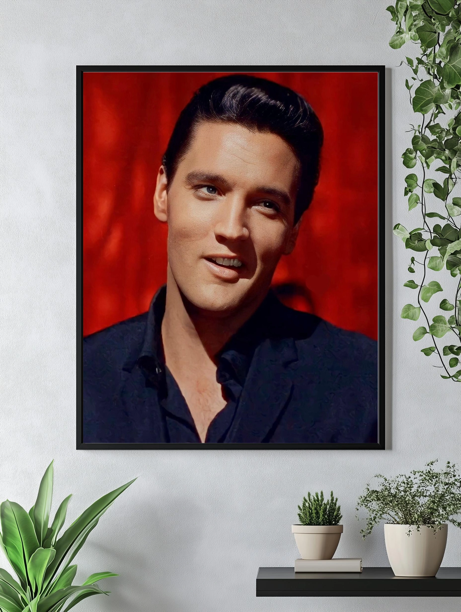 На изображении представлен портрет Элвиса Пресли — культового певца и актера, символа рок-н-ролла 1950-60-х годов. Он изображен на красном фоне, одет в темную рубашку и пиджак, с характерной прической и выразительной улыбкой. Этот интерьерный художественный плакат идеально впишется в гостиную или офис, добавляя стильный декор стен и атмосферу музыкальной эпохи.