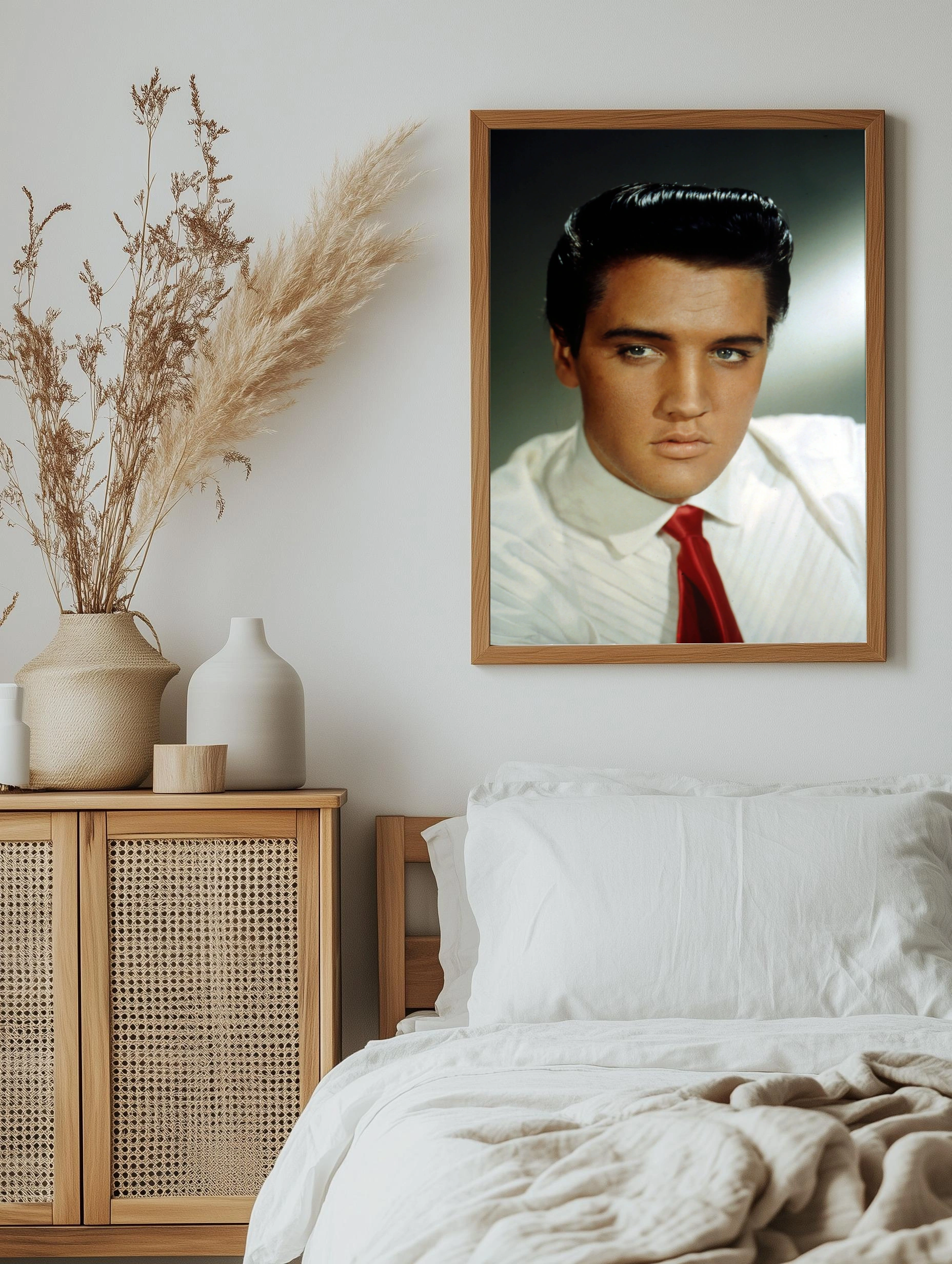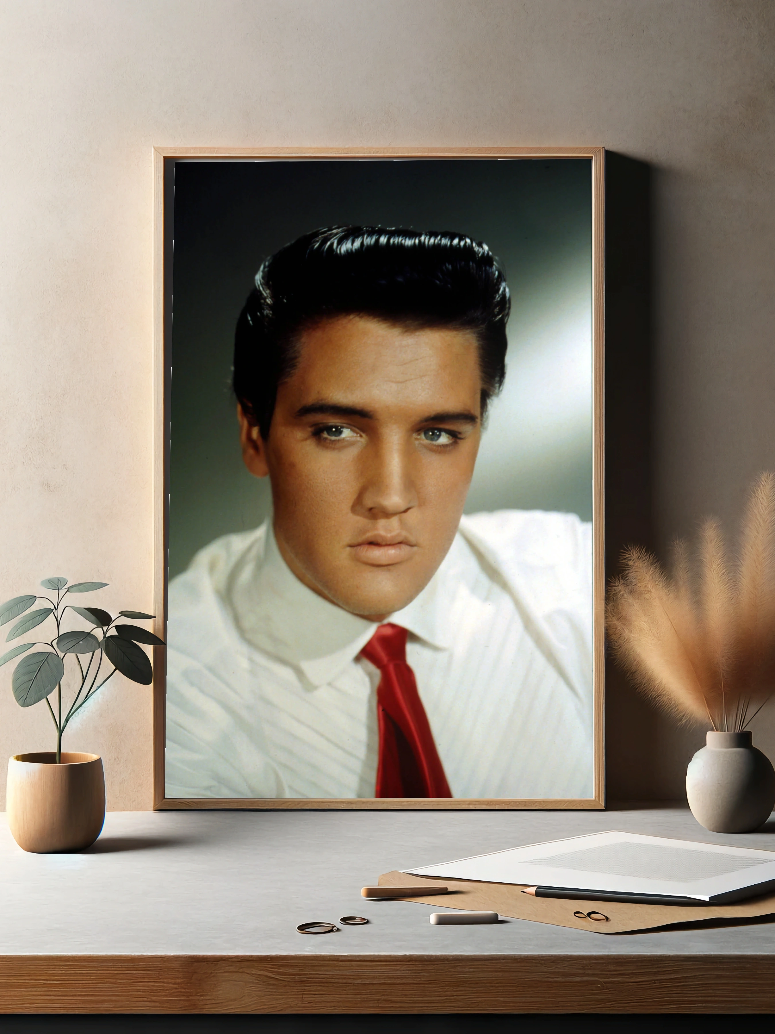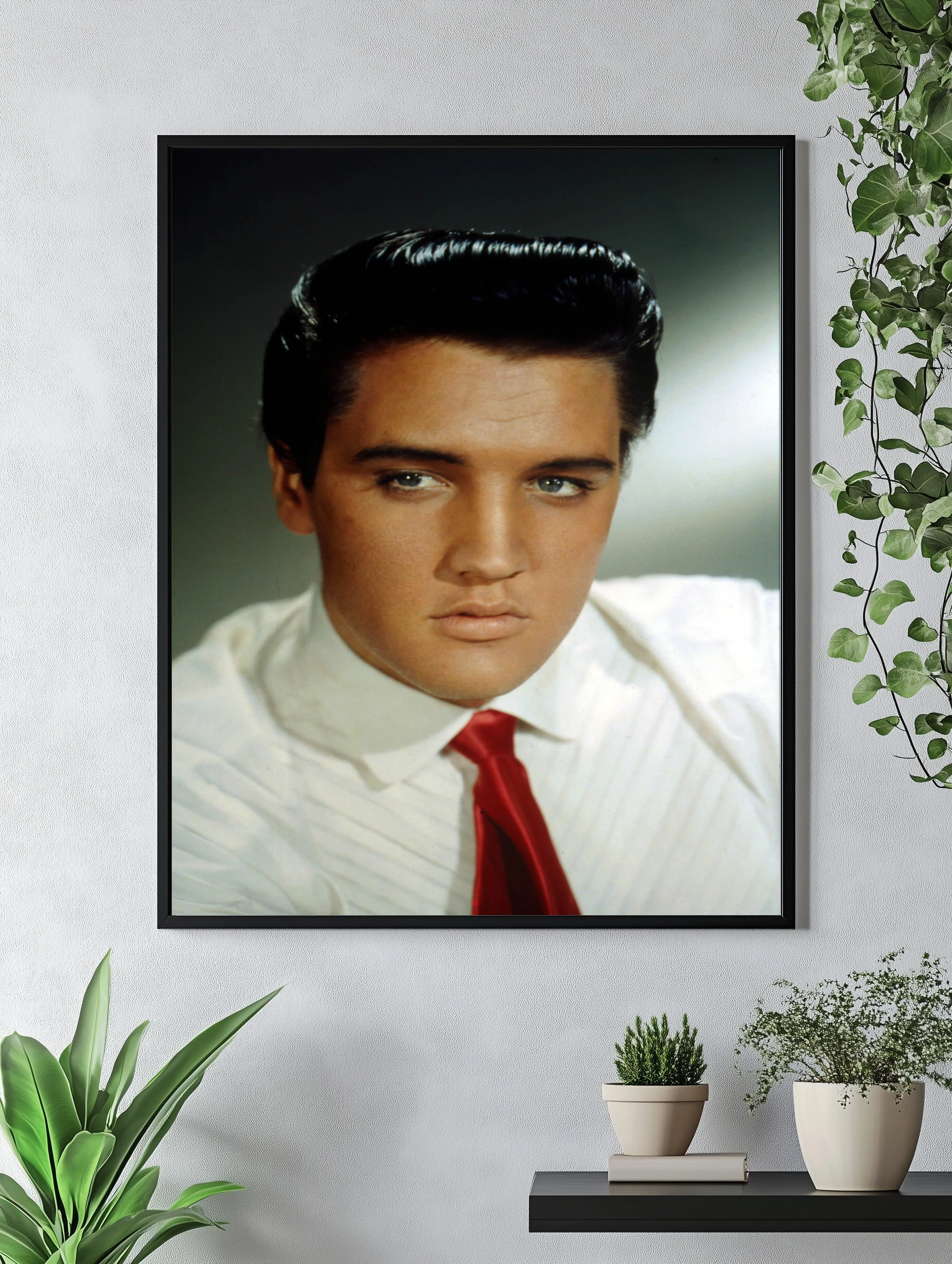 На изображении представлен портрет легендарного певца Элвиса Пресли, символа рок-н-ролла 50-х годов. Фотография выполнена в классическом стиле, с акцентом на его узнаваемые черты — аккуратно уложенные волосы, выразительные глаза и красный галстук на белой рубашке. Это стильный декоративный плакат, идеально подходящий для интерьера, который подчеркнёт музыкальное и культурное наследие Элвиса.