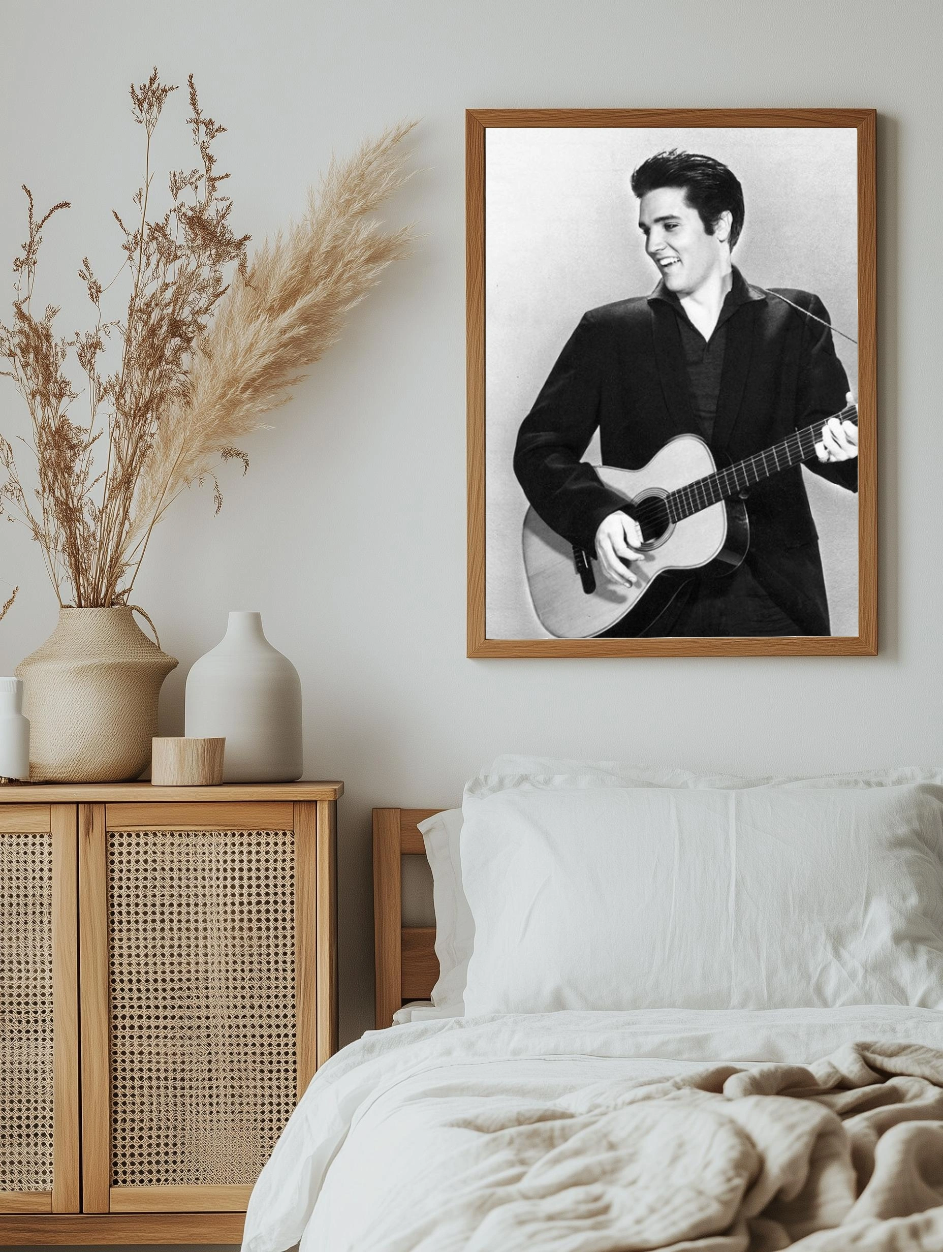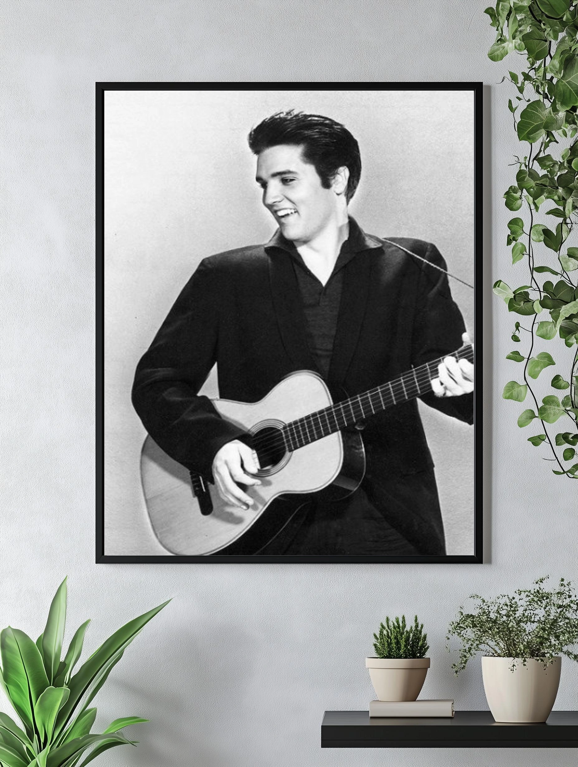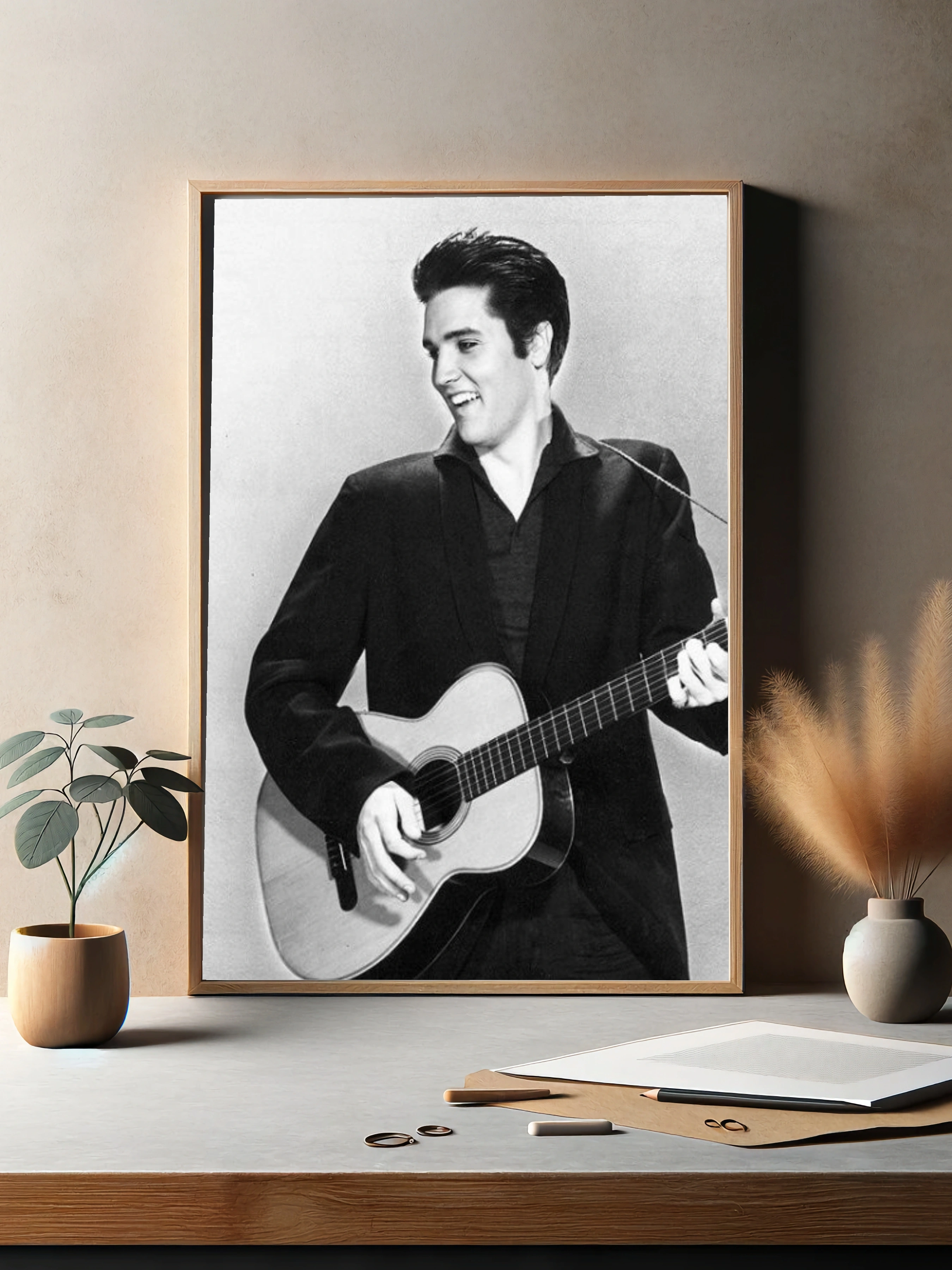 Черно-белая фотография Элвиса Пресли с гитарой — культовый образ короля рок-н-ролла. Этот интерьерный арт с выразительной позой и энергией эпохи 1950-х станет стильным декором для гостиной или офиса. Идеально для поклонников музыкальной истории и уникального искусства для стен.