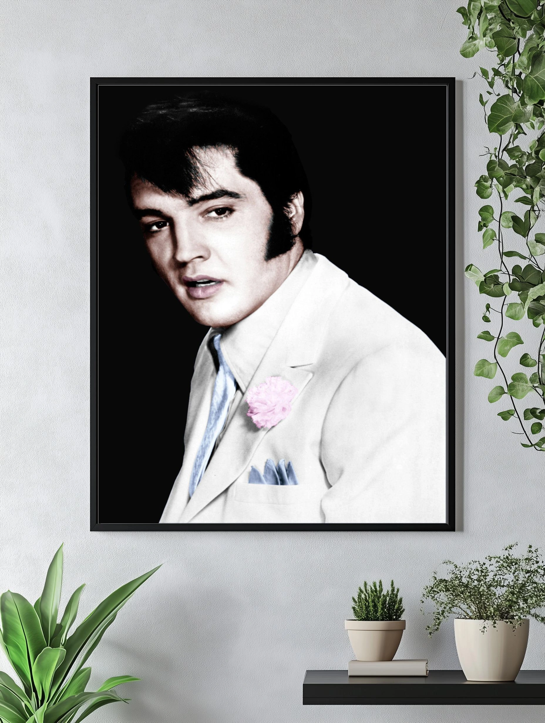 Стильный интерьерный постер с портретом Элвиса Пресли — легенды рок-н-ролла. Чёрный фон подчёркивает яркий белый костюм и нежные акценты розового цветка и голубого платка. Этот художественный плакат станет уникальным декоративным элементом для спальни, гостиной или офиса.