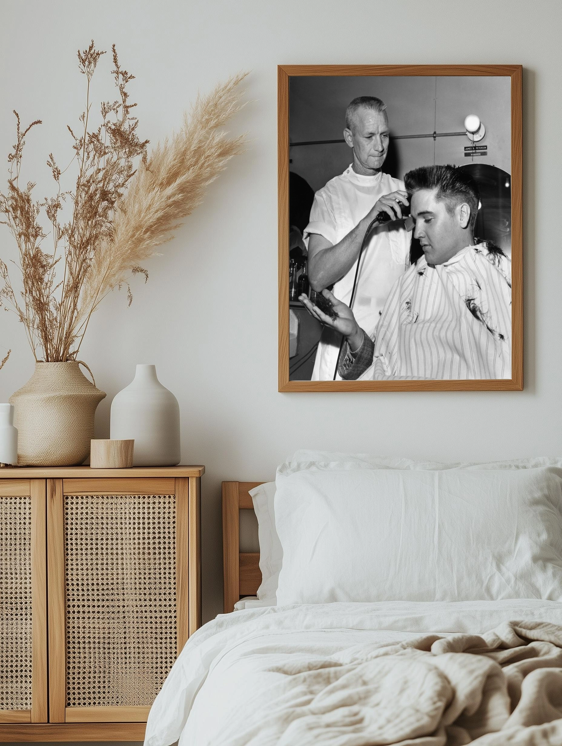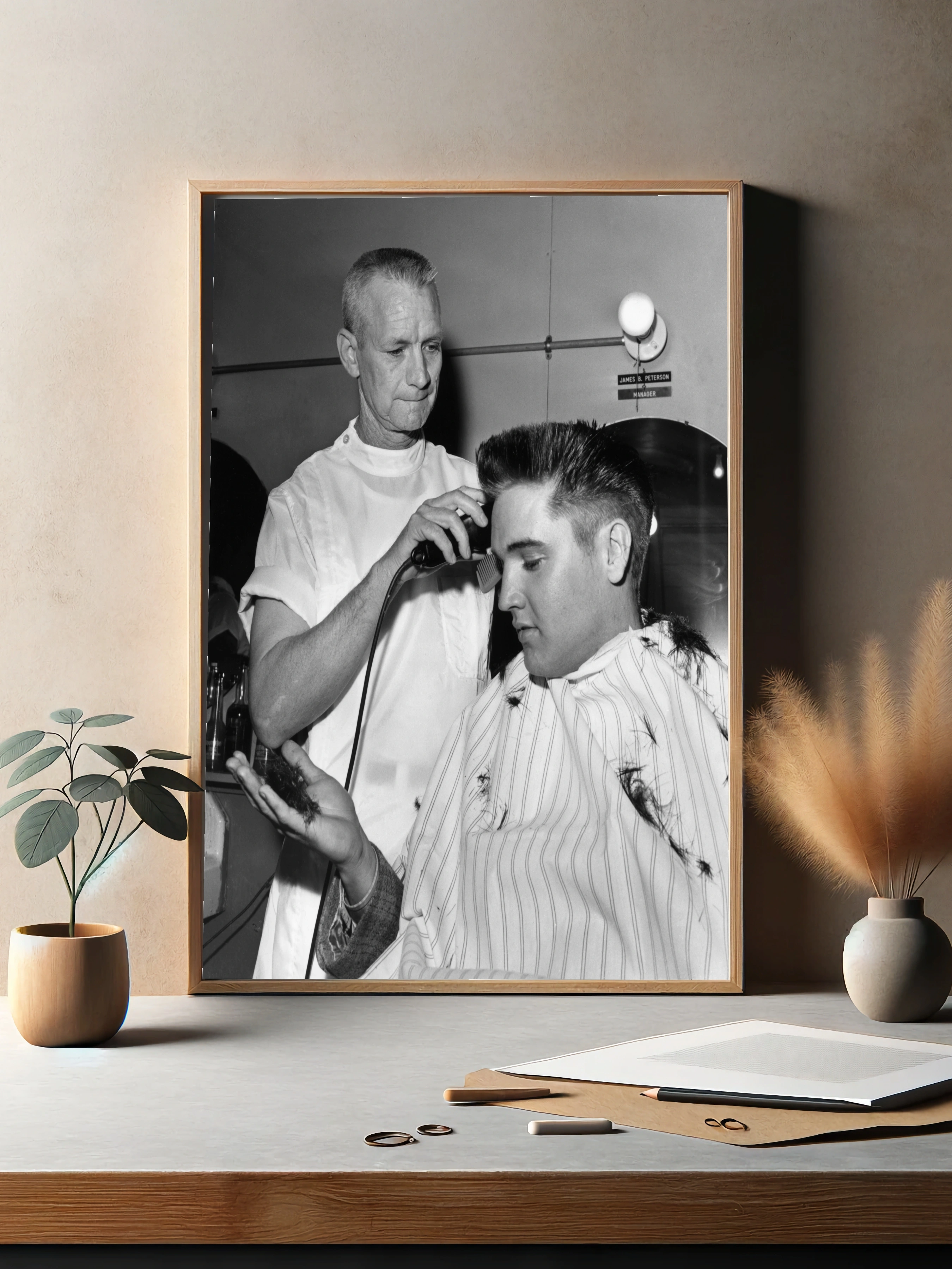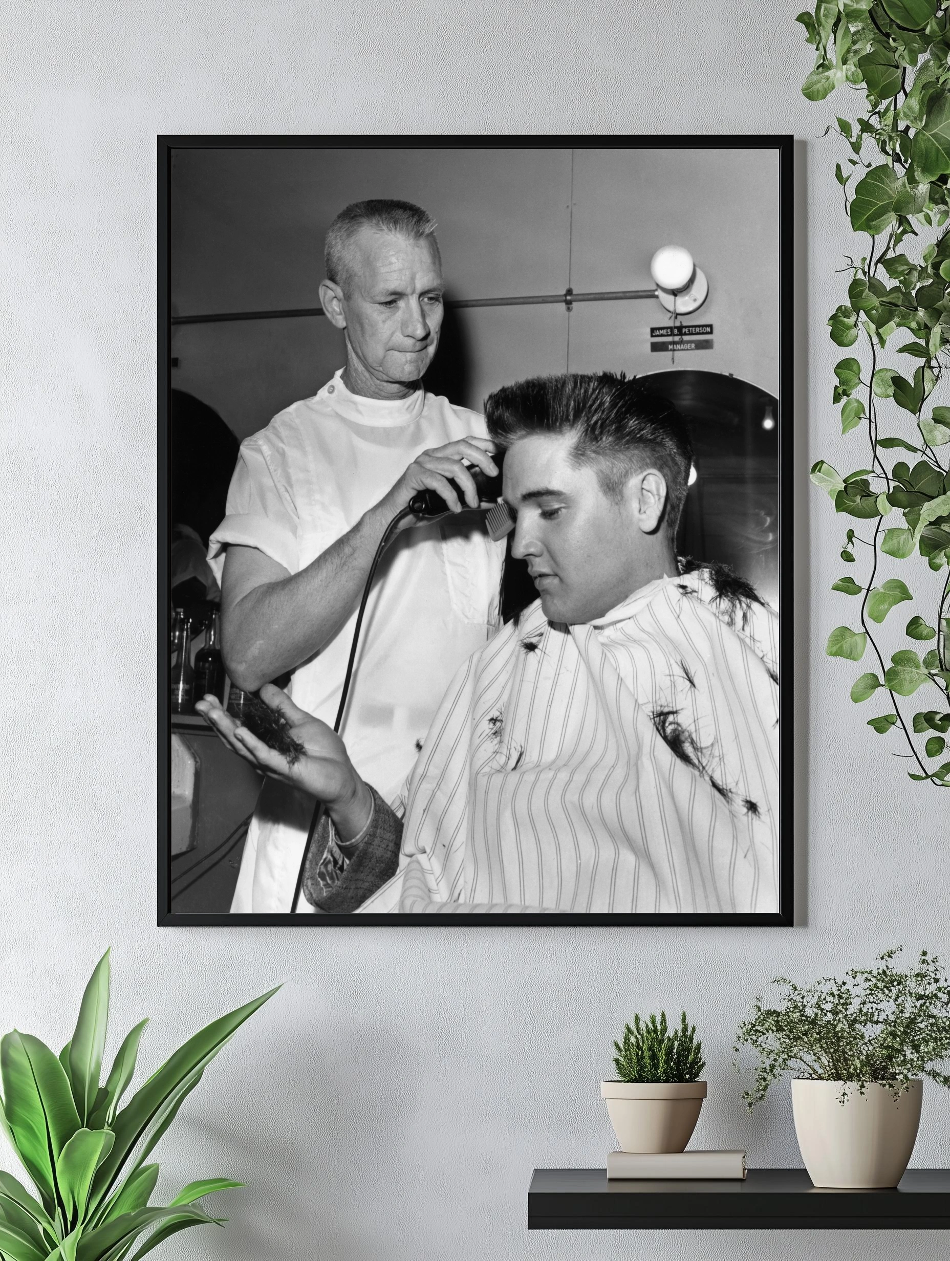 Чёрно-белое фото запечатлевает момент стрижки молодого Элвиса Пресли в классической барберской атмосфере 1950-х годов. Оператор аккуратно стрижет прическу знаменитого певца, накидка с волосами и зеркала вокруг создают аутентичную, стильную композицию. Идеально для декоративного оформления интерьера, особенно гостиной или офиса.