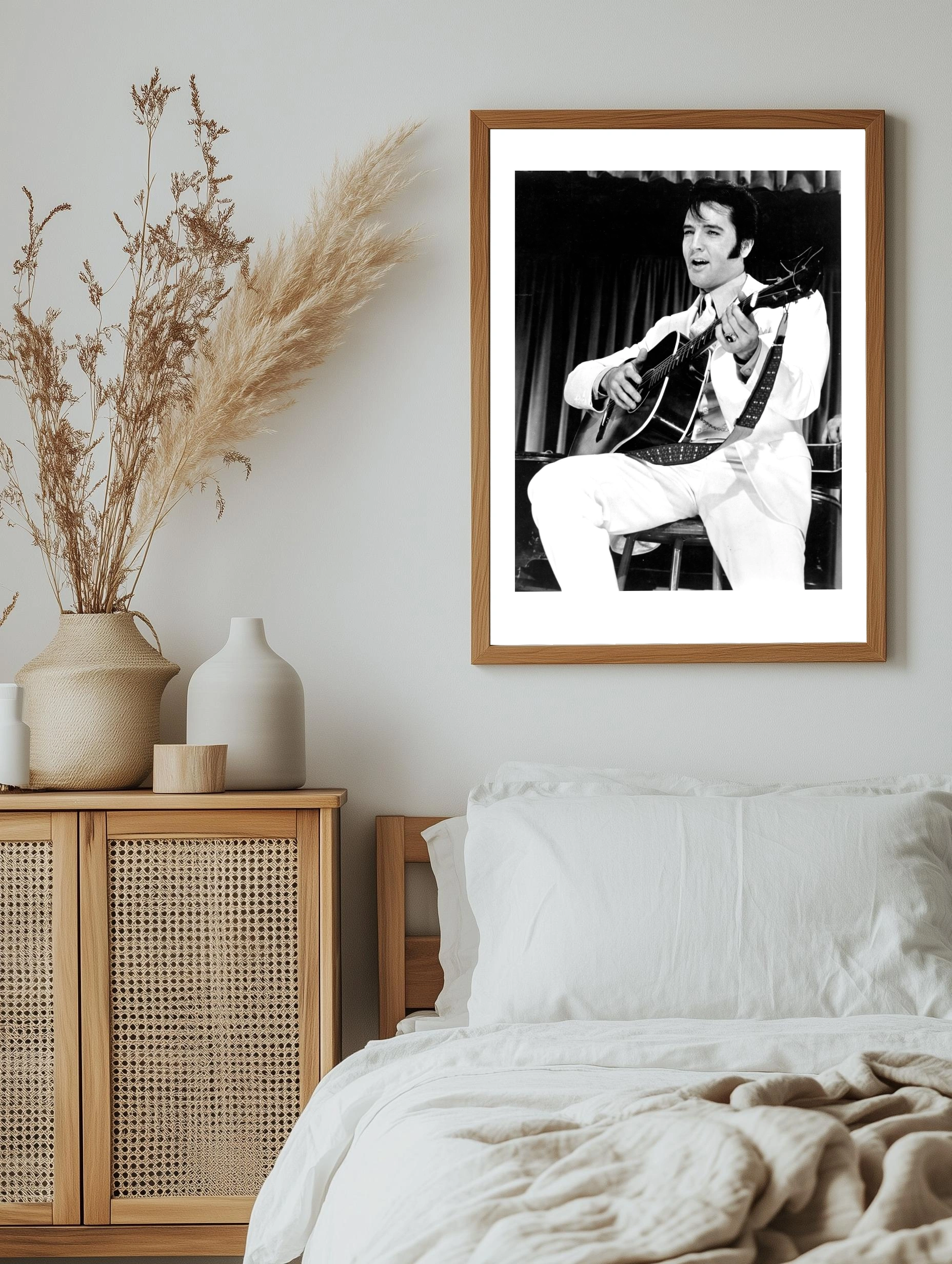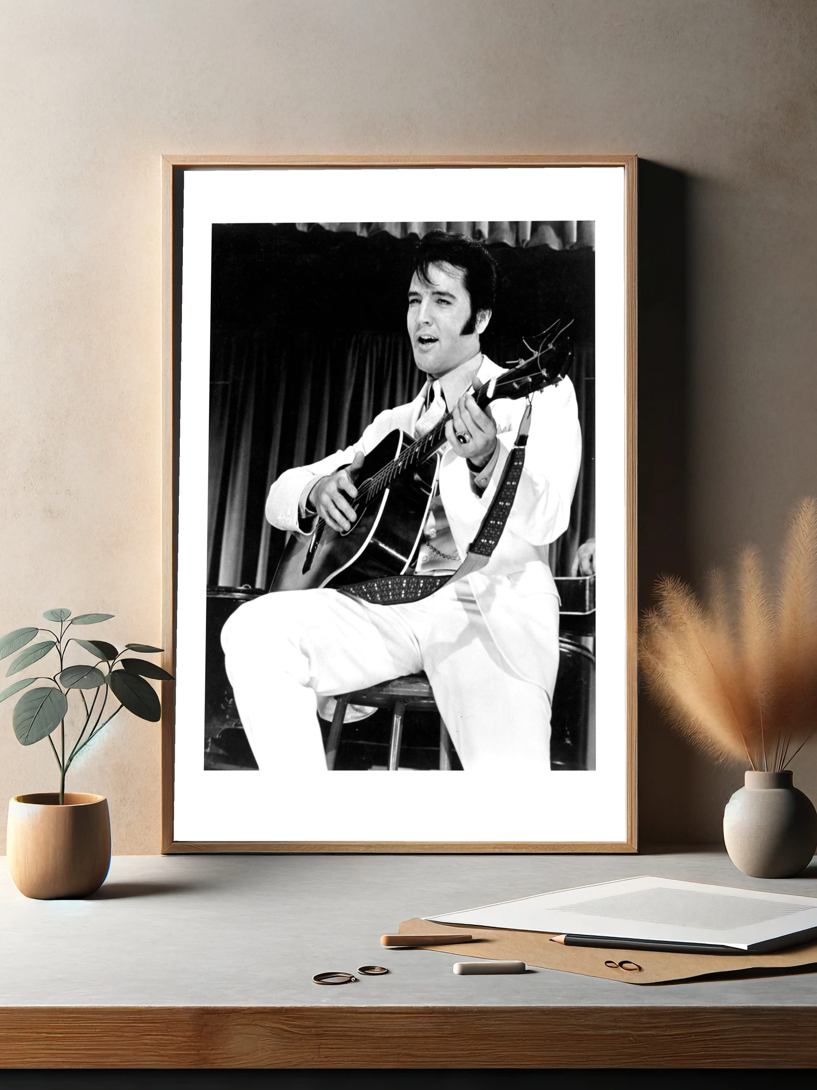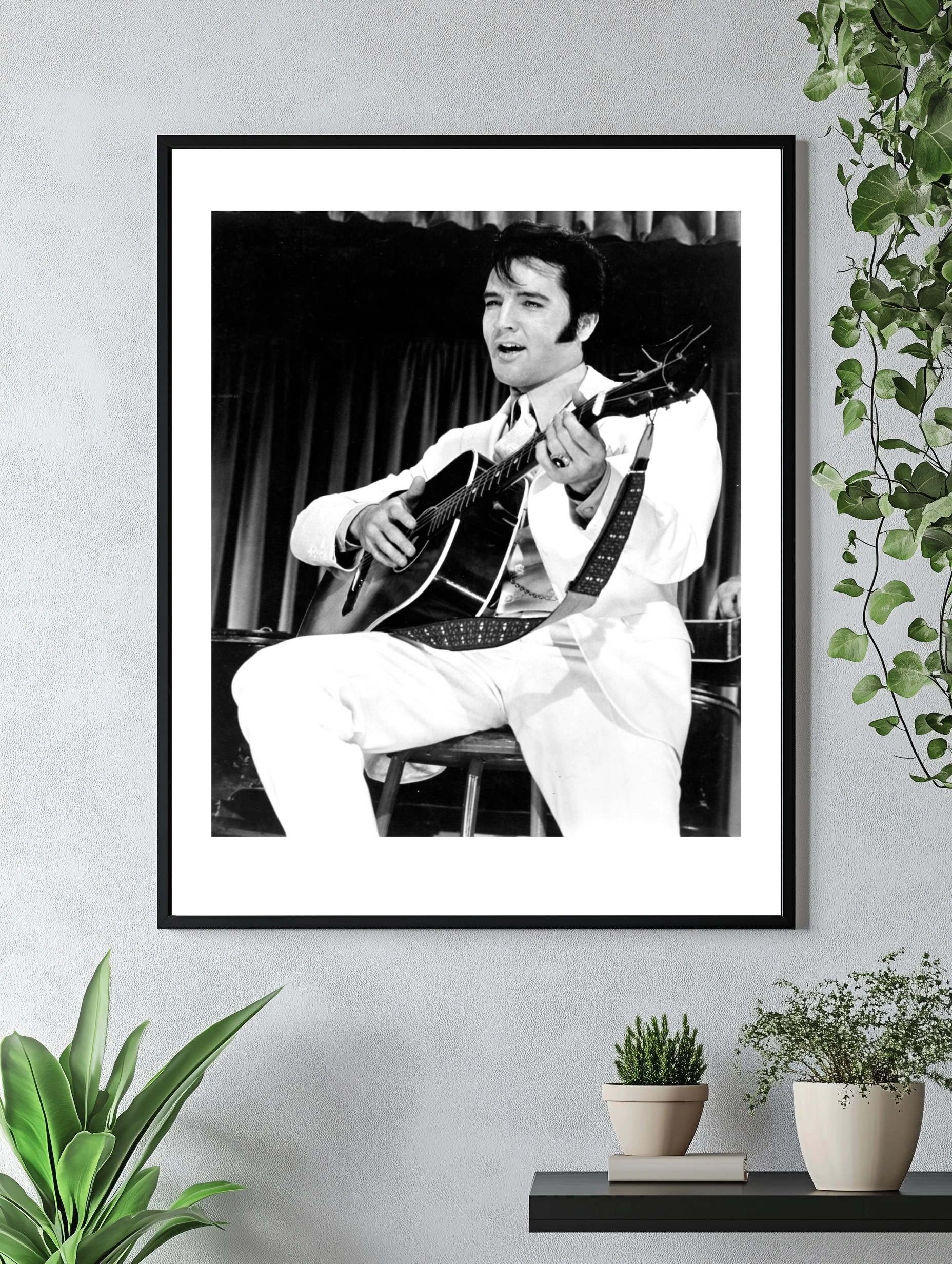 Чёрно-белая фотография легендарного музыканта Элвиса Пресли, играющего на акустической гитаре в белом костюме на фоне занавесей. Этот интерьерный художественный плакат подчёркивает атмосферу эры рок-н-ролла, подходит для гостиной, офиса или музыкального клуба. Стильный декоративный плакат, уникальные картины для дома.