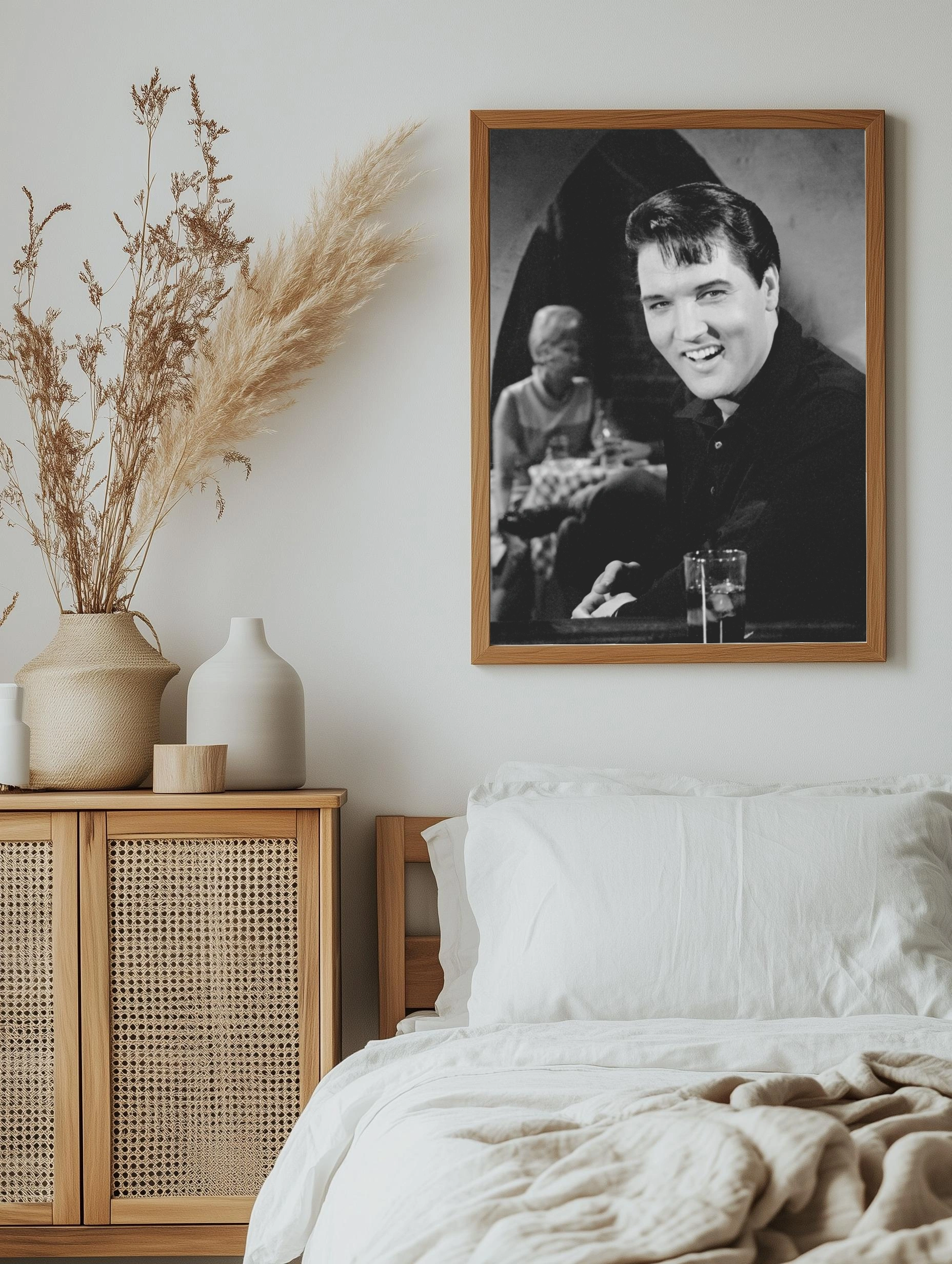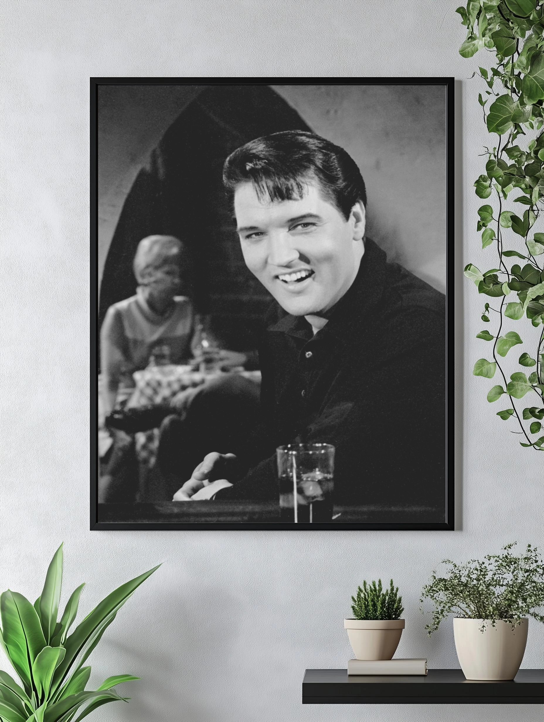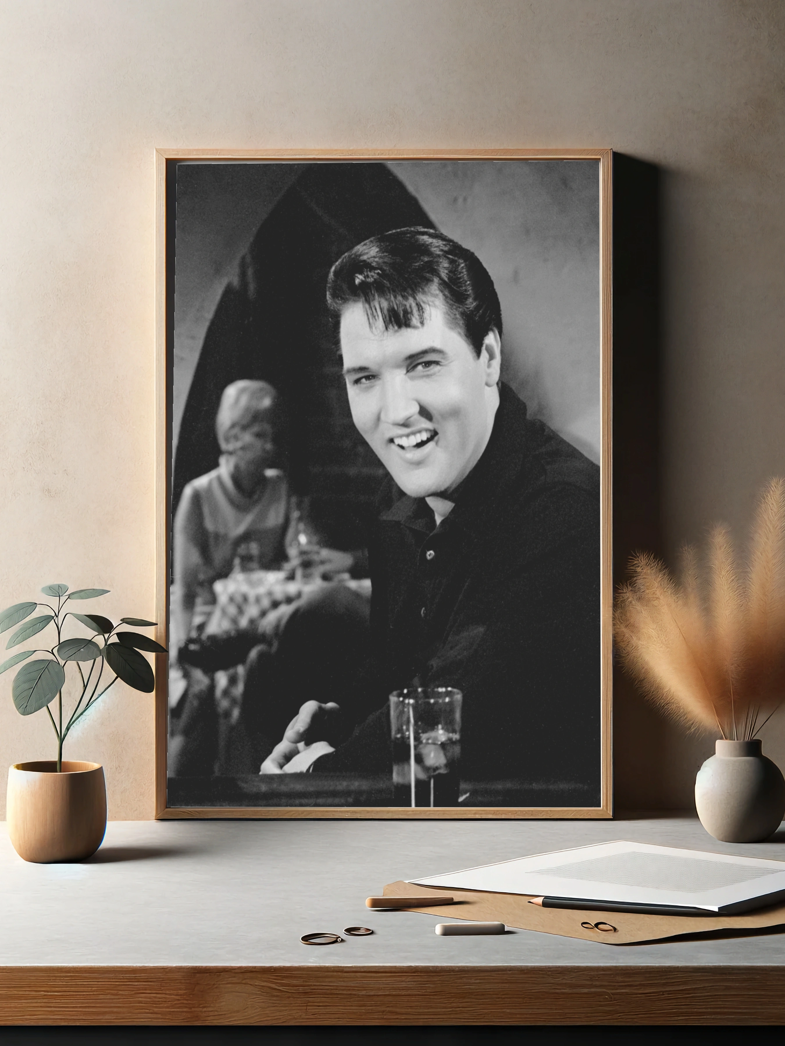Изображение показывает известного певца Элвиса Пресли в момент выступления или в непринуждённой атмосфере в стиле ретро. Чёрно-белая фотография создаёт ощущение ностальгии и подчёркивает классическую эстетику 50-60-х годов. Картина для гостиной или офиса, идеально подходящая как интерьерное искусство с уникальной харизмой рок-н-ролла.