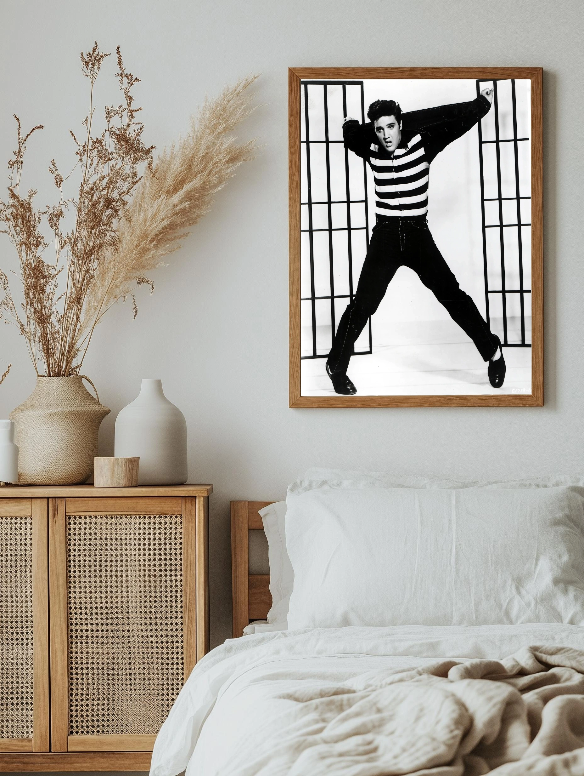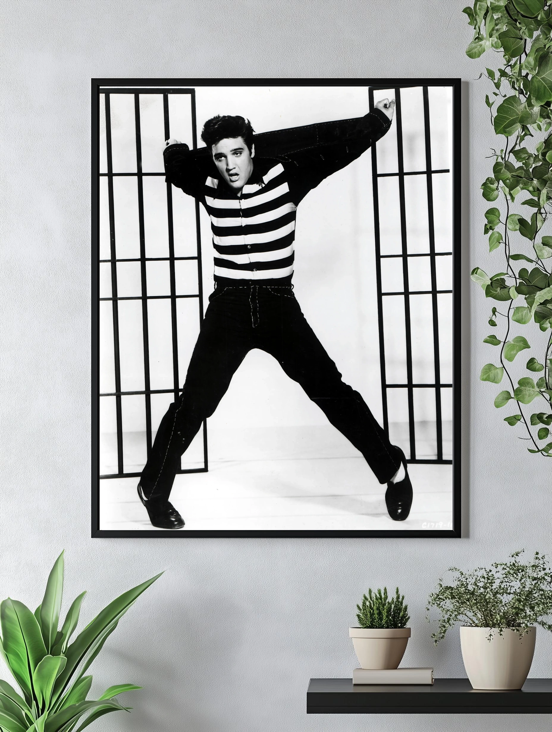 Черно-белое фото Элвиса Пресли в культовом полосатом свитере и темных брюках, изображенного в динамичном прыжке на фоне минималистичного интерьера с сетчатым фоном. Этот интерьерный арт идеально подходит для декора в стиле ретро, музыкальных комнат и тематических пространств, создавая атмосферу легендарного рок-н-ролла.