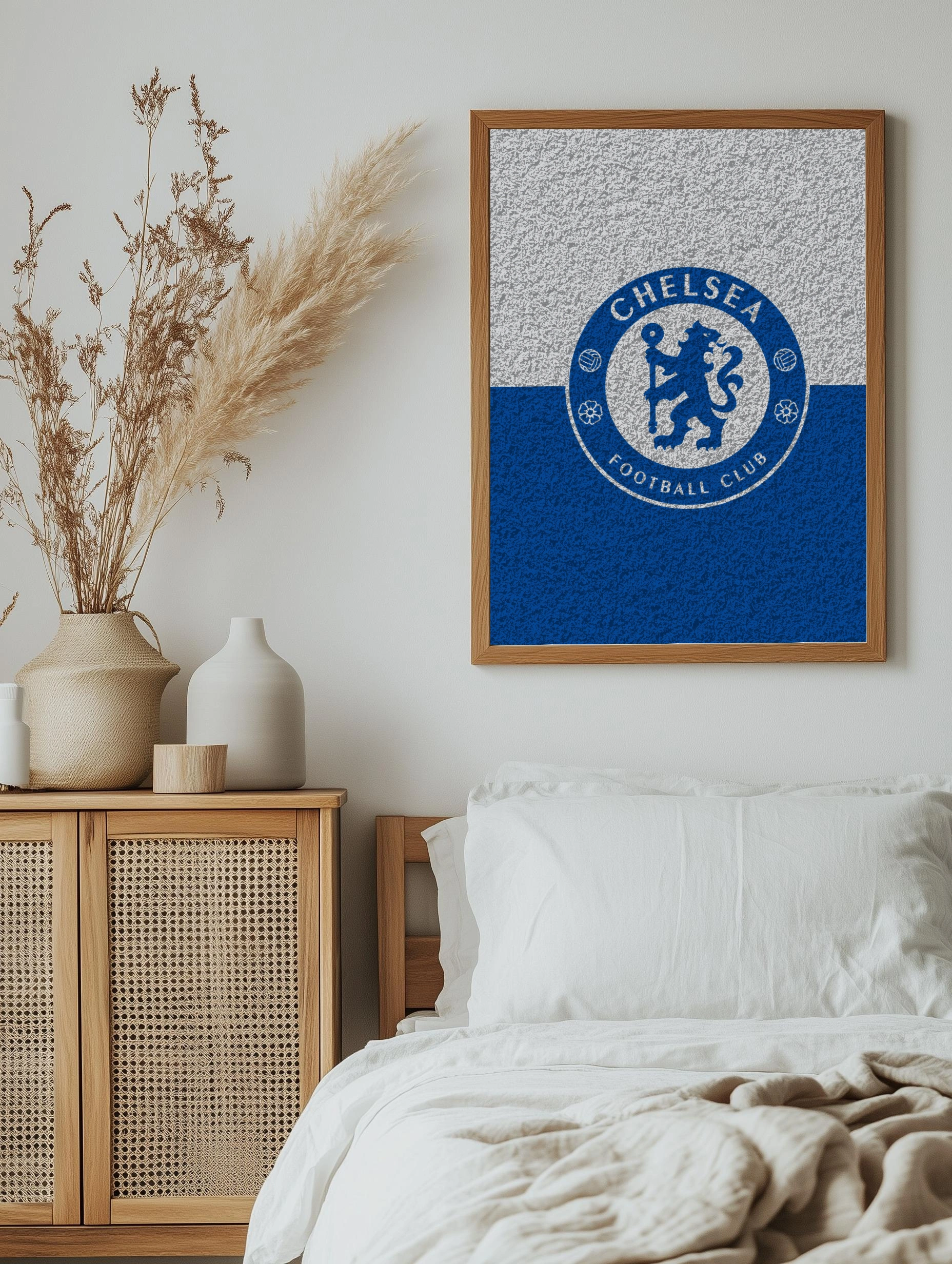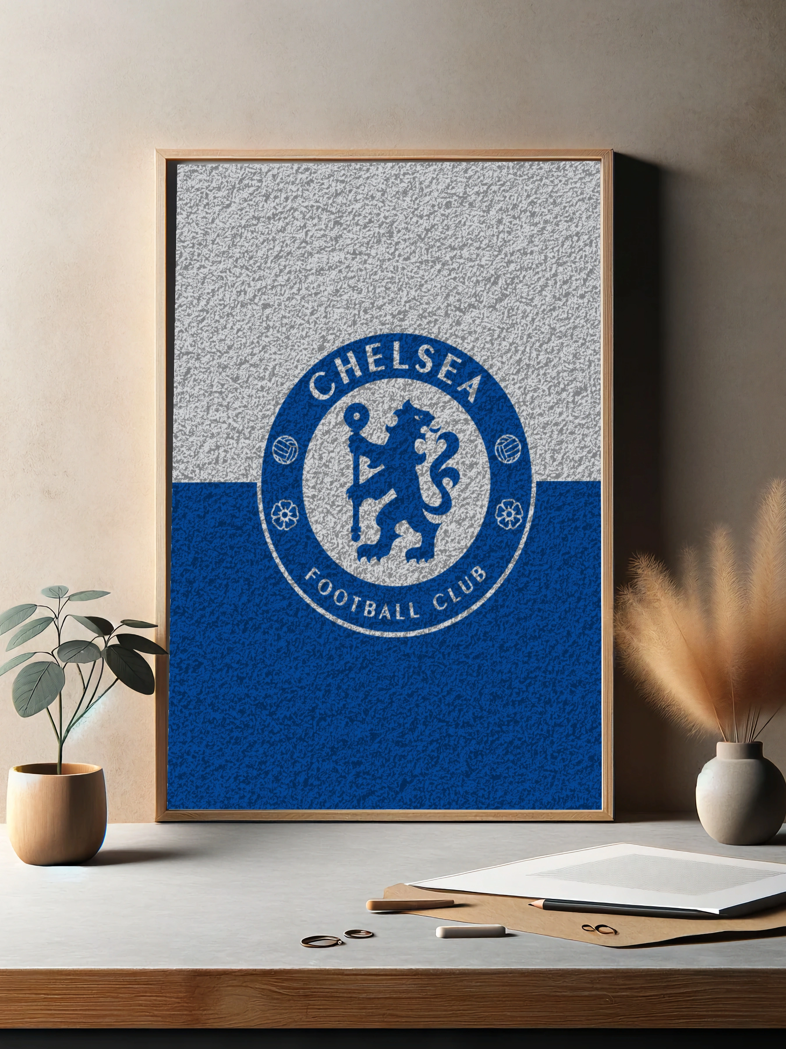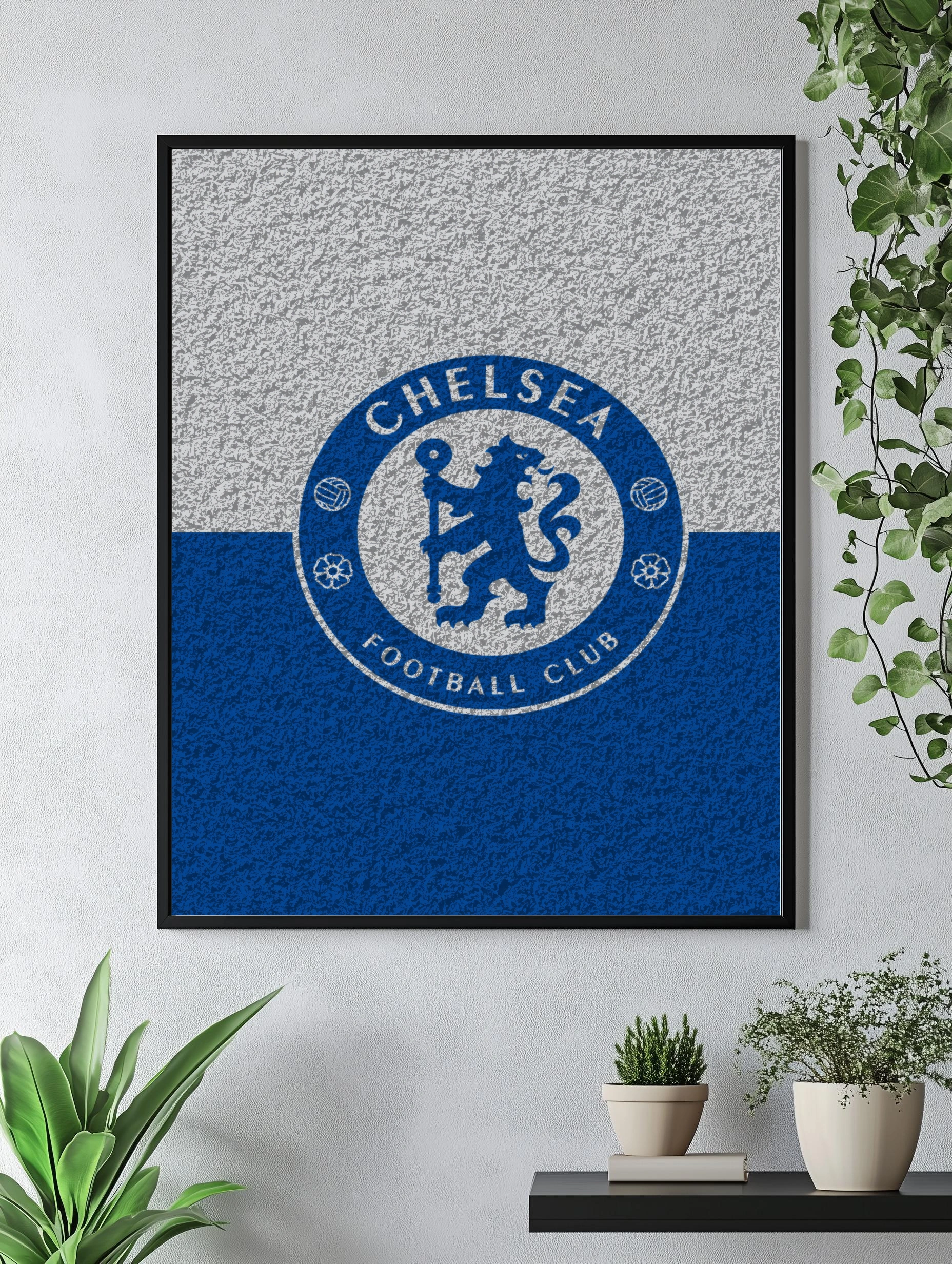Изображение представляет собой интерьерное искусство с эмблемой футбольного клуба Челси. Эмблема выполнена в минималистическом стиле с текстурированной серой и синей заливкой, создающей эффект фактурного холста. Это современная декоративная картина для стен, идеально подходящая в качестве стильного оформления гостиной, спальни или офиса для поклонников футбола.