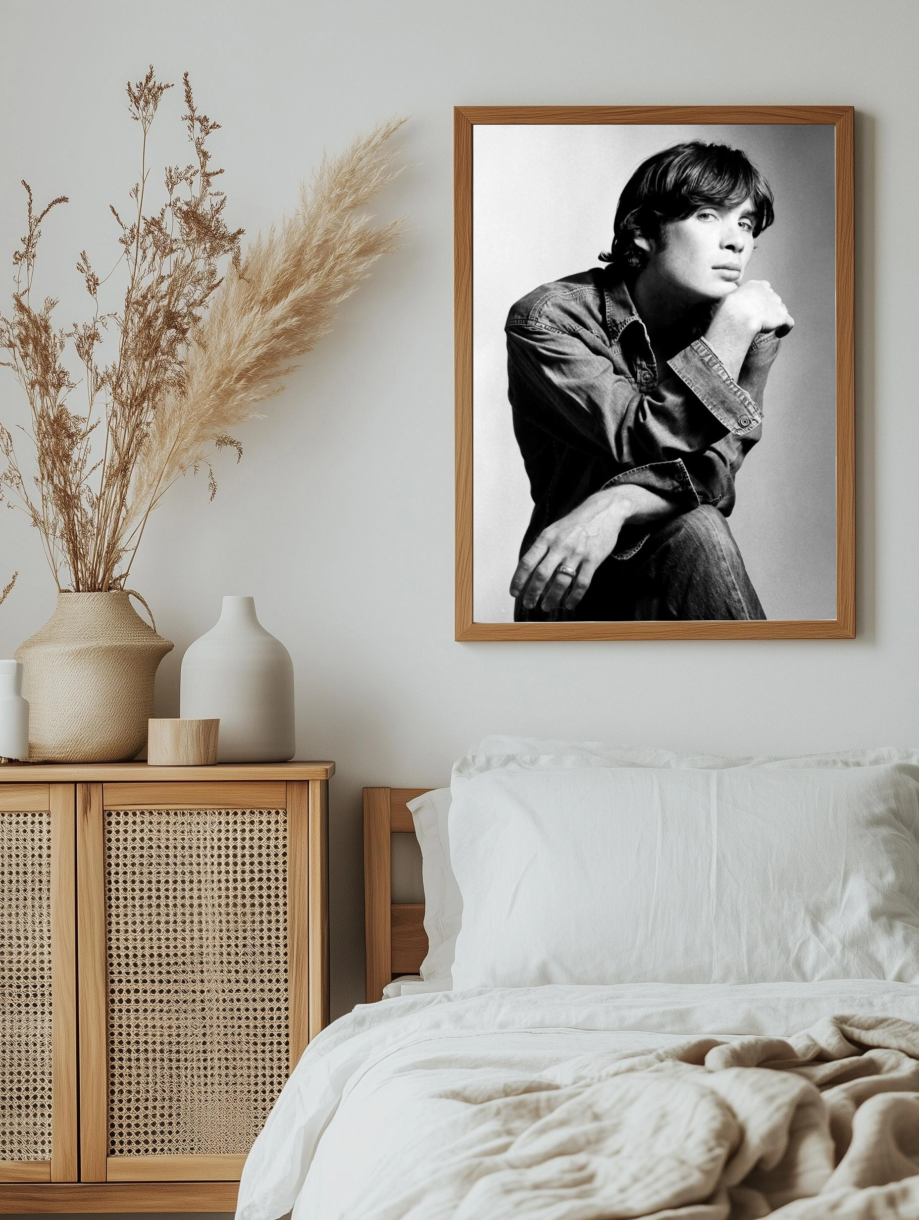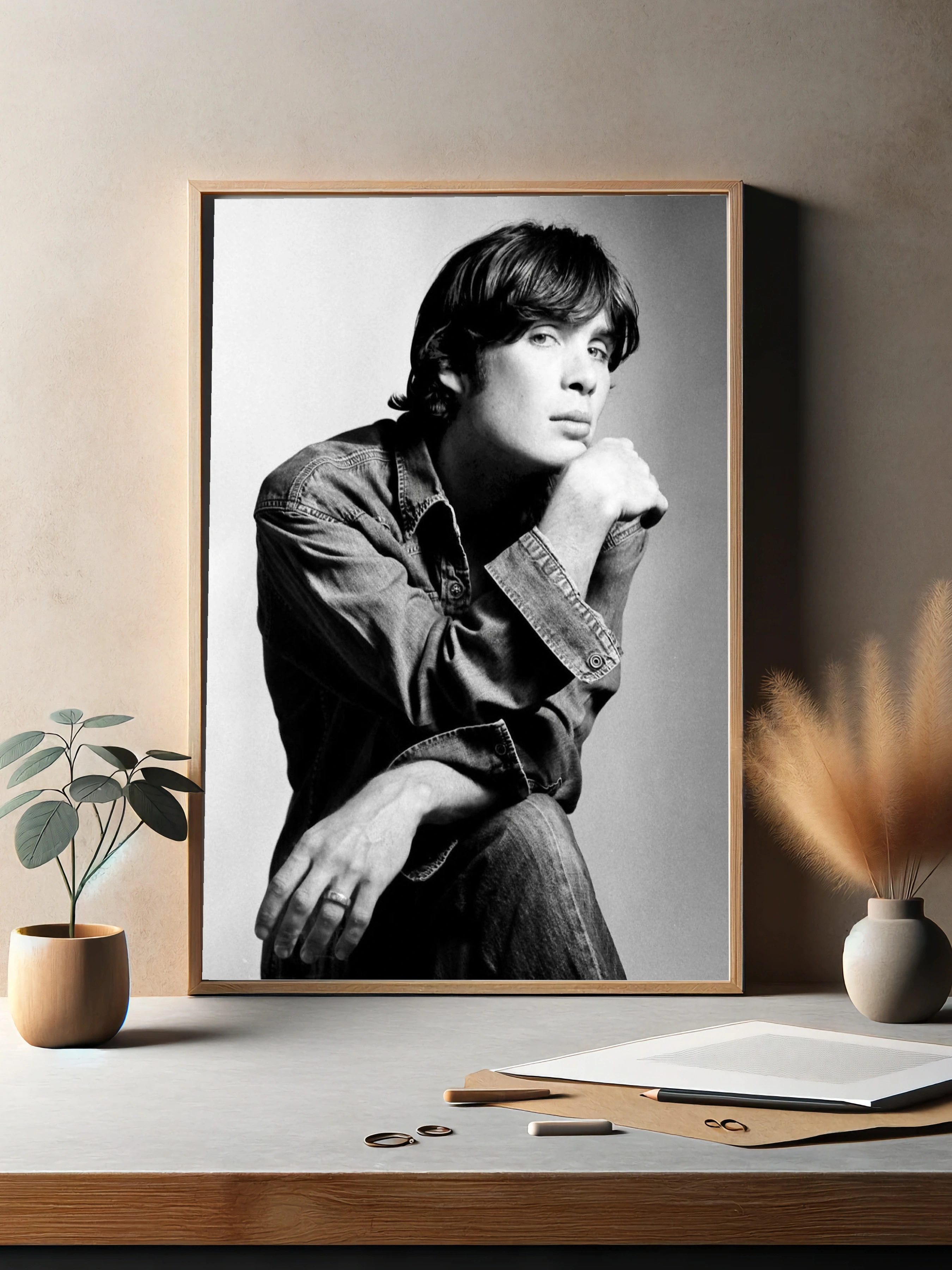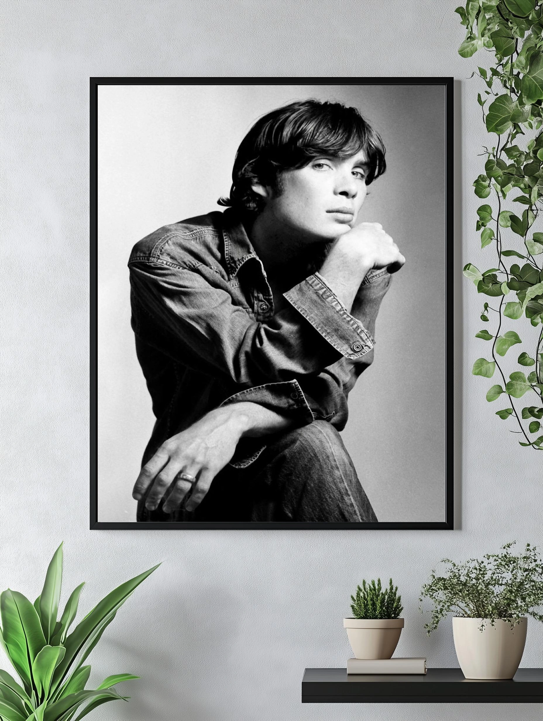 Черно-белое фотографическое изображение молодого мужчины с задумчивым выражением лица, одетого в джинсовую рубашку и джинсы. Стиль снимка классический и минималистичный, акцент на тонкие детали лица и текстуру одежды. Такой интерьерный постер прекрасно дополнит гостиную или офис, создавая атмосферу элегантности и глубины.