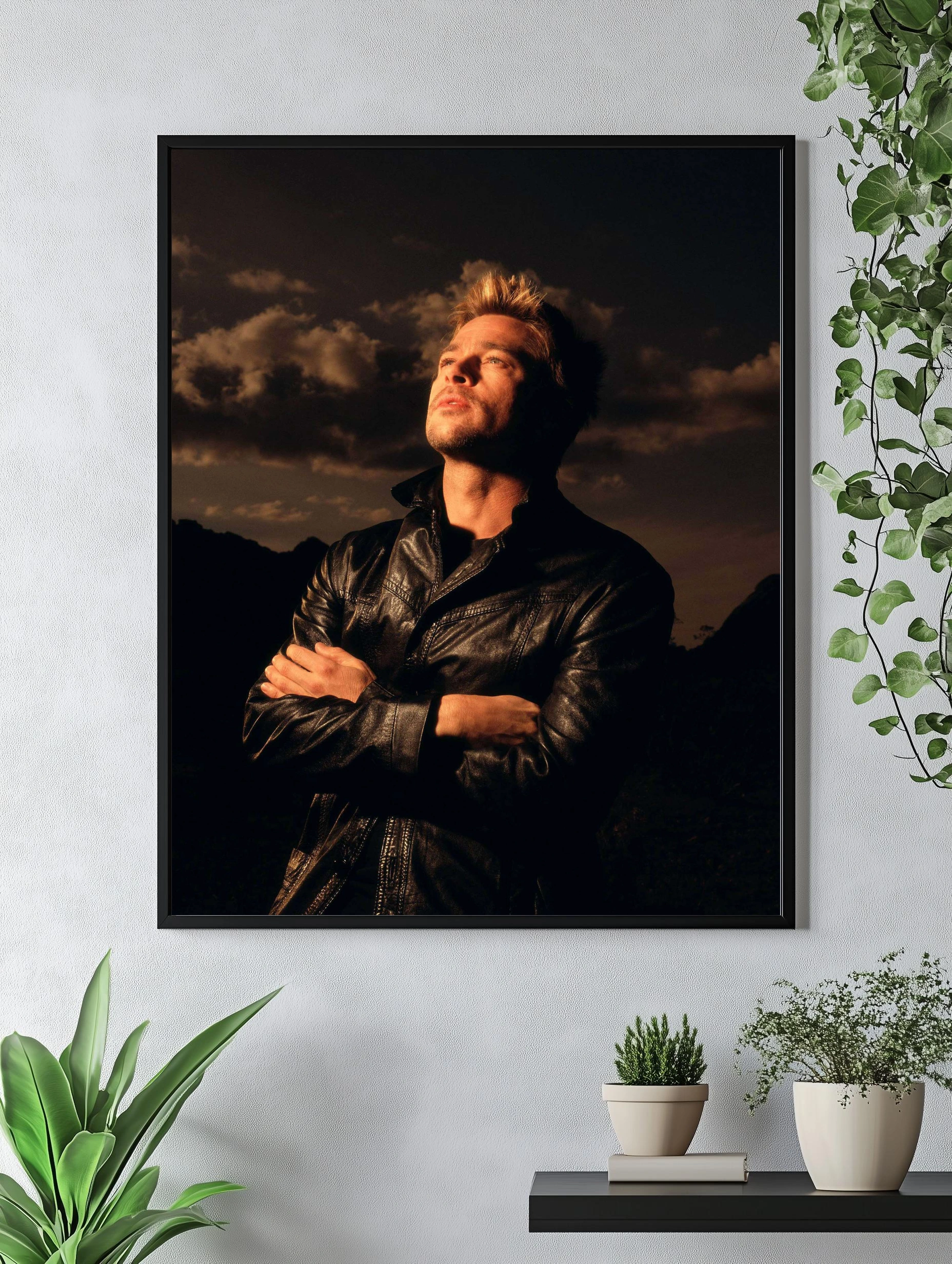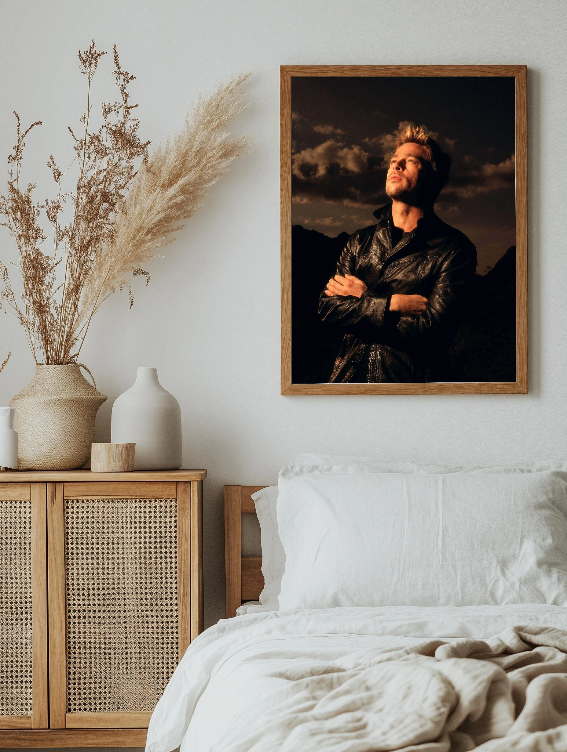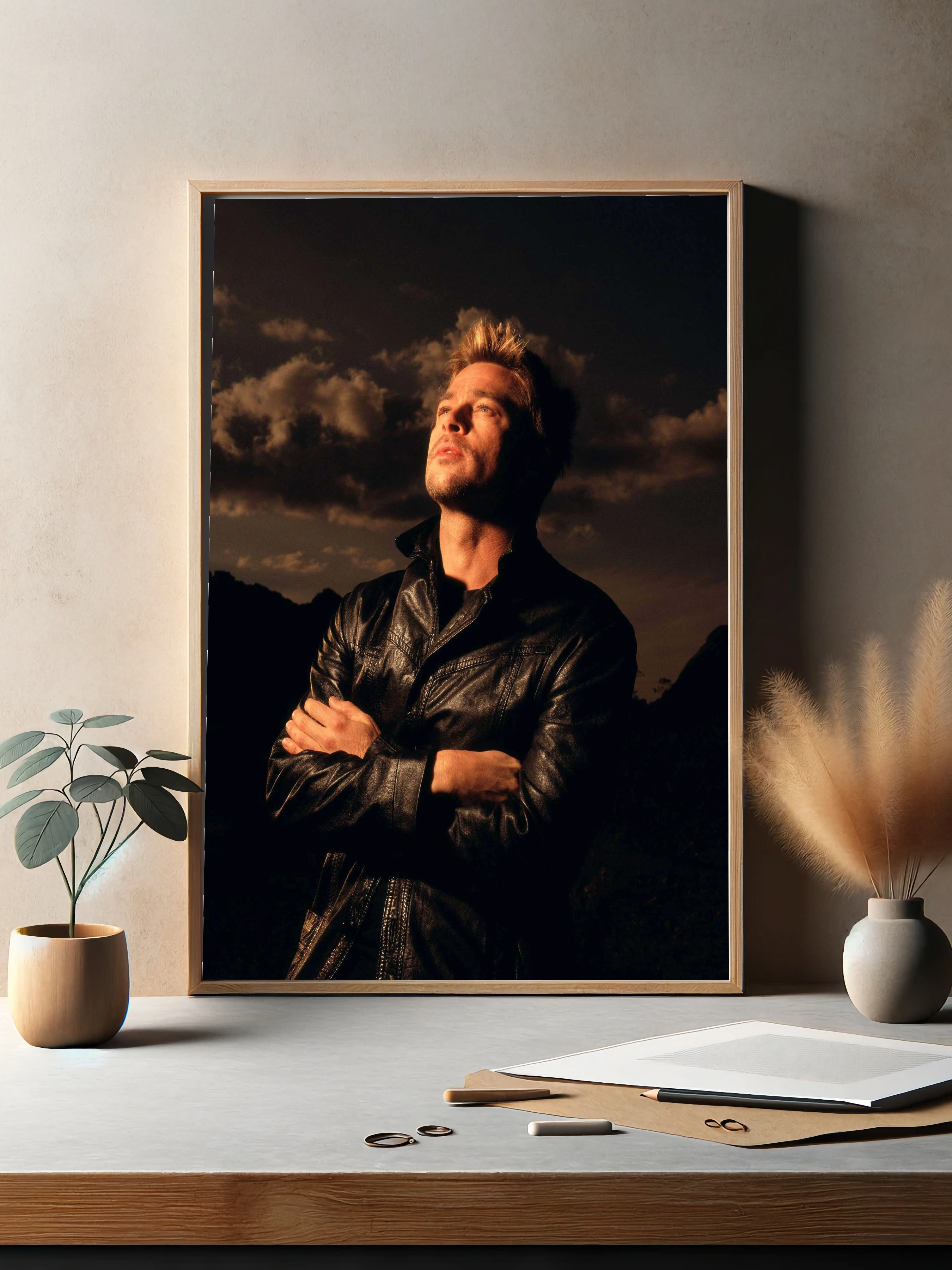На изображении представлен известный актер Брэд Питт, одетый в черную кожаную куртку, который задумчиво смотрит вверх на фоне драматического закатного неба с темными облаками. Фото выполнено в теплой, золотистой гамме, создающей атмосферу интроспекции и загадочности. Этот интерьерный арт-фотопортрет идеально подойдет для гостиной или офиса, как стильный декоративный плакат и современное искусство для стен.