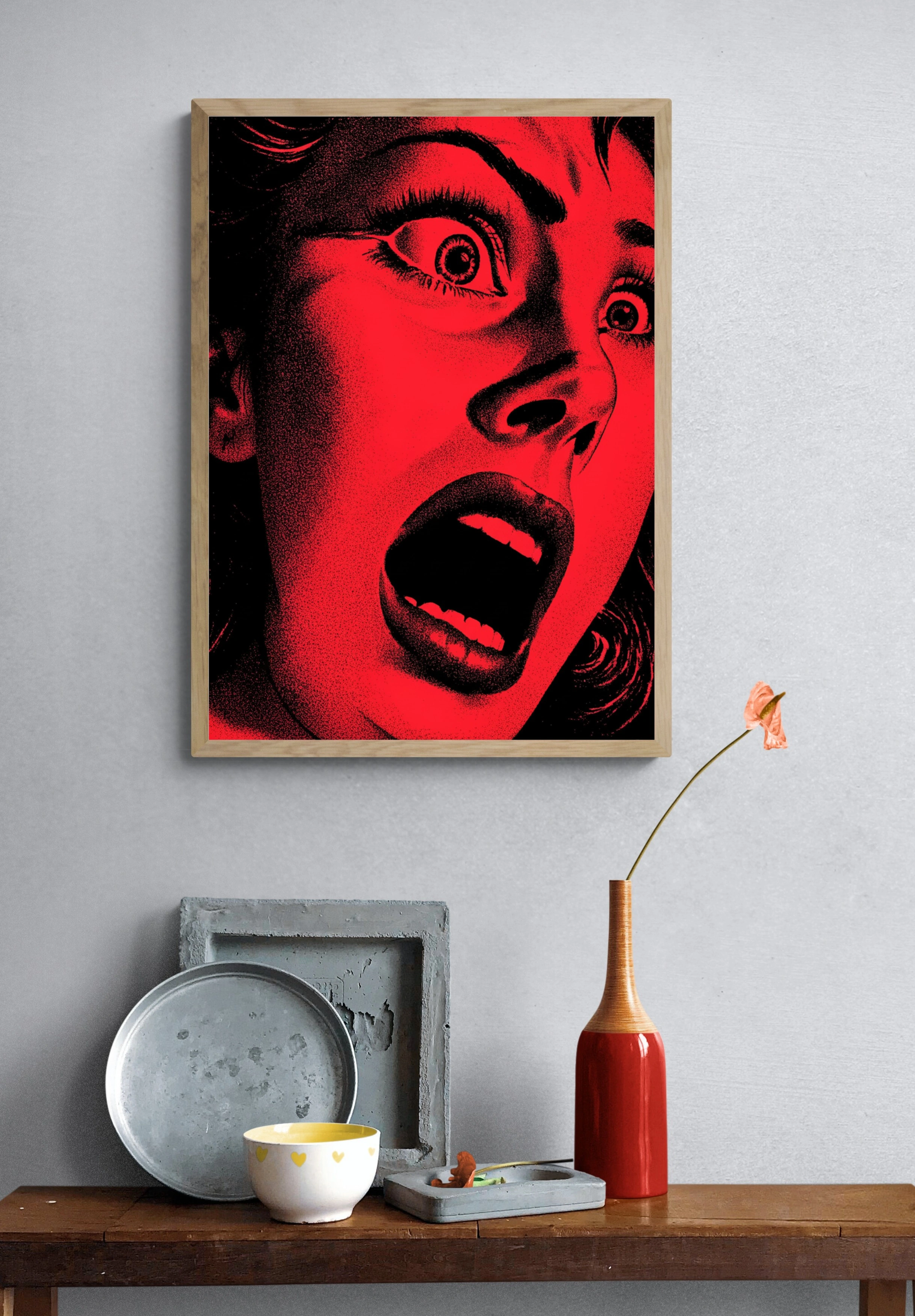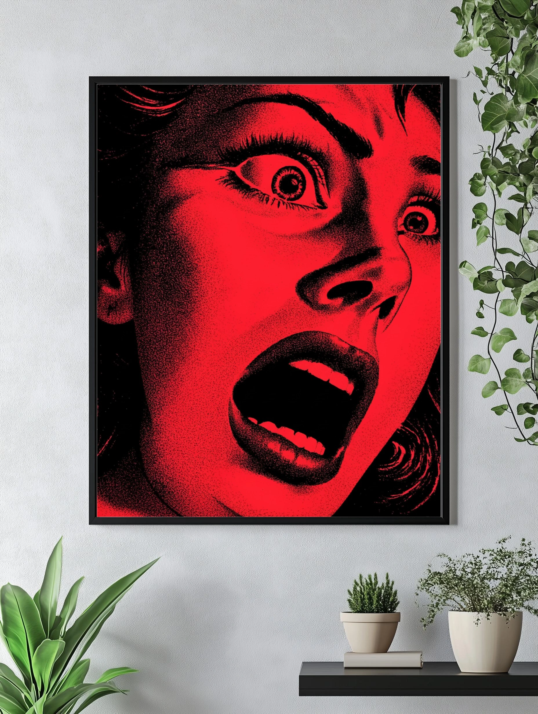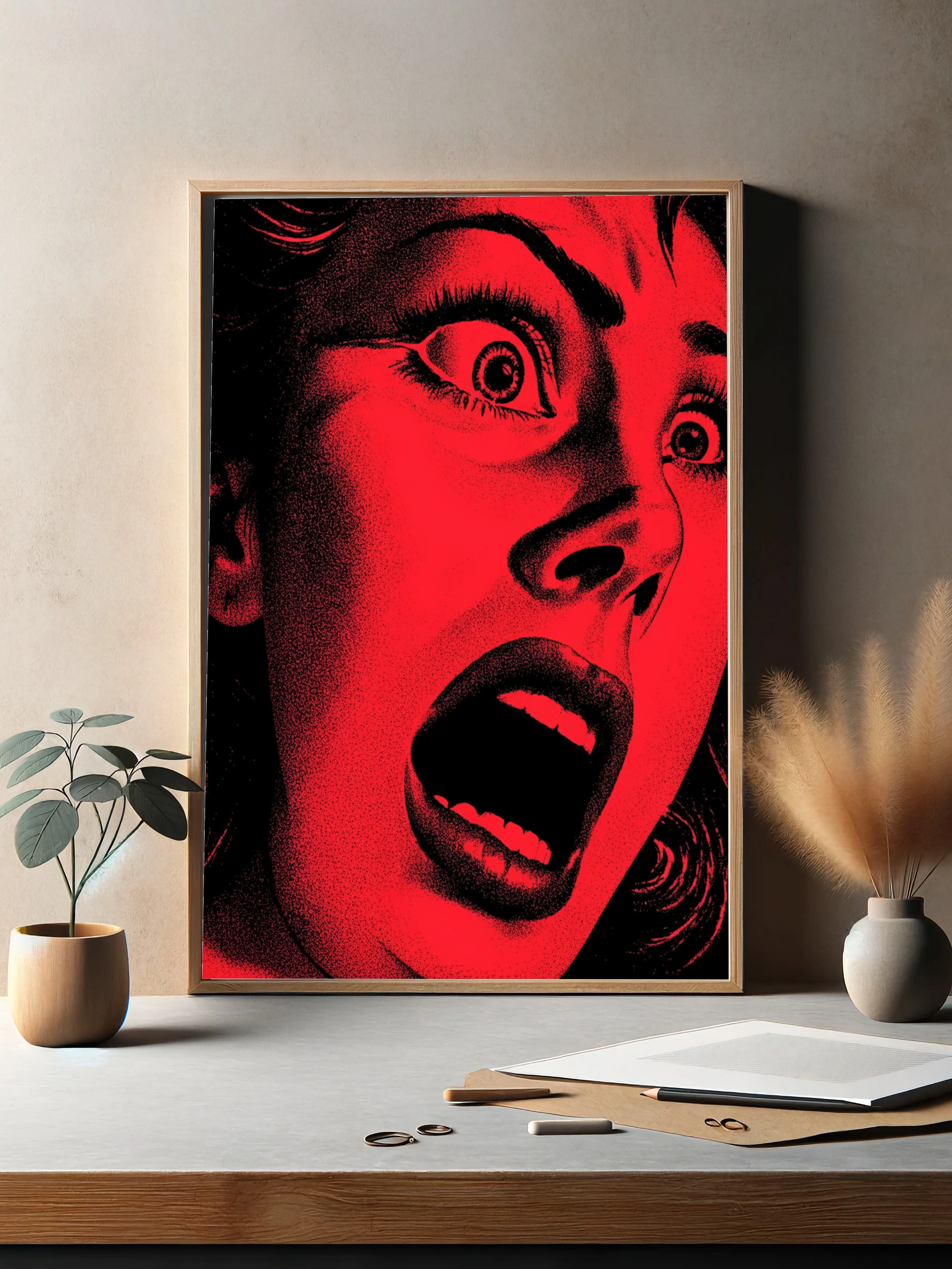 Этот постер захватывает дух, изображая лицо женщины, полное ужаса и тревоги. Яркие красные оттенки создают атмосферу напряжения, а детализированные черные контуры подчеркивают выражение лица, заставляя зрителя почувствовать всю глубину эмоций. Глаза женщины широко раскрыты, а рот открыт в крике, что добавляет динамики и экспрессии. Такой эффектный контраст между красным и черным создает мощный визуальный акцент, который не оставит равнодушным. Этот постер идеально подойдет для оформления интерьера в стиле поп-арт, добавляя нотку драмы и оригинальности в любую комнату. Он станет отличным выбором для молодежи, креативщиков и всех, кто ценит искусство, способное вызывать сильные эмоции.