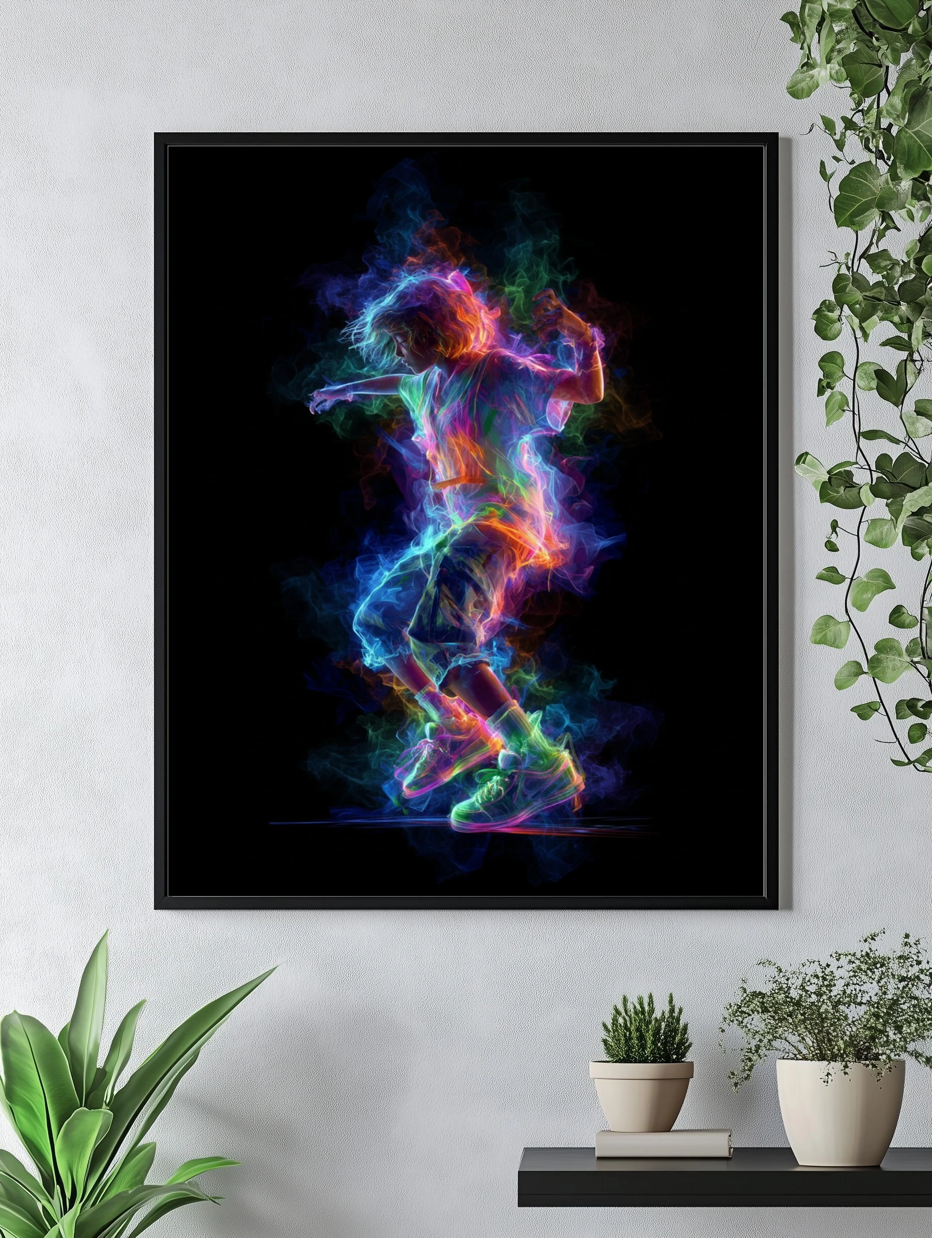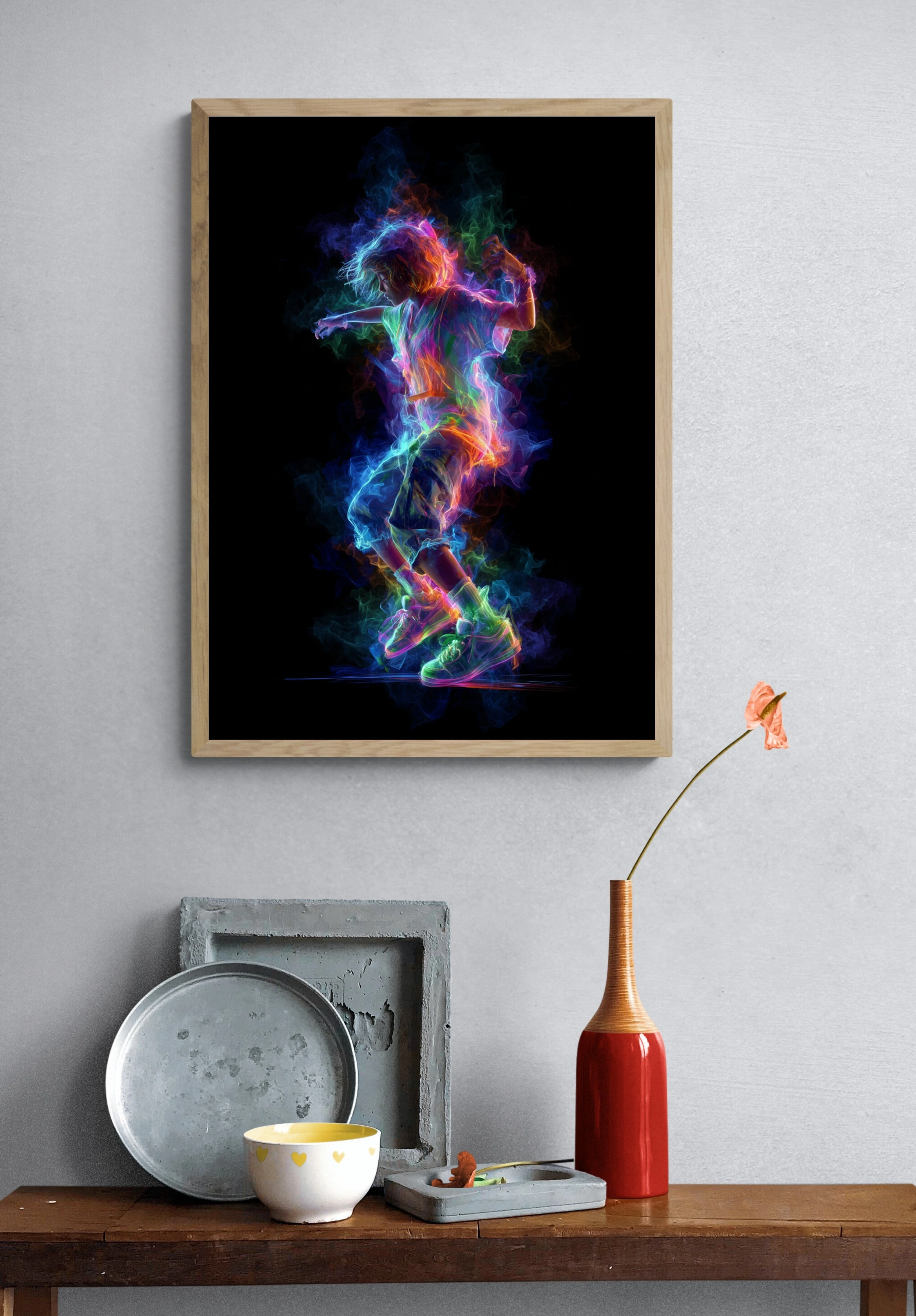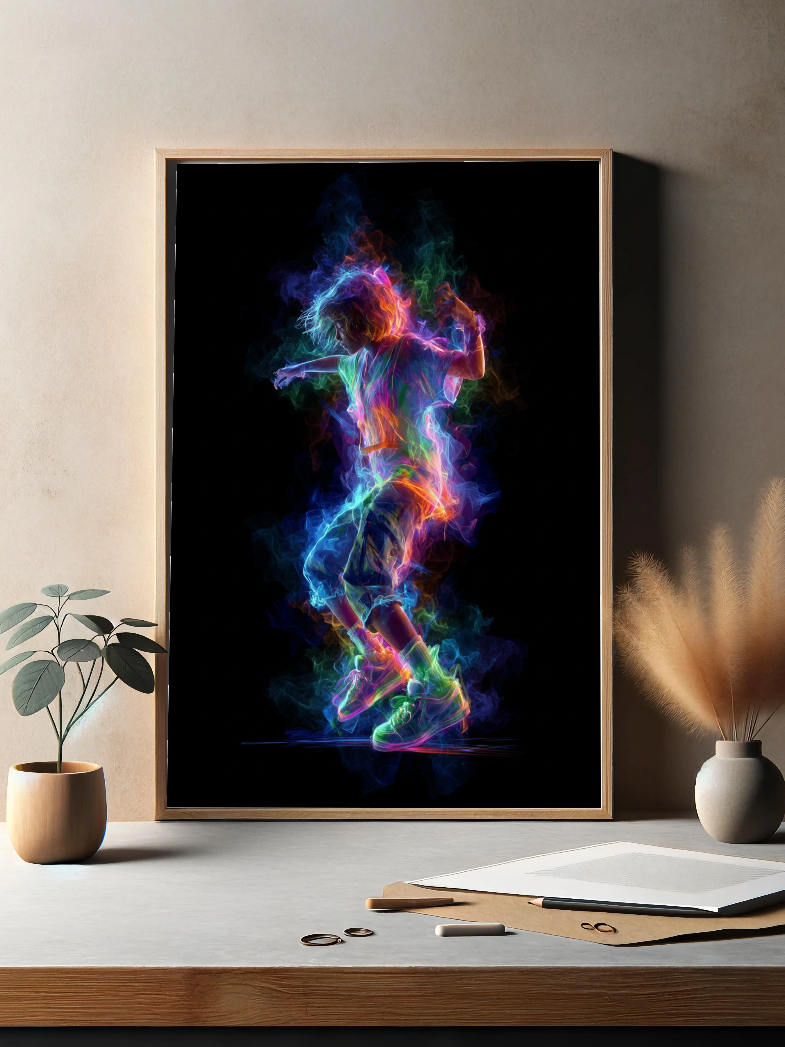 Этот постер захватывает момент динамичного танца, изображая мальчика в движении, окруженного яркими цветными облаками. Его поза полна энергии и радости, а волосы и одежда словно светятся в ритме музыки. Визуальные эффекты создают ощущение легкости и свободы, подчеркивая каждое движение. Основные цвета — яркий синий, зеленый и оранжевый, которые гармонично переплетаются, создавая эффект флюидов. Стиль постера — современный абстракционизм, который привносит в интерьер атмосферу креативности и вдохновения. Идеально подойдет для детской комнаты или молодежного пространства, где царит дух свободы и самовыражения. Этот постер привлечет внимание как детей, так и подростков, вдохновляя их на творчество и активность.