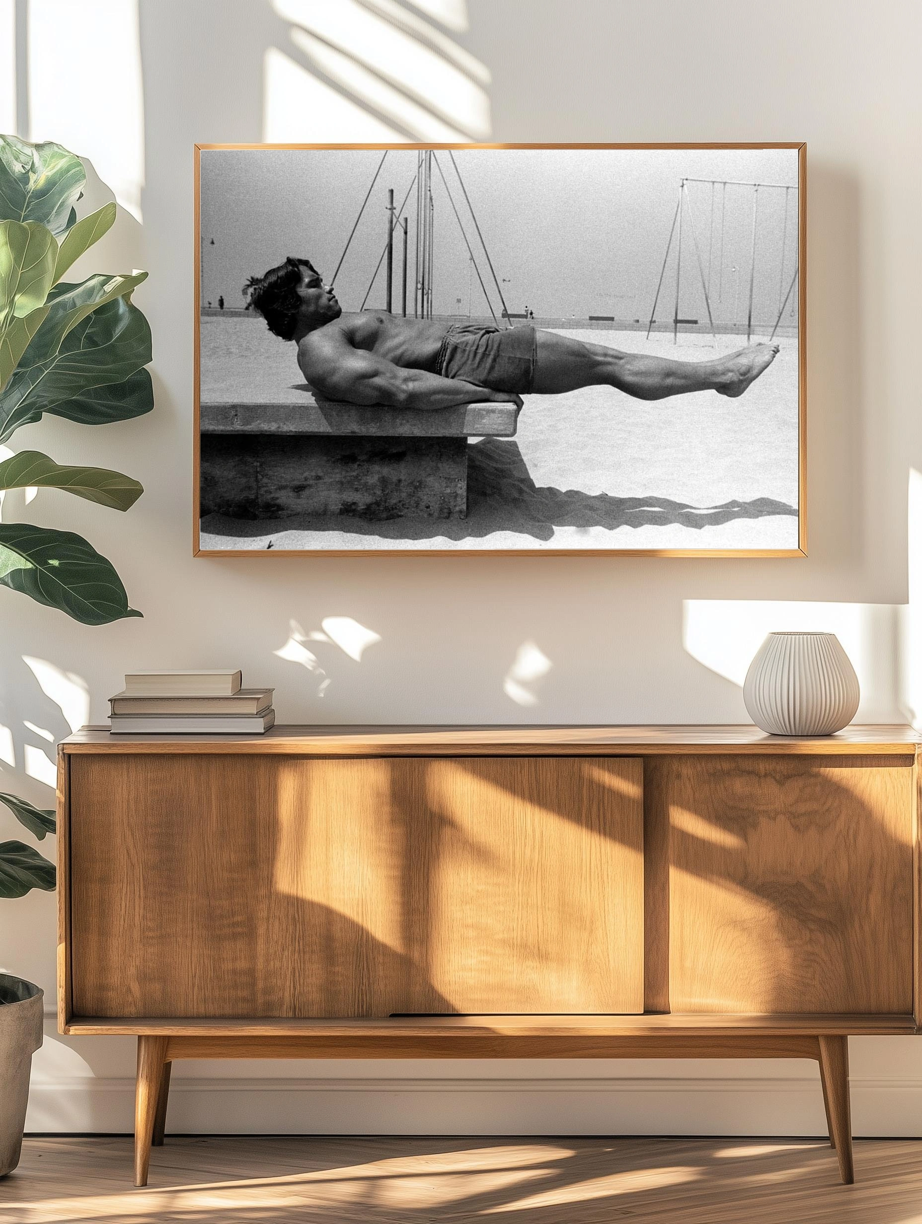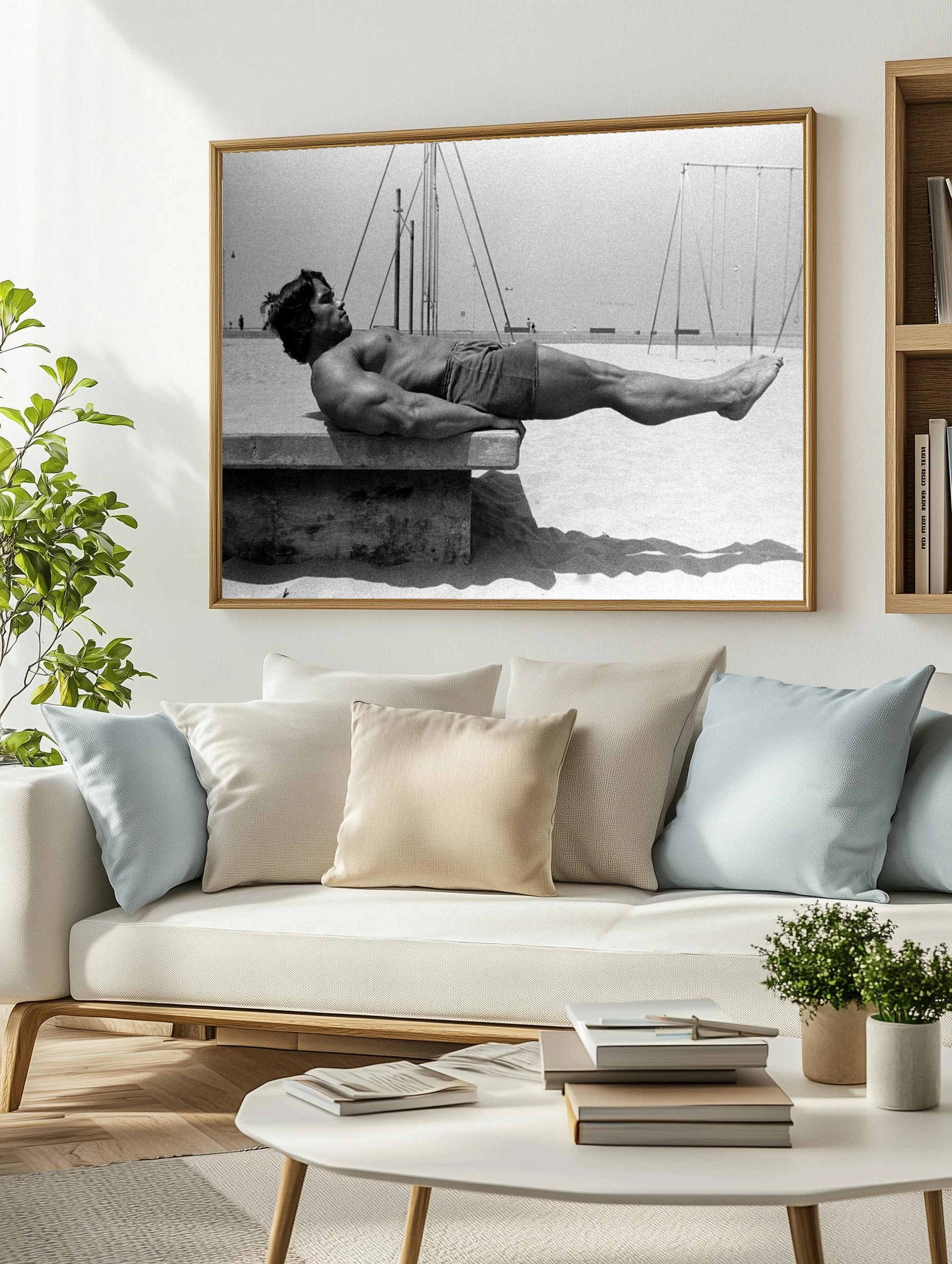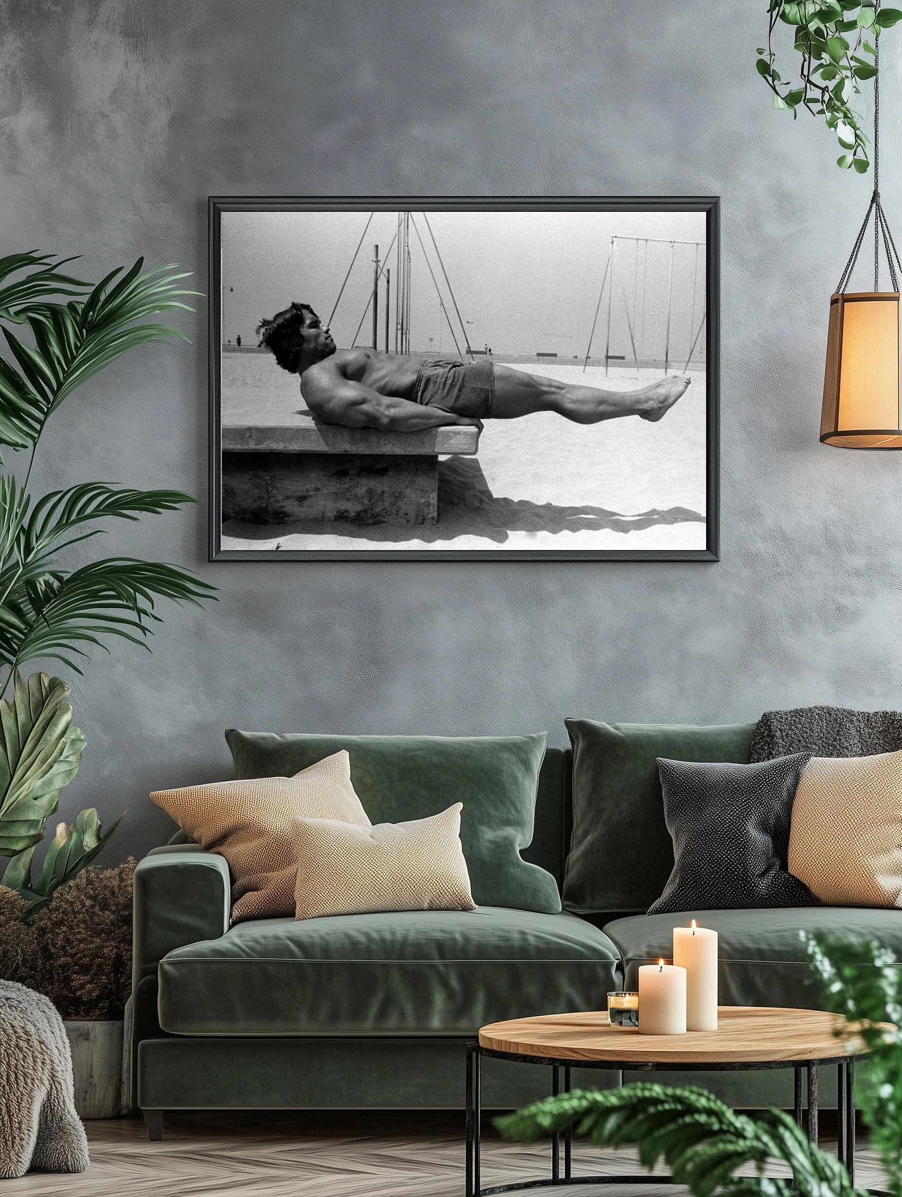 Черно-белая фотография демонстрирует мускулистого мужчину в шортах, выполняющего физическое упражнение на открытом воздухе. Фон – пустынный пляж с песком и спортивным оборудованием. Строгие цветовые контрасты и композиция подчёркивают красоту и силу мускулатуры, создавая уникальное интерьерное искусство для стен в стиле минимализма и современного фотопостера.