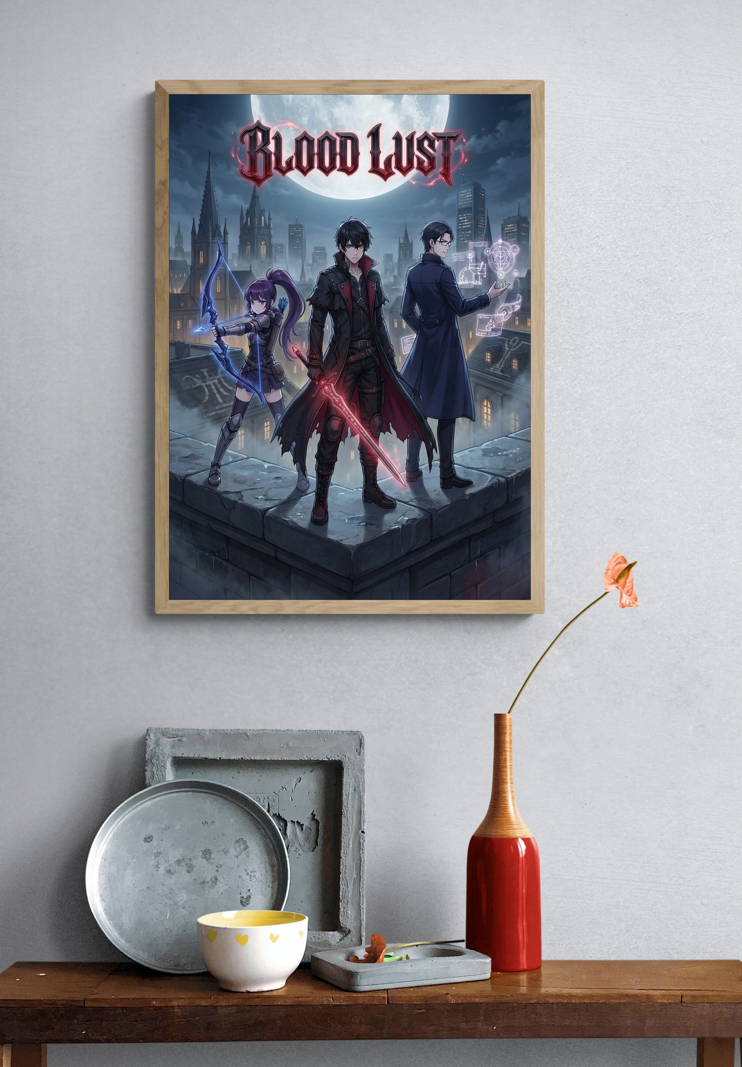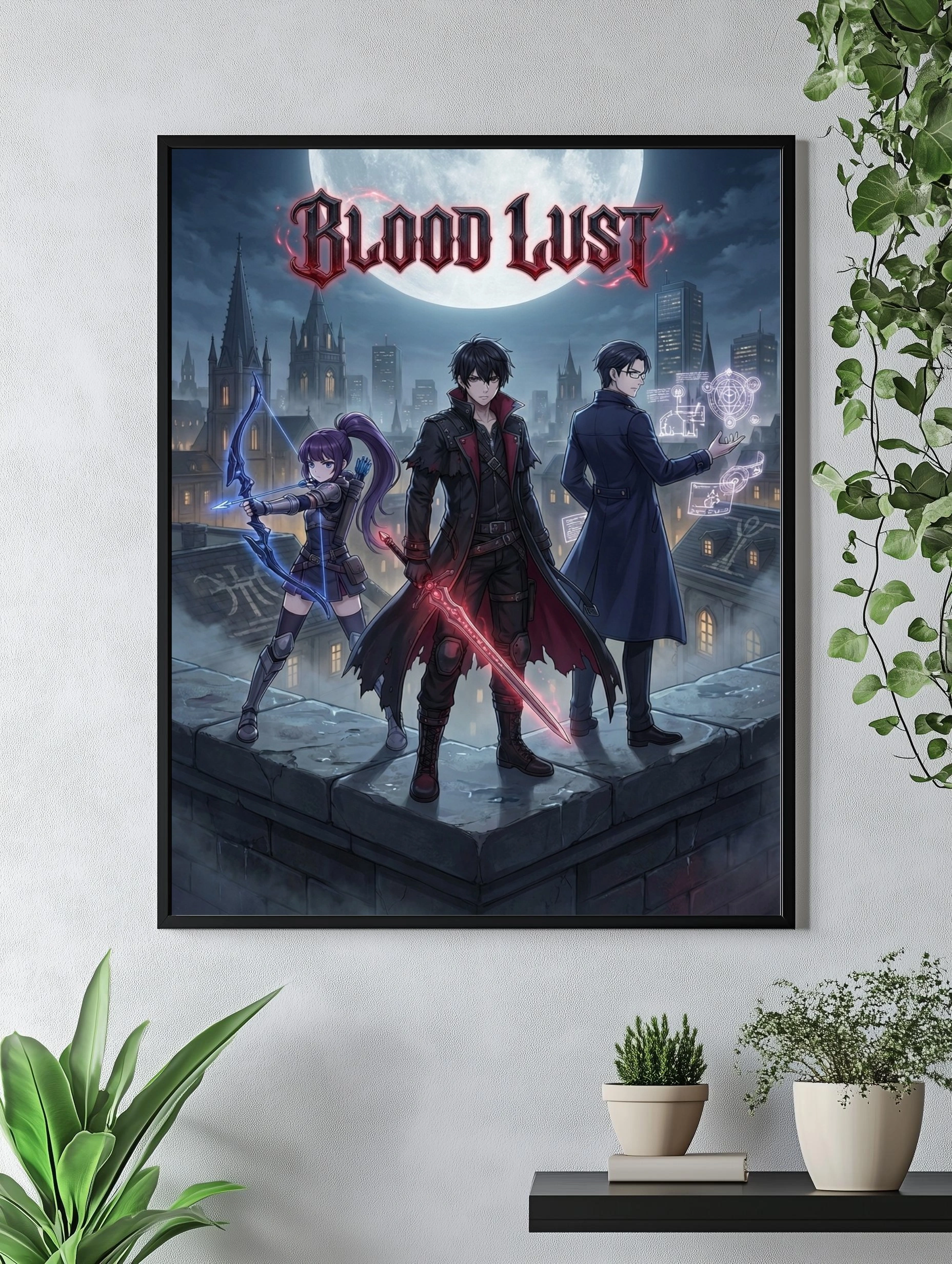 Погрузитесь в мир мрачной фэнтези с постером ‘Blood Lust’. На переднем плане изображены три героя: загадочный воин с красным мечом, ловкая лучница с синим луком и маг, использующий заклинания. Каждый персонаж выделяется своим уникальным стилем: воин в черном плаще с красными акцентами, лучница в броне с элементами синего и маг в элегантном темном пальто. На фоне величественные готические здания и огромная луна, создающая атмосферу таинственности и напряжения. Цветовая палитра включает глубокие черные, красные и синие оттенки, подчеркивающие драматизм сцены. Этот постер идеально подойдет для молодежных комнат, игровых пространств или офисов креативщиков, ищущих вдохновение и динамику.