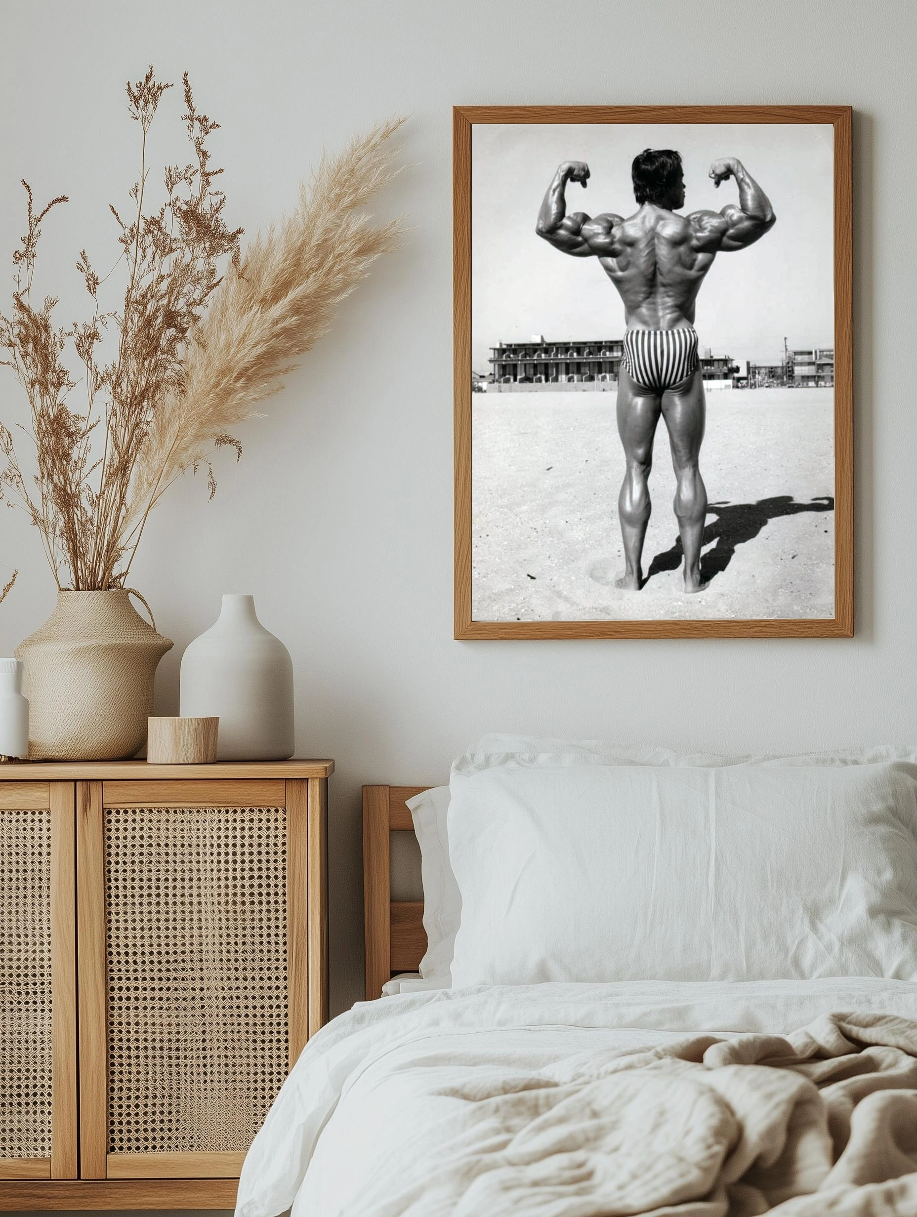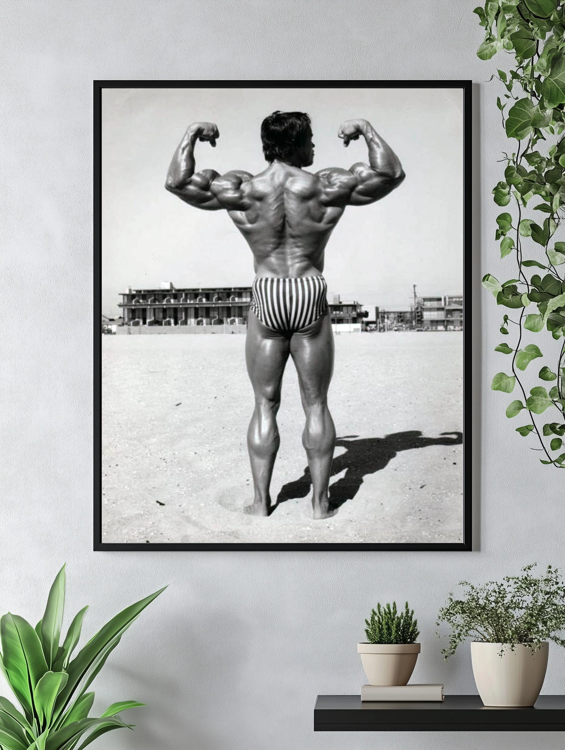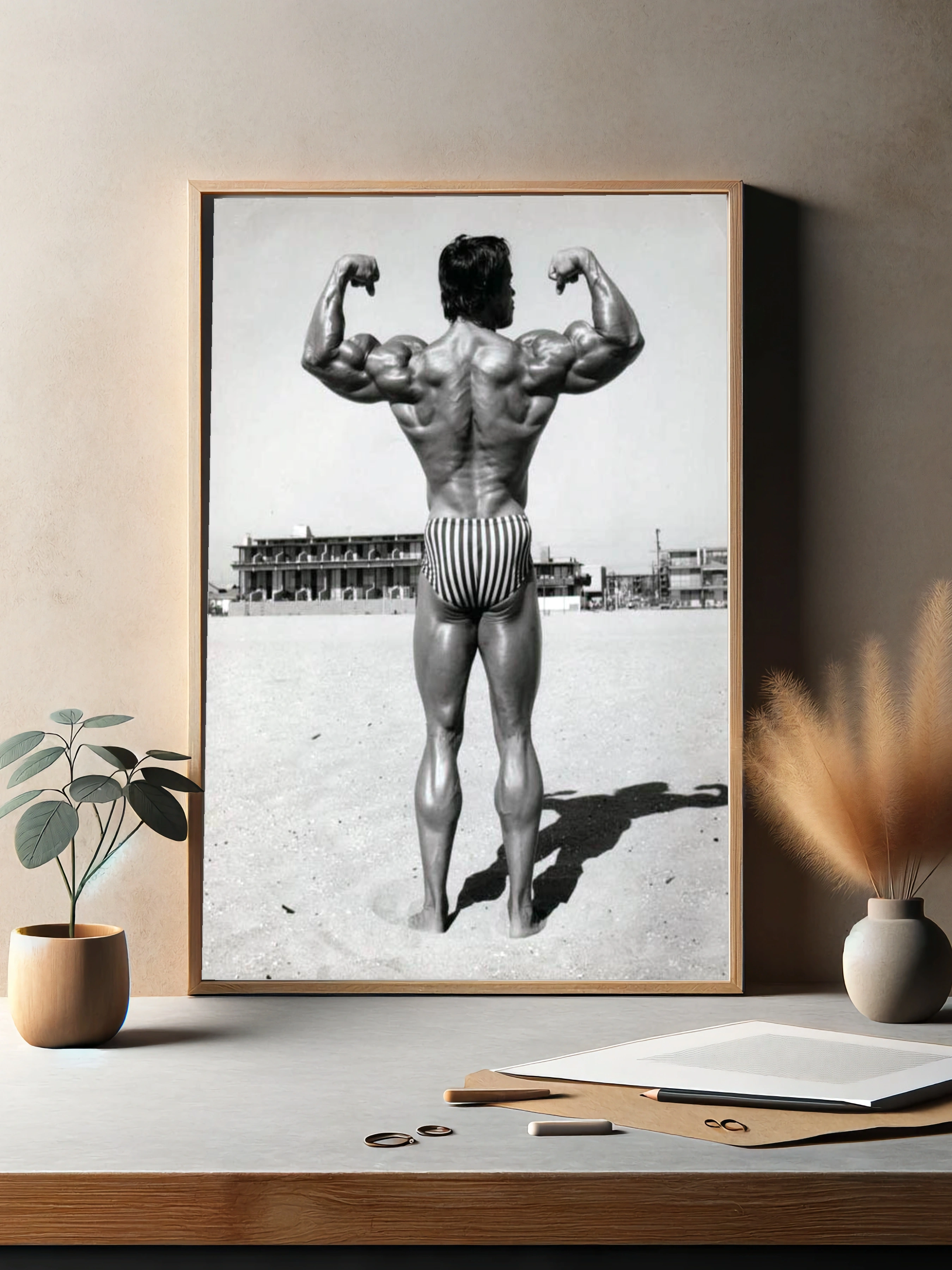 Черно-белая фотография известного бодибилдера Арнольда Шварценеггера, демонстрирующего мускулатуру в классической позе на пляже. Строгий контраст и минималистичный фон создают атмосферу силы и дисциплины. Идеальный интерьерный арт для поклонников спорта и классического бодибилдинга.