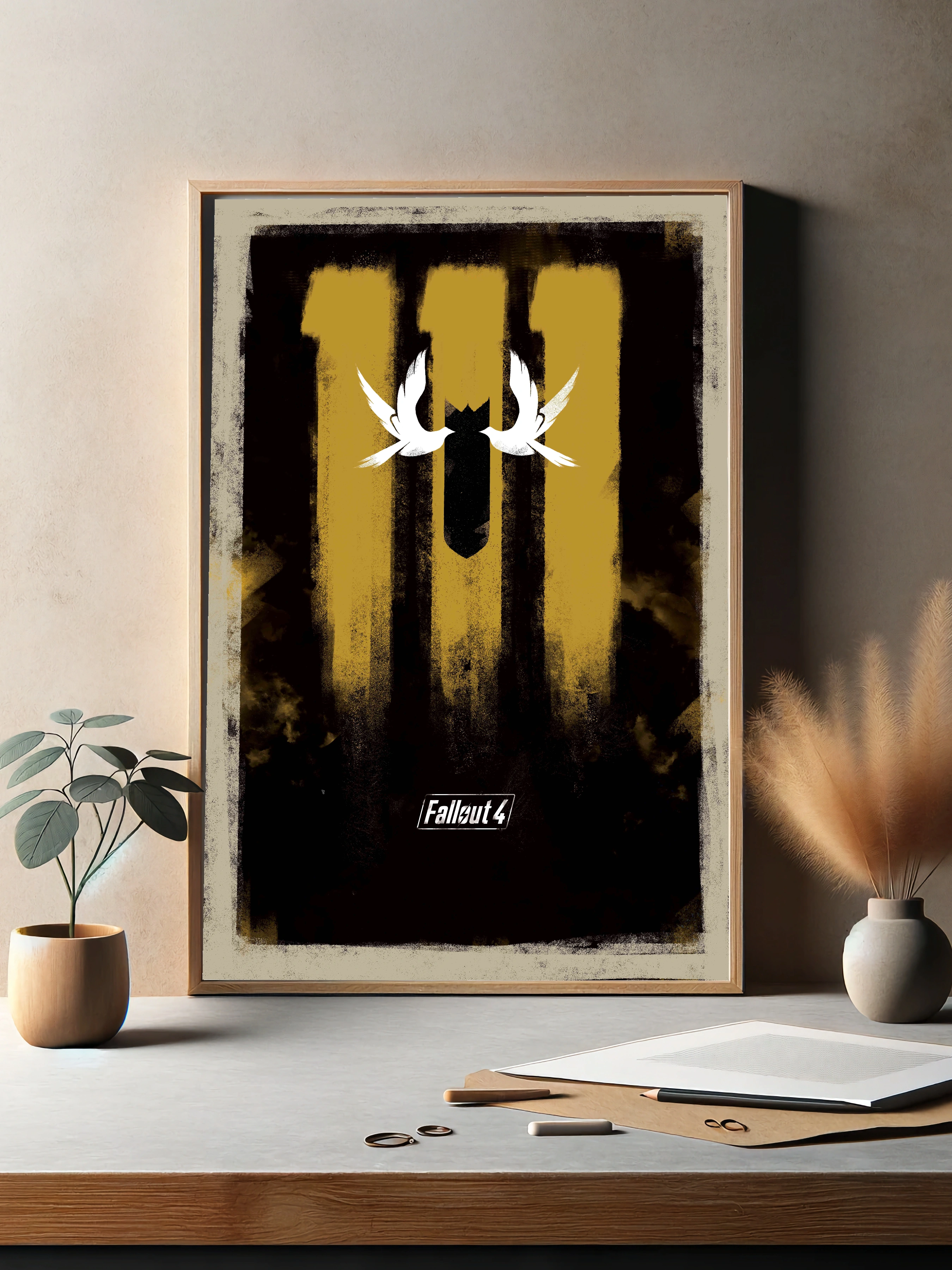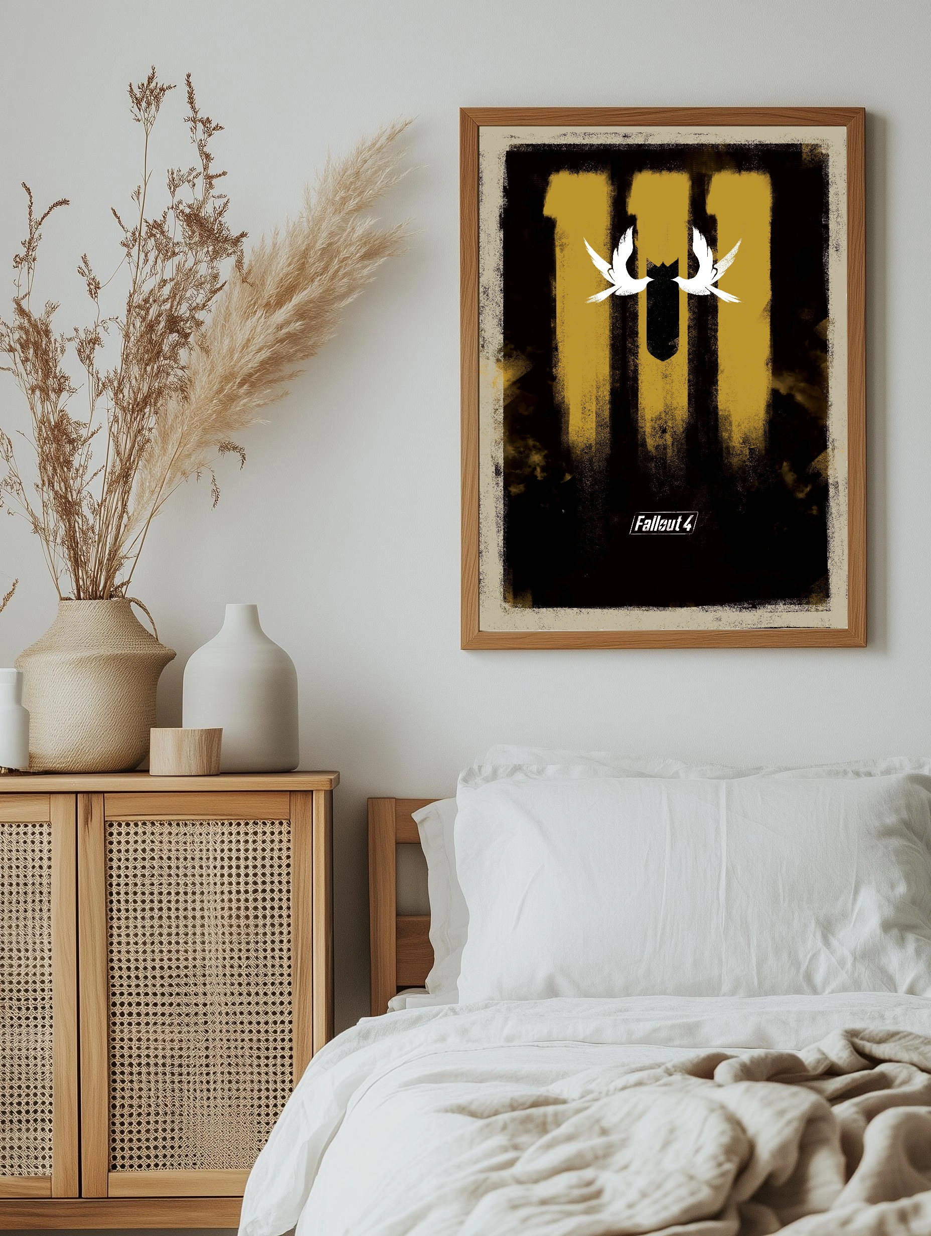 На изображении представлен абстрактный и выразительный дизайн с символикой игры Fallout 4. Центральный элемент — белые силуэты птиц, образующие фигуру бомбы с короной на фоне вертикальных жёлтых и чёрных полос. Картина для спальни или гостиной выполняет роль декоративного плаката с уникальным принтом, сочетающего атмосферу постапокалипсиса и надежды.