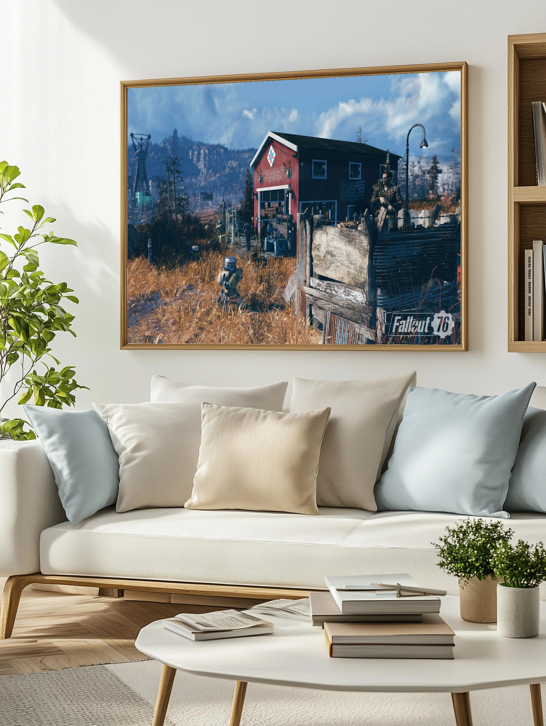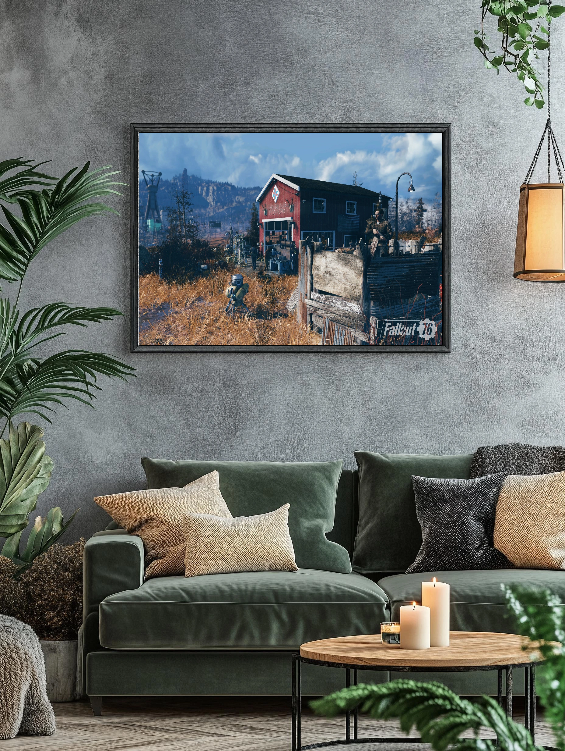 Изображение представляет атмосферный постапокалиптический пейзаж из игры Fallout 76. На переднем плане виден робот помощник и огороженная территория с деревянным забором, на заднем плане красное здание с названием «The Devil’s Toothwork». Вокруг раскинулась сухая трава и гористый ландшафт, что создаёт ощущение заброшенности и выживания. Цветовая палитра с преобладанием коричневого, красного и синего придаёт сцене выразительность и глубину. Это отличный декоративный плакат и интерьерное искусство для фанатов видеоигр.