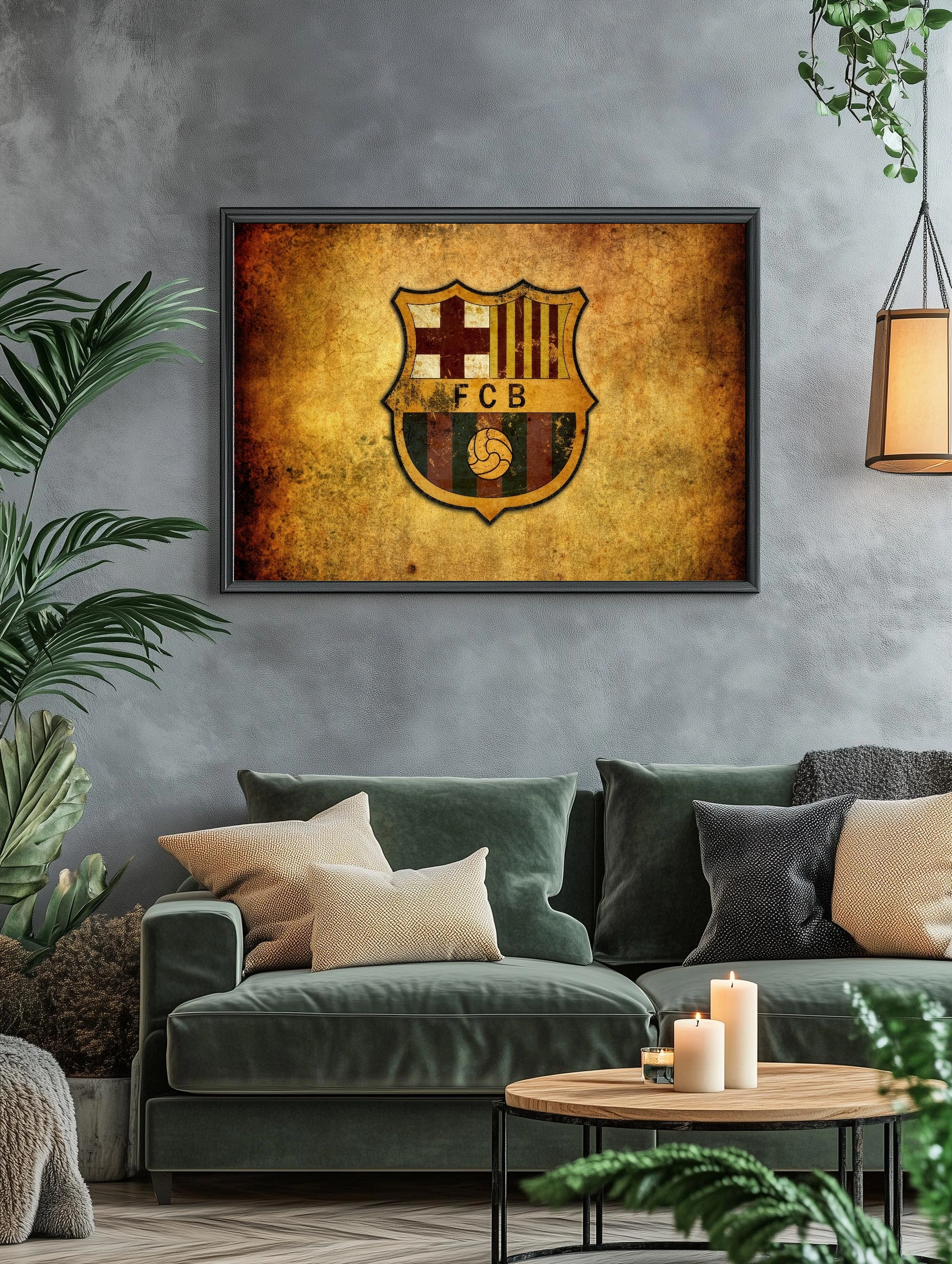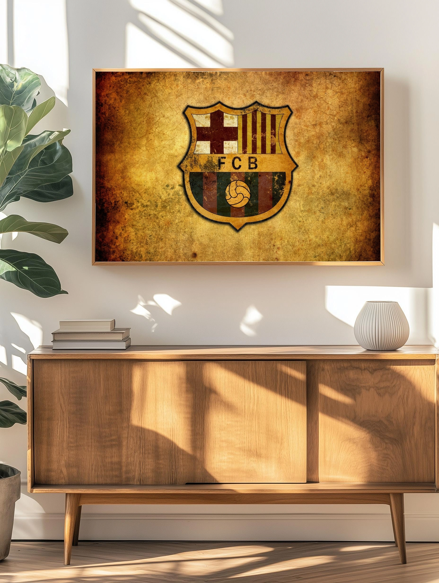 Изображен герб футбольного клуба FC Barcelona в винтажном стиле с эффектом состаренной бумаги. Доминируют насыщенные оттенки жёлтого и коричневого, создавая атмосферу истории и традиций. Этот интерьерный плакат идеально дополнит гостиную или офис, добавляя современное искусство для стен с акцентом на спорт.