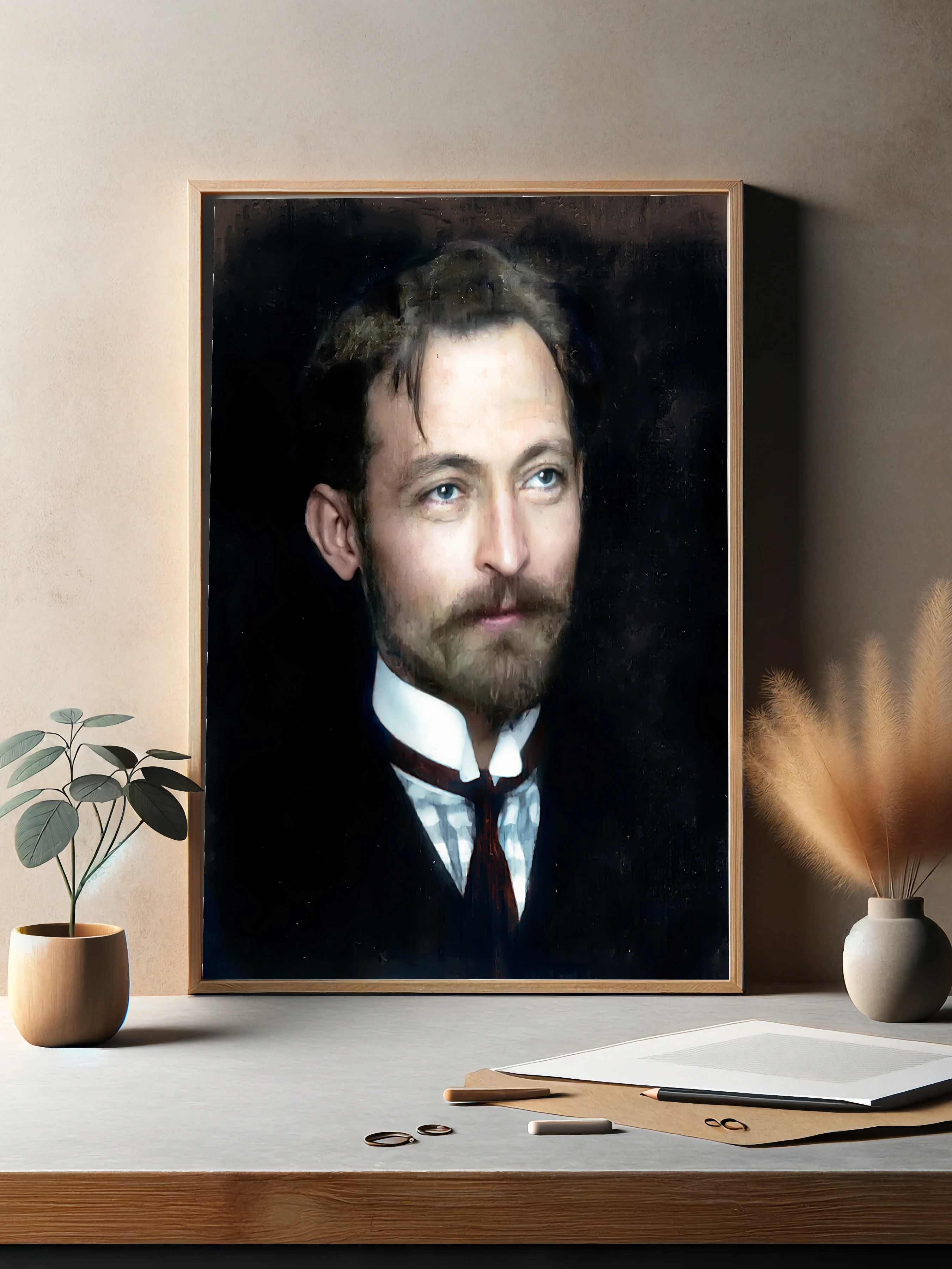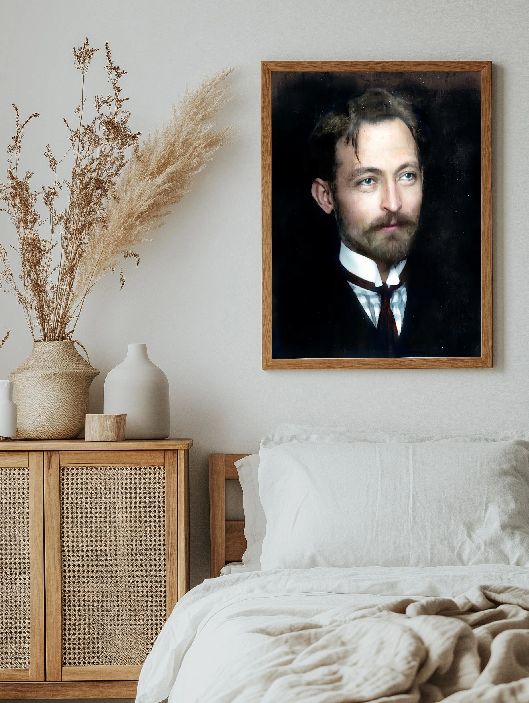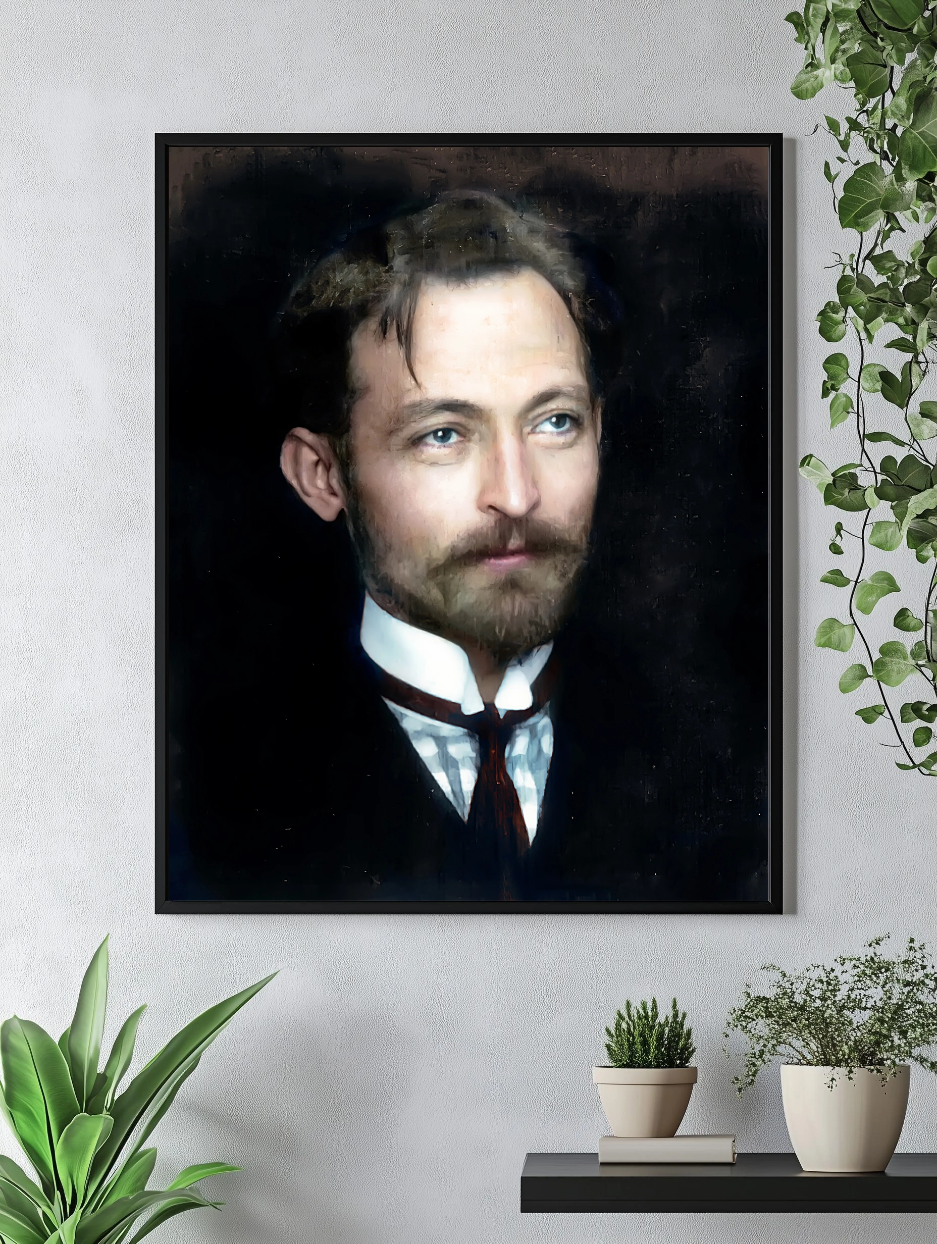 Изображён портрет мужчины с бородой и голубыми глазами на тёмном фоне, выполненный в классическом живописном стиле. Лицо выделяется светлыми тонами, что создаёт контраст с почти чёрным фоном, подчёркивая глубину и задумчивость образа. Идеально для современного искусства для стен, интерьерного декора, уникальной картины для дома, декоративного плаката в рамке или художественного плаката.