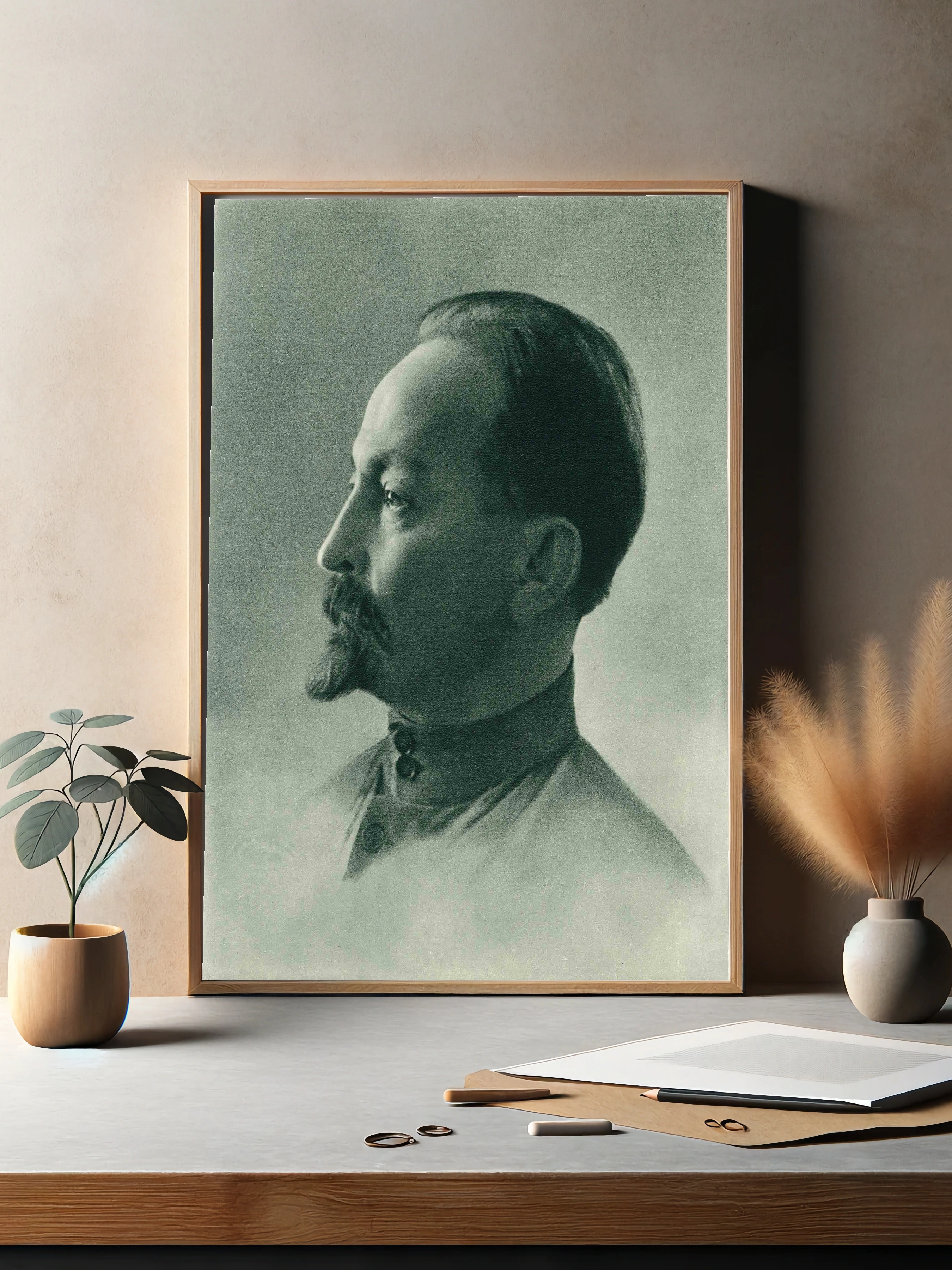 Данный арт представляет собой чёрно-белую фотографию в ретро-стиле с мужским портретом в профиль. Светлые и тёмные оттенки создают атмосферу спокойствия и глубокой задумчивости. Этот интерьерный постер отлично дополнит гостиную, кабинет или спальню, добавляя стильный и классический акцент в любой интерьер.