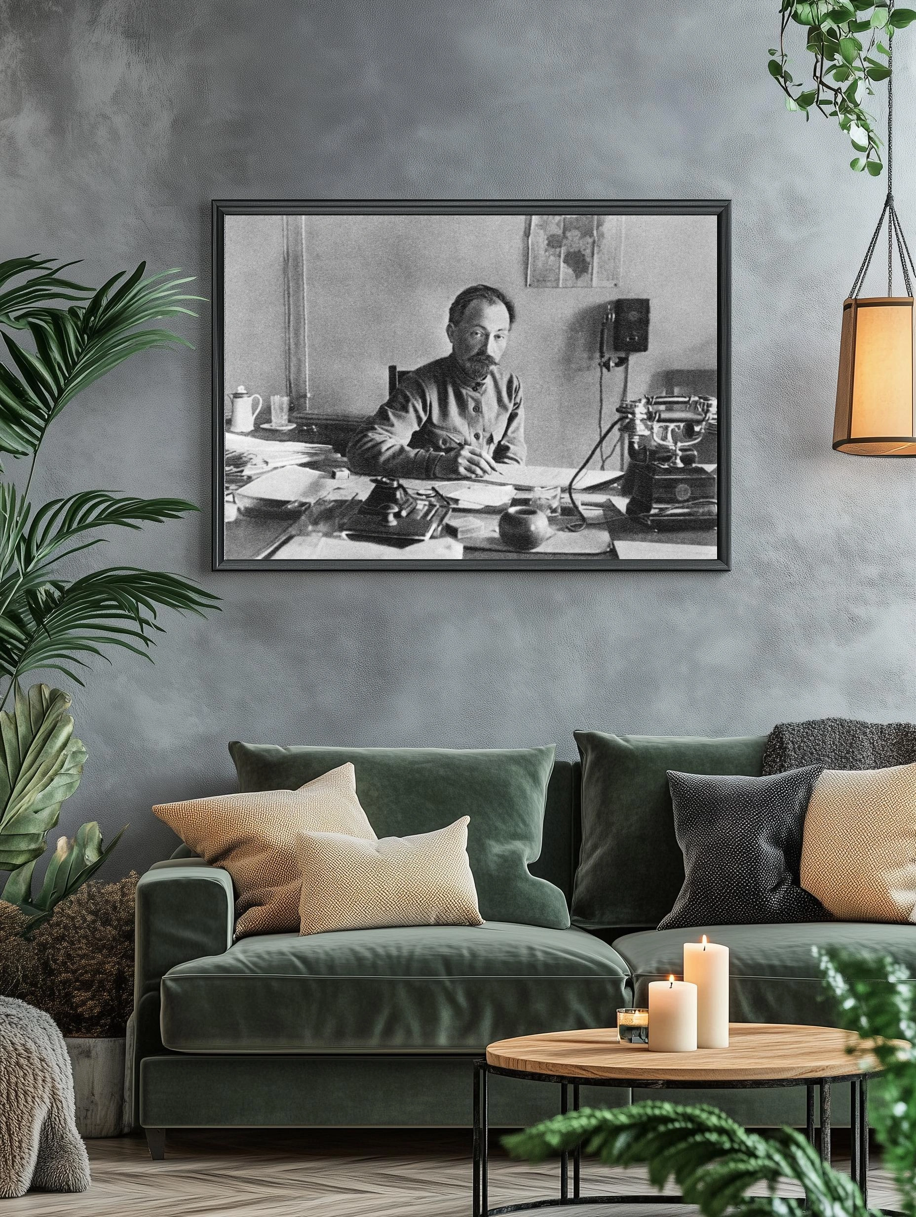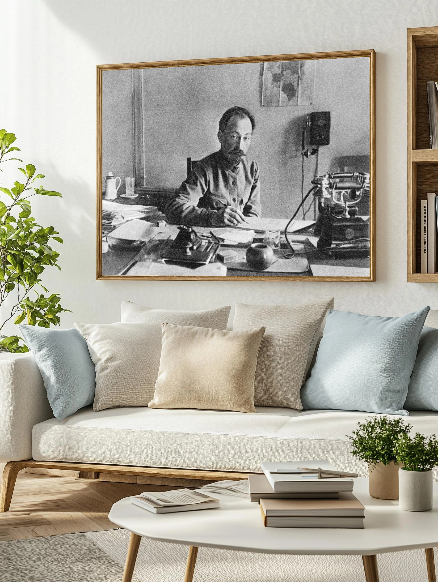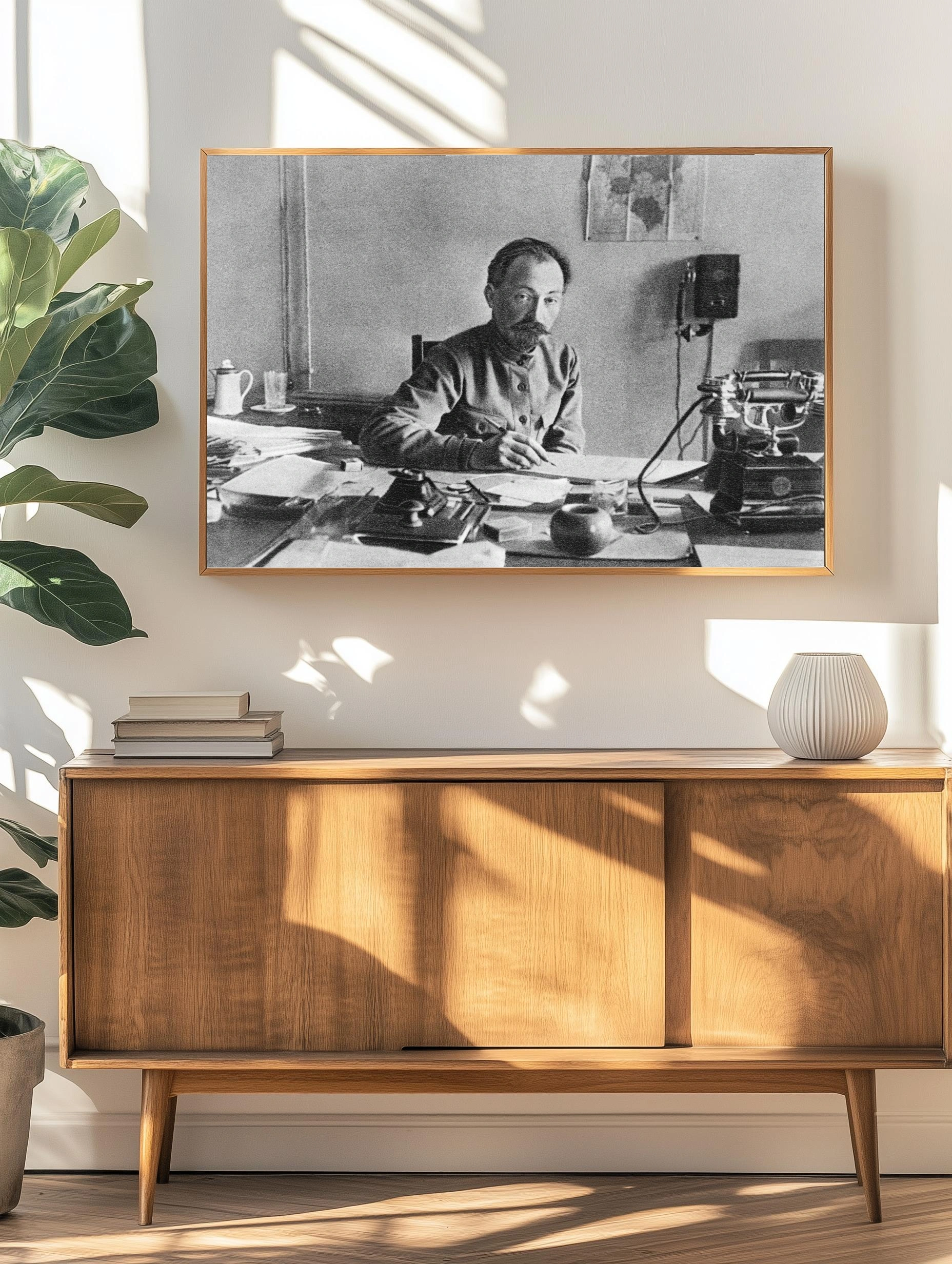Черно-белое историческое фото, изображающее мужчину в офисе прошлого столетия. На столе расположены письменные принадлежности, старая телефонная аппаратура и другие предметы эпохи. Атмосфера снимка передает строгость и сосредоточенность рабочего процесса. Уникальное интерьерное искусство, подчеркивающее важность прошлого в современном декоре.