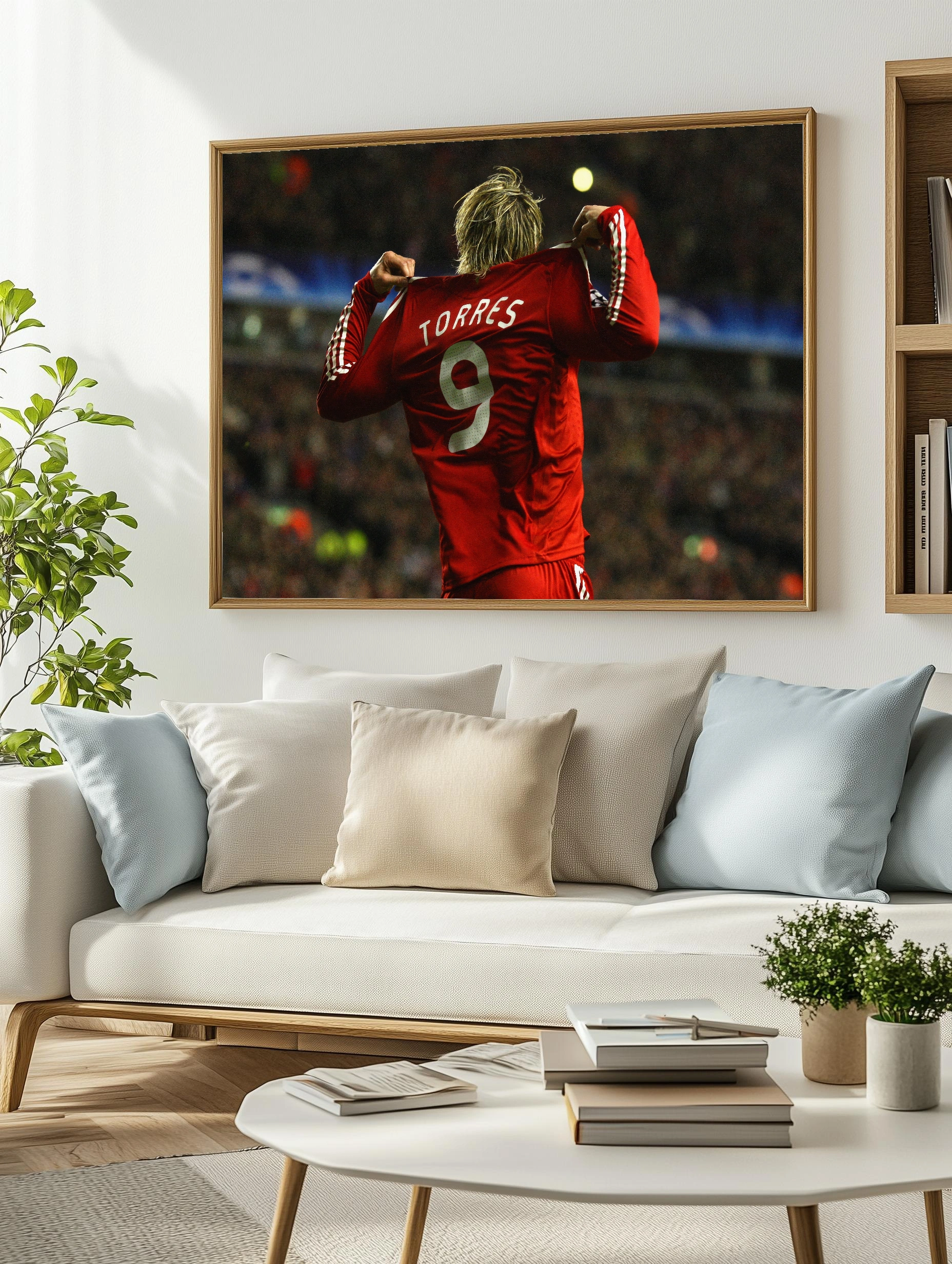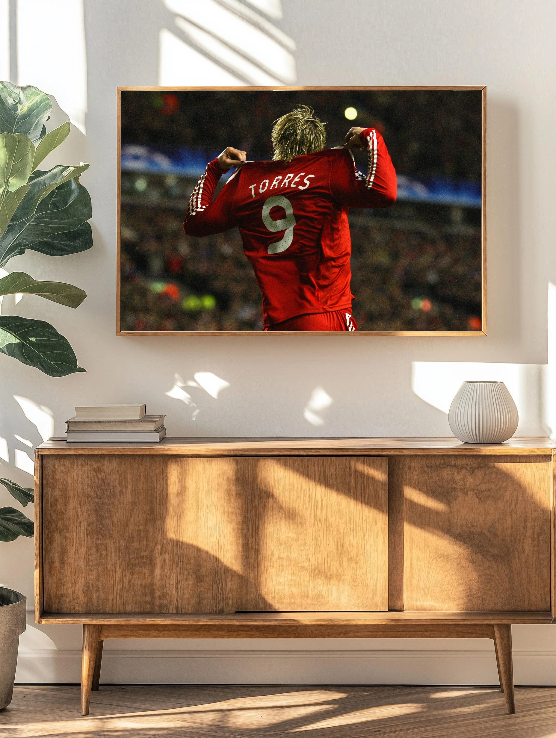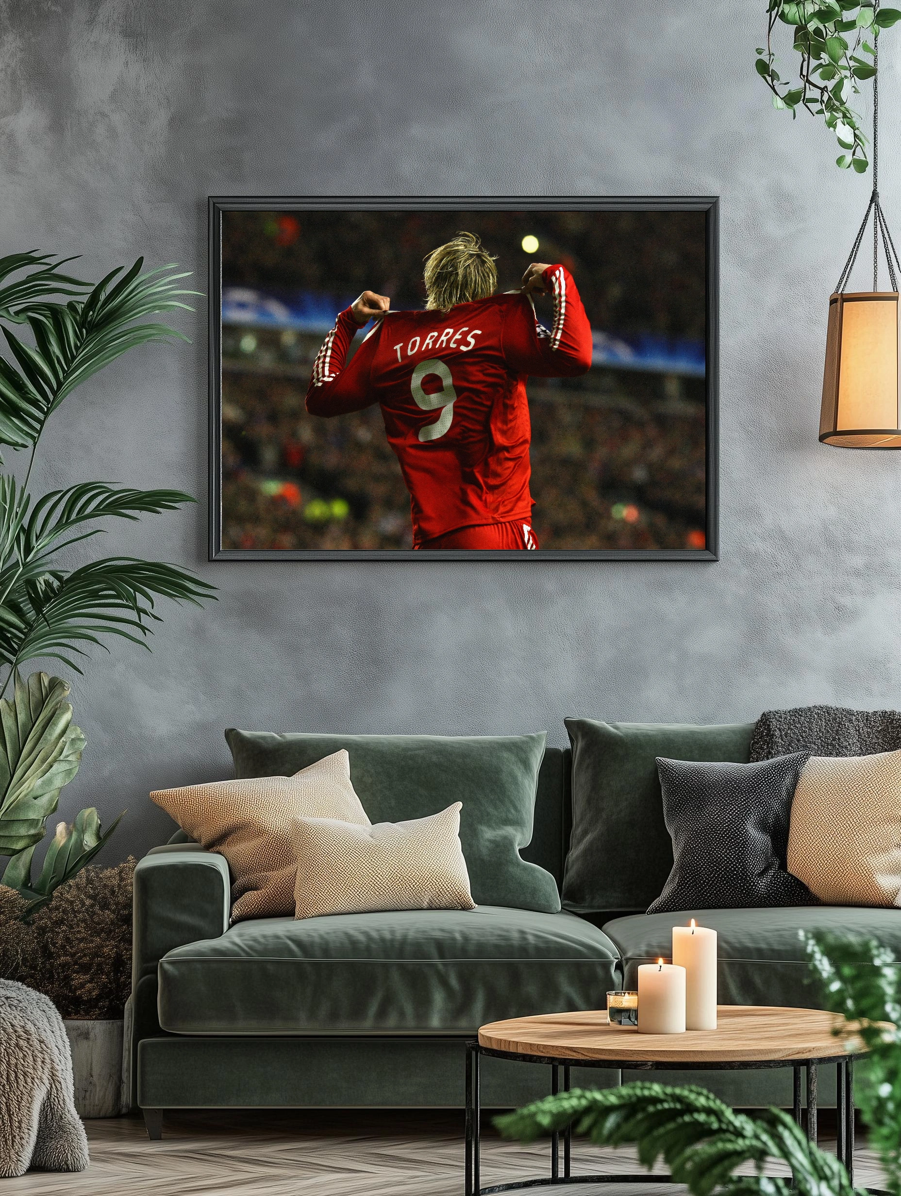 На изображении запечатлен известный футболист Фернандо Торрес в красной форме с номером 9 на спине. Спортсмен поднял джерси, выражая эмоции триумфа и силы. Фон размытый, театральная атмосфера стадиона передает напряженность и энергию спортивного события. Это уникальное художественное изображение для современного интерьера и спортивных фанатов.