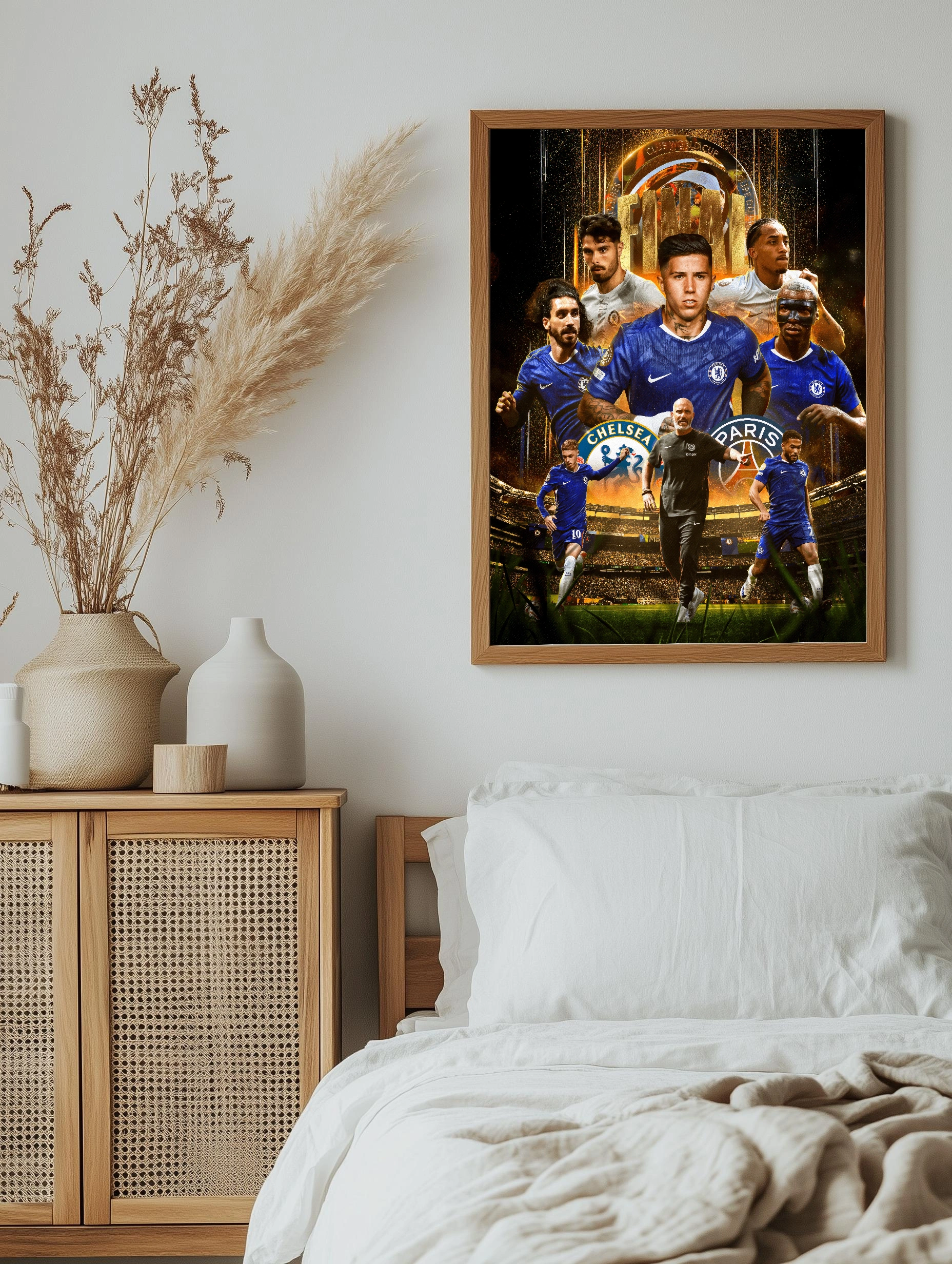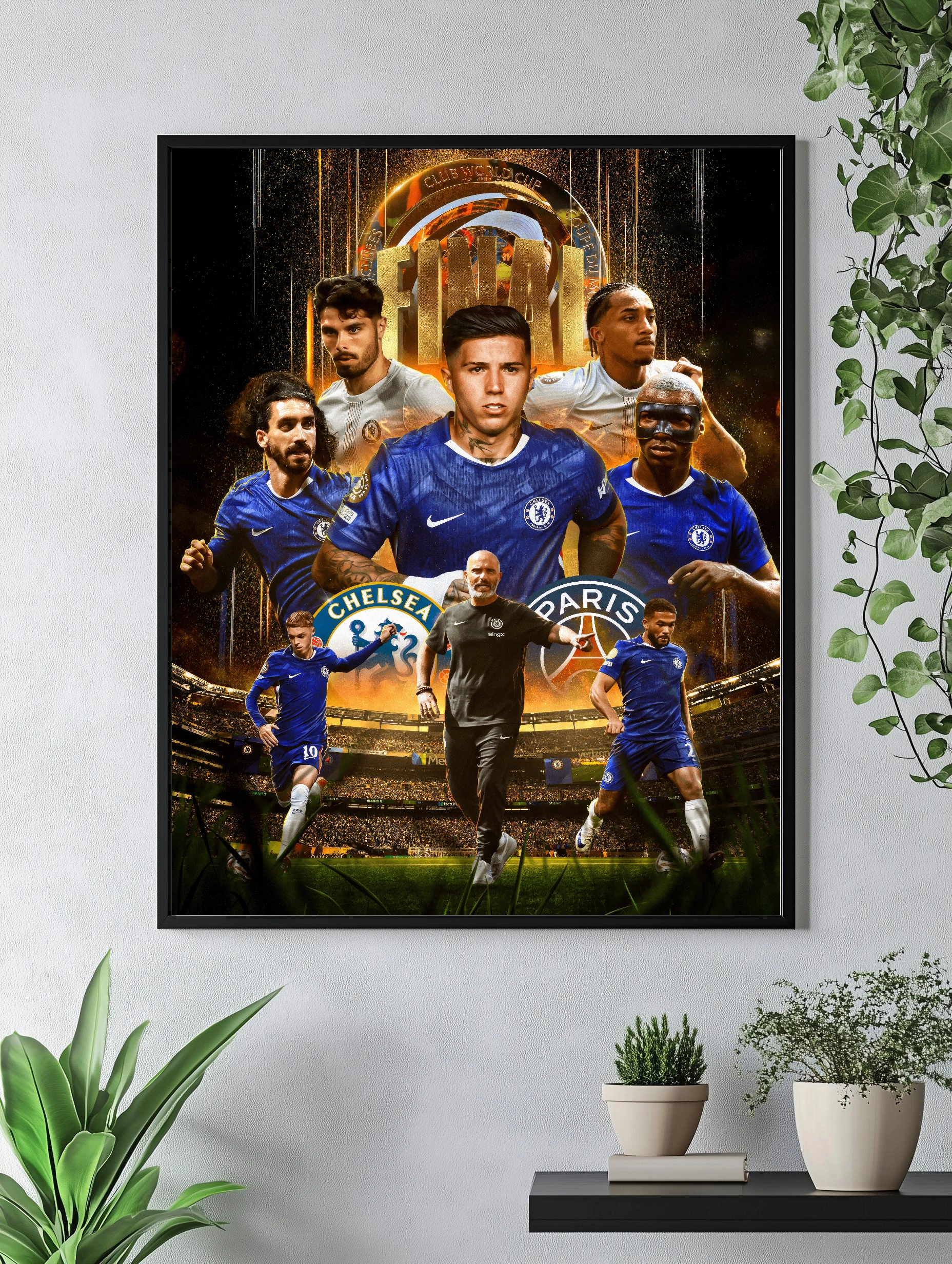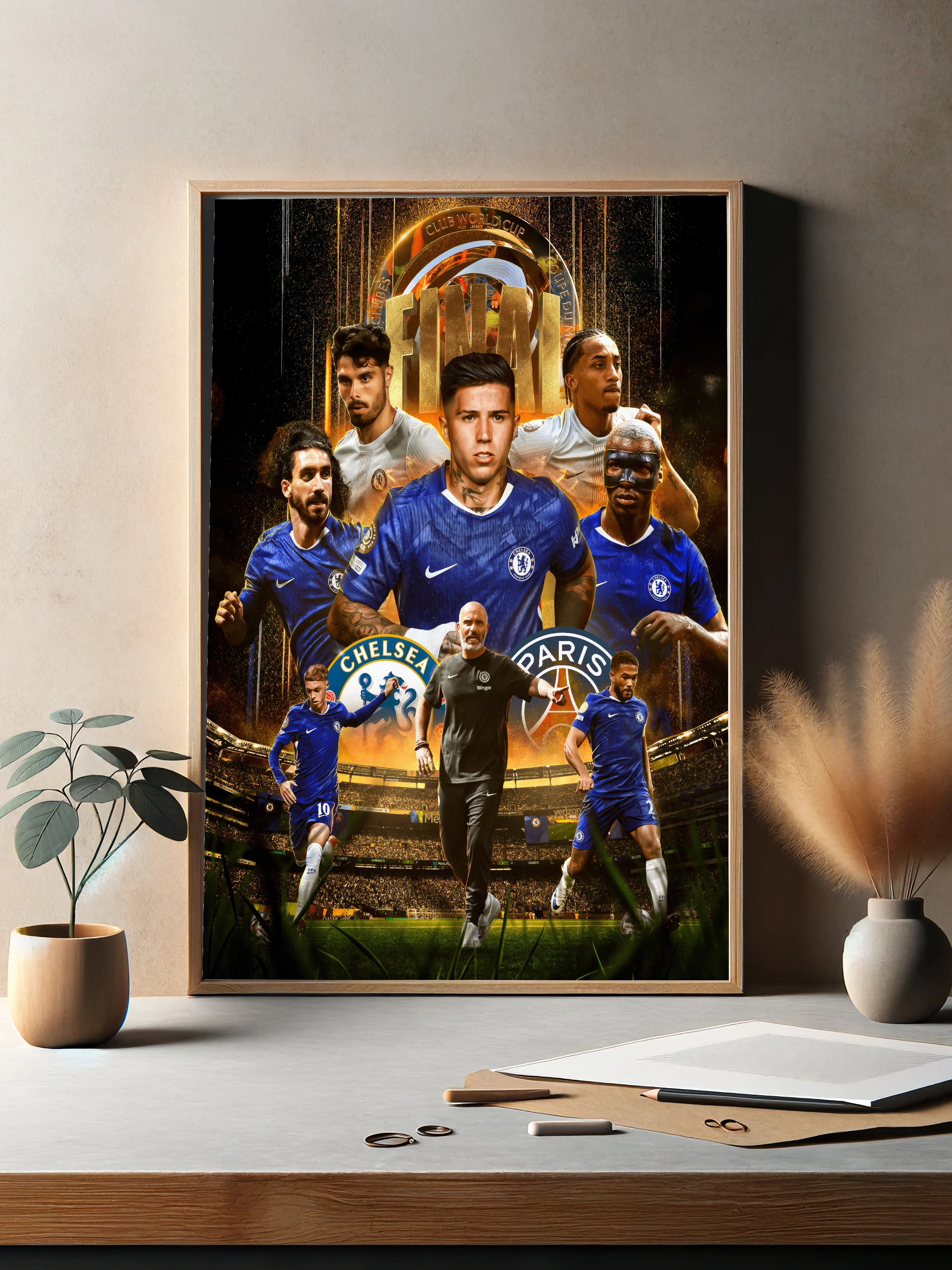 Декоративный плакат в стиле цифровой живописи, изображающий ключевых игроков футбольного клуба Челси на фоне логотипов клубов Челси и Париж и арены стадиона. В композиции преобладают динамичные позы футболистов и тренера, передающие напряжение финала Лиги чемпионов. Картина для гостиной или офиса для поклонников футбола и современного искусства.