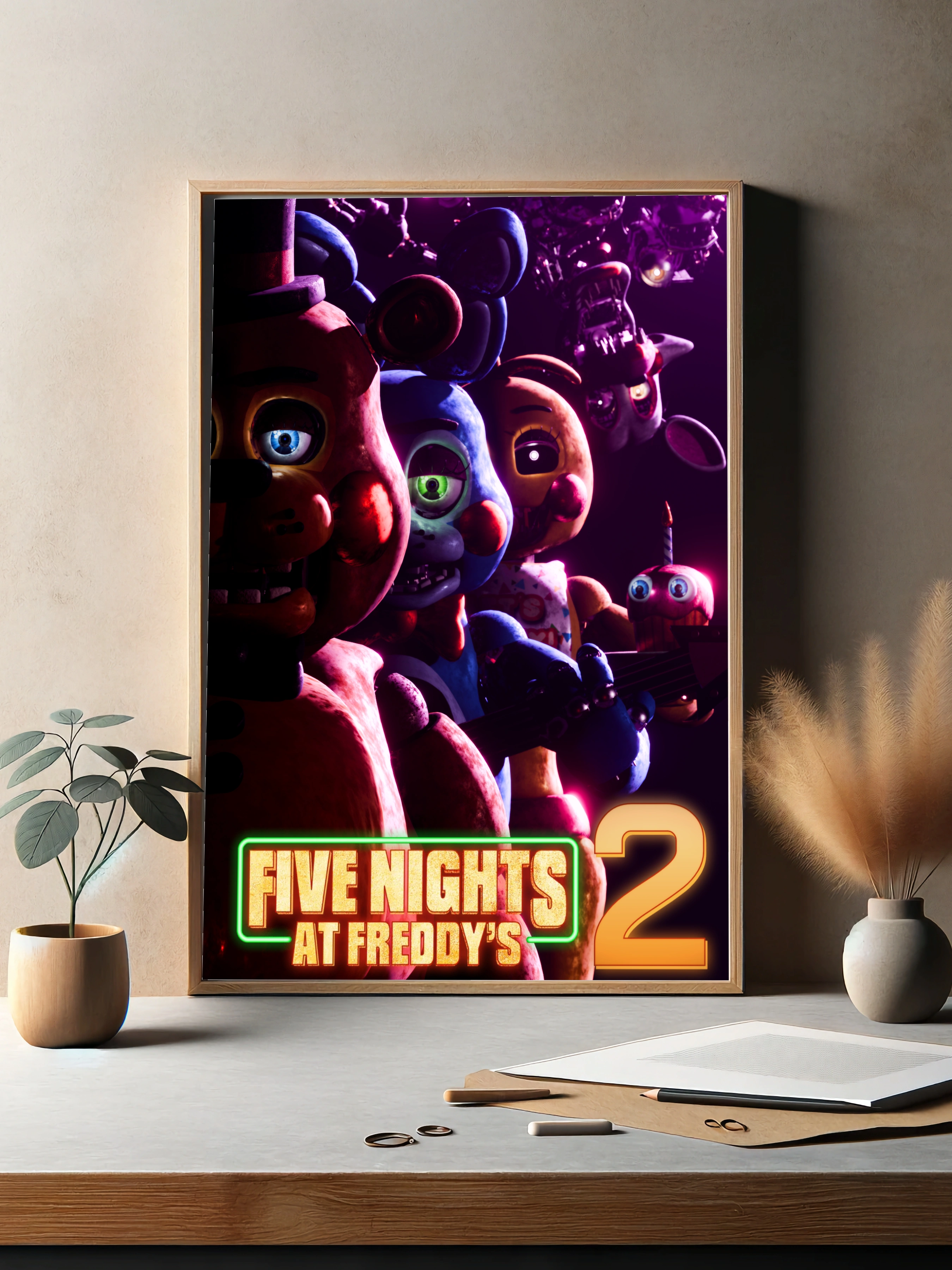 Захватывающий интерьерный плакат по мотивам игры Five Nights at Freddy’s 2. На изображении четко видны несколько аниматроников, выполненных в темных и мрачных тонах, создающих напряжённое и загадочное настроение. Картина для спальни или офиса подойдет любителям хоррора и компьютерных игр.