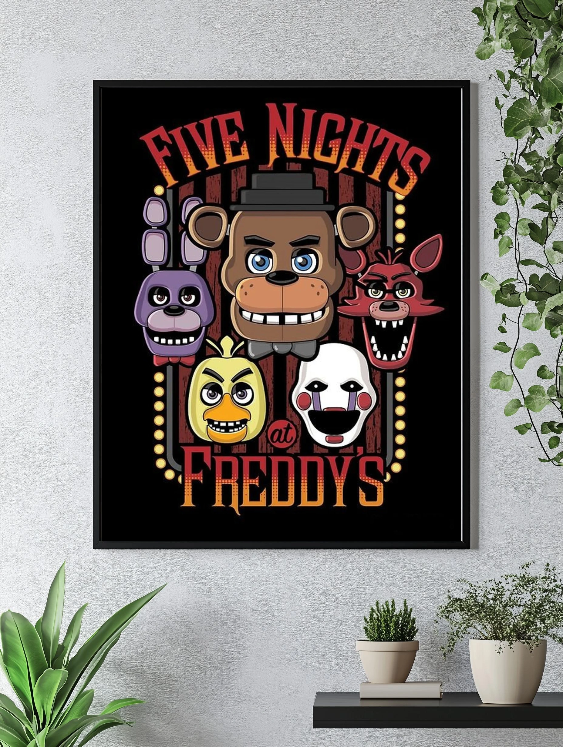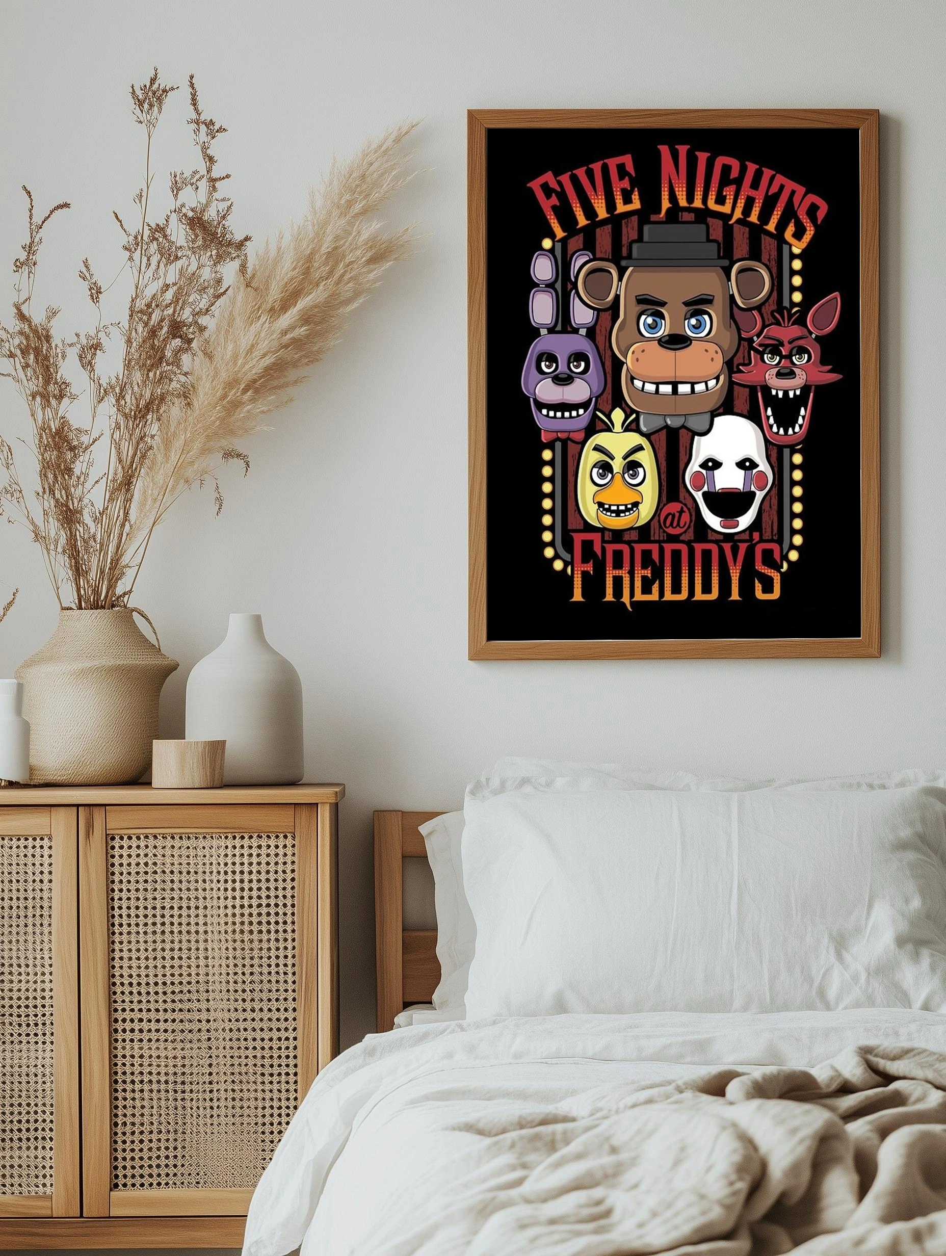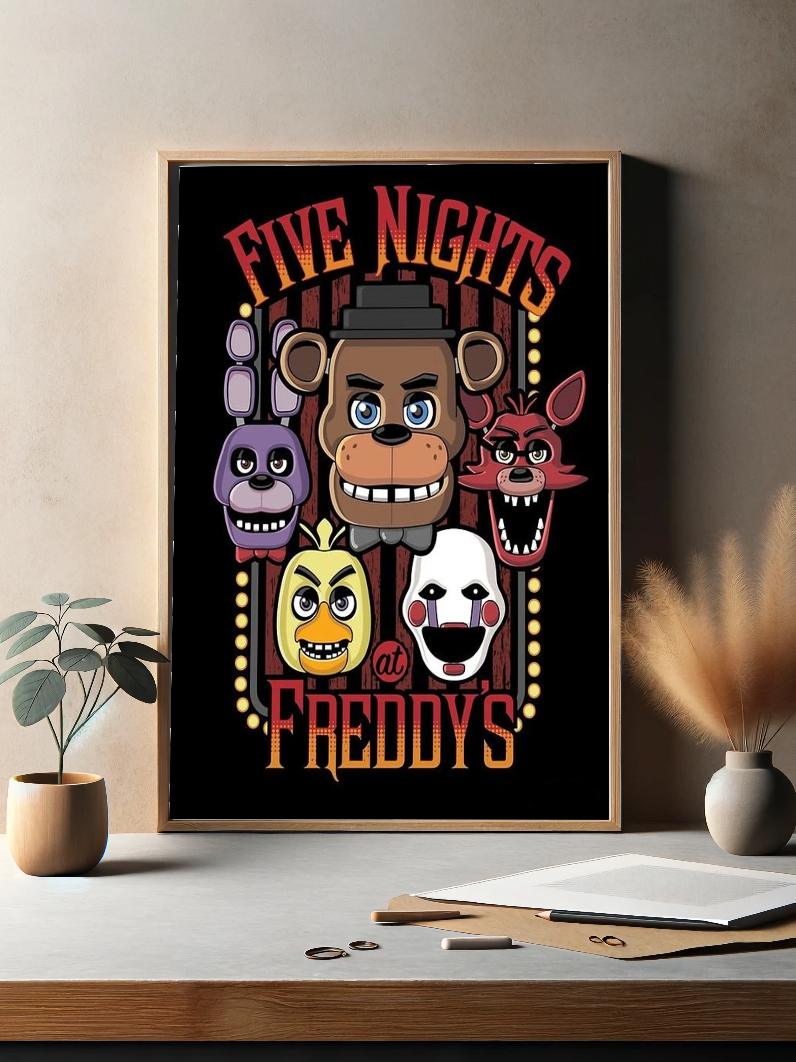 Декоративный плакат с персонажами из игры Five Nights at Freddy’s — знакомые роботы-animatronics: Фредди, Бонни, Фокси, Чика и Портер, выполнены в ярком мультяшном стиле с контрастными цветами на темном фоне. Яркий интерьерный арт для стильного декора стен в игровой или детской комнате.