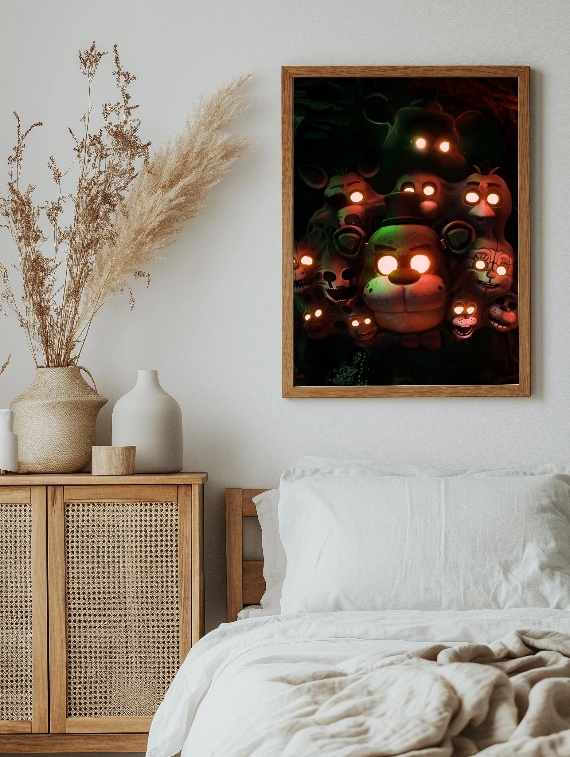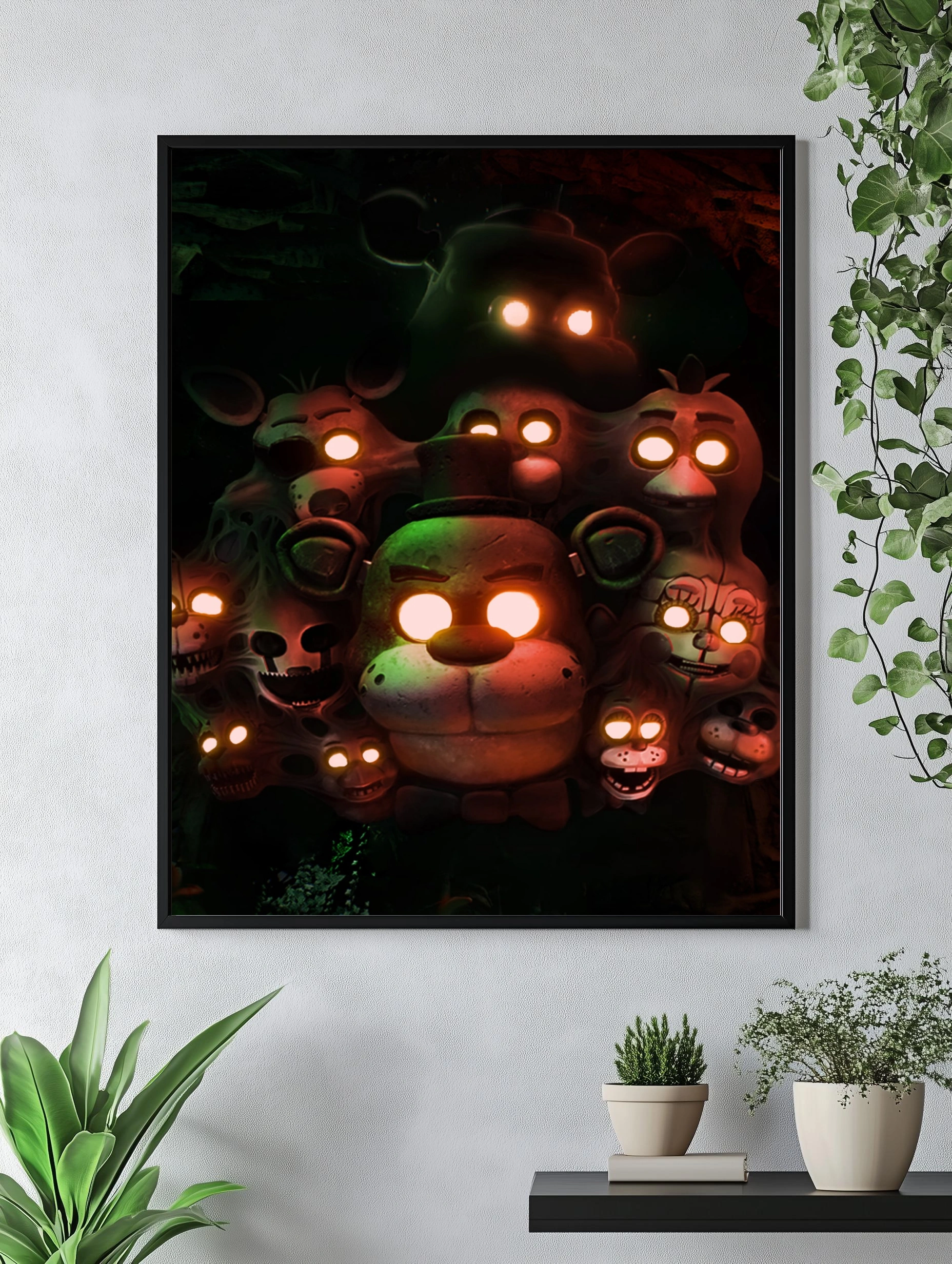 На изображении представлен известный персонаж Фредди Фазбер из популярной игры Five Nights at Freddy’s вместе с другими аниматрониками. Темное освещение и светящиеся глаза создают атмосферу напряжения и страха. Такой художественный плакат отлично подойдет для оформления интерьера фанатов хоррора и игр.