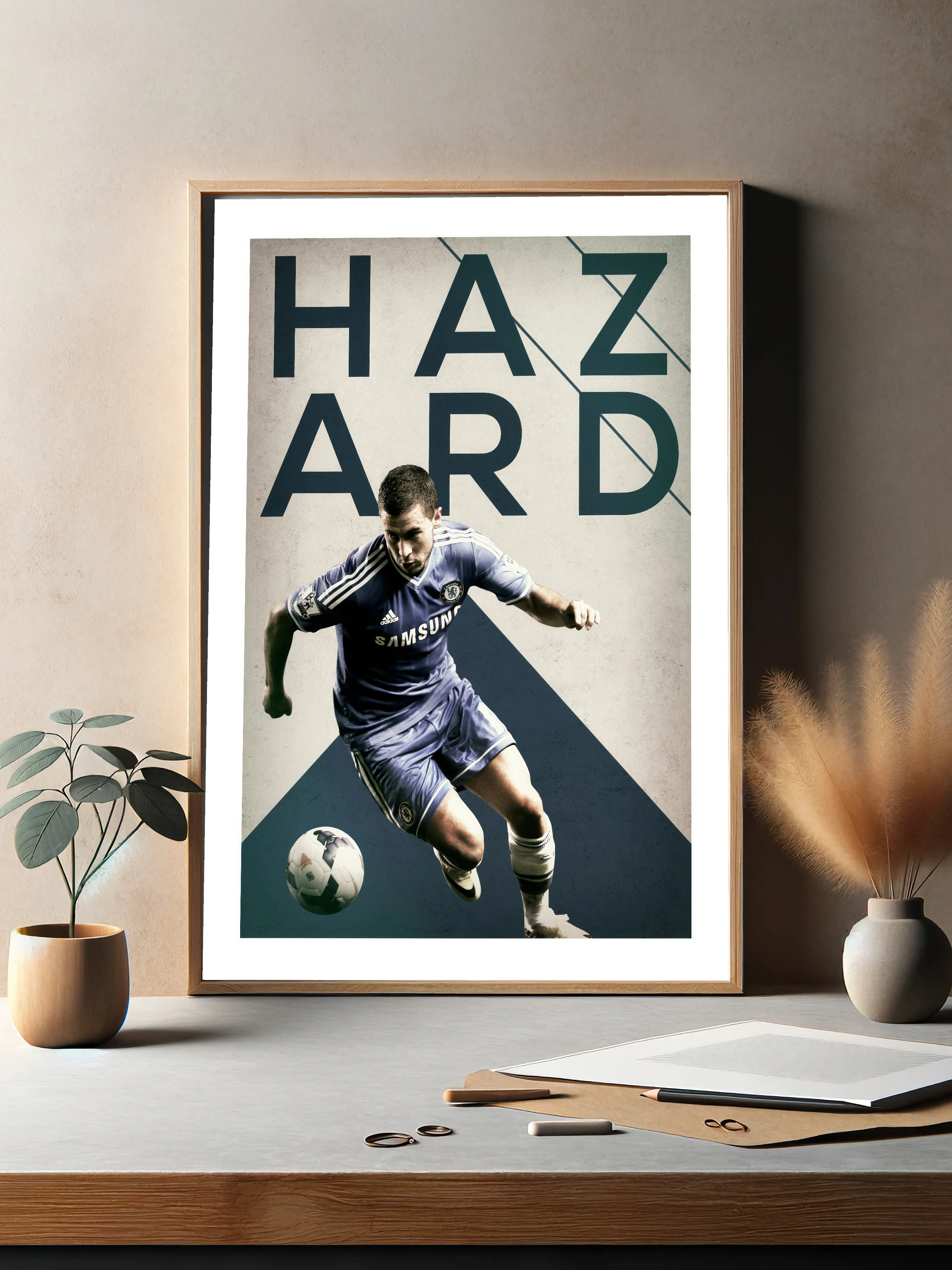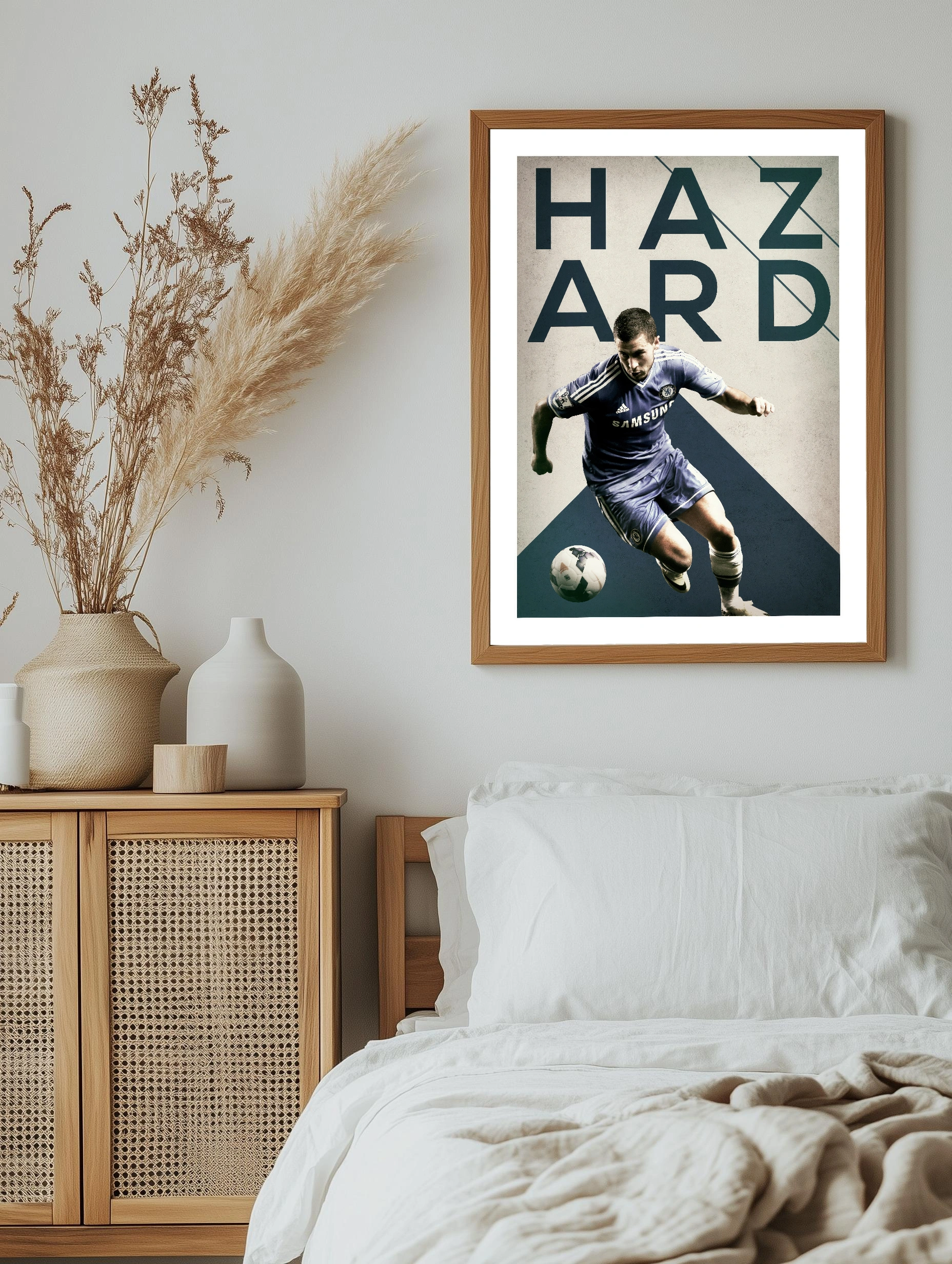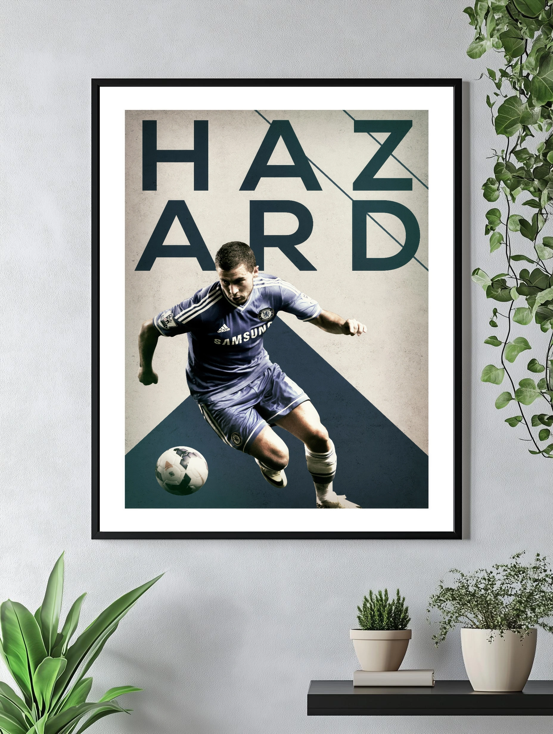 Изображён футболист в движении на фоне графического дизайна с крупными буквами ‘HAZARD’. Спортсмен одет в форму с синими, белыми и чёрными оттенками. Современное искусство для стен с ярко выраженной динамикой и энергией движения. Отличный интерьерный декор, подходящий для гостиной или офиса.