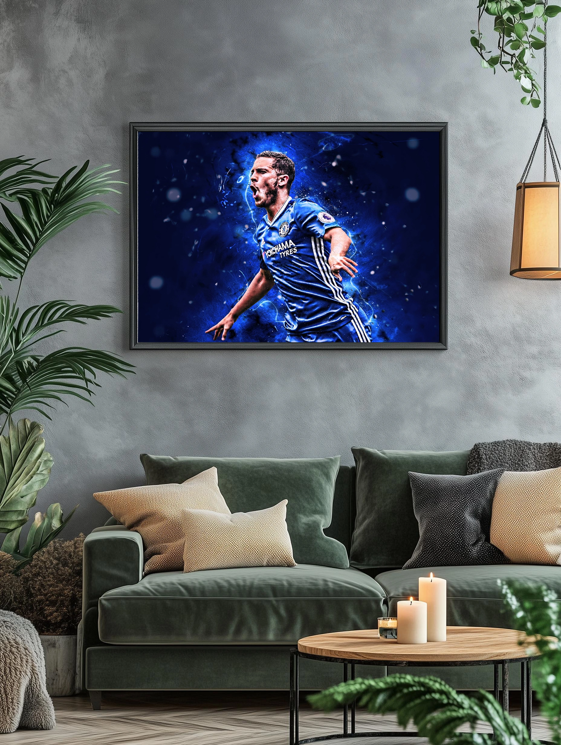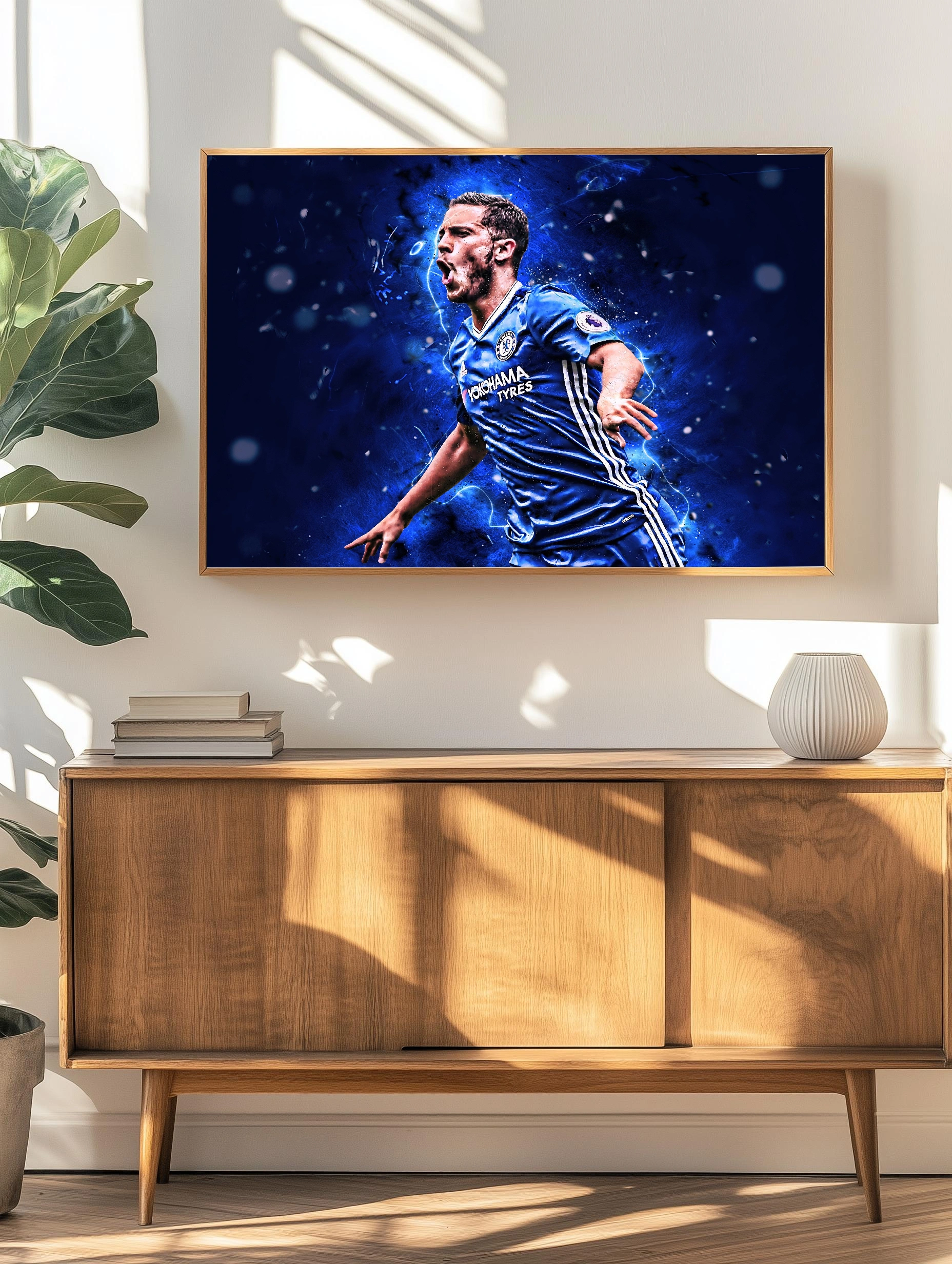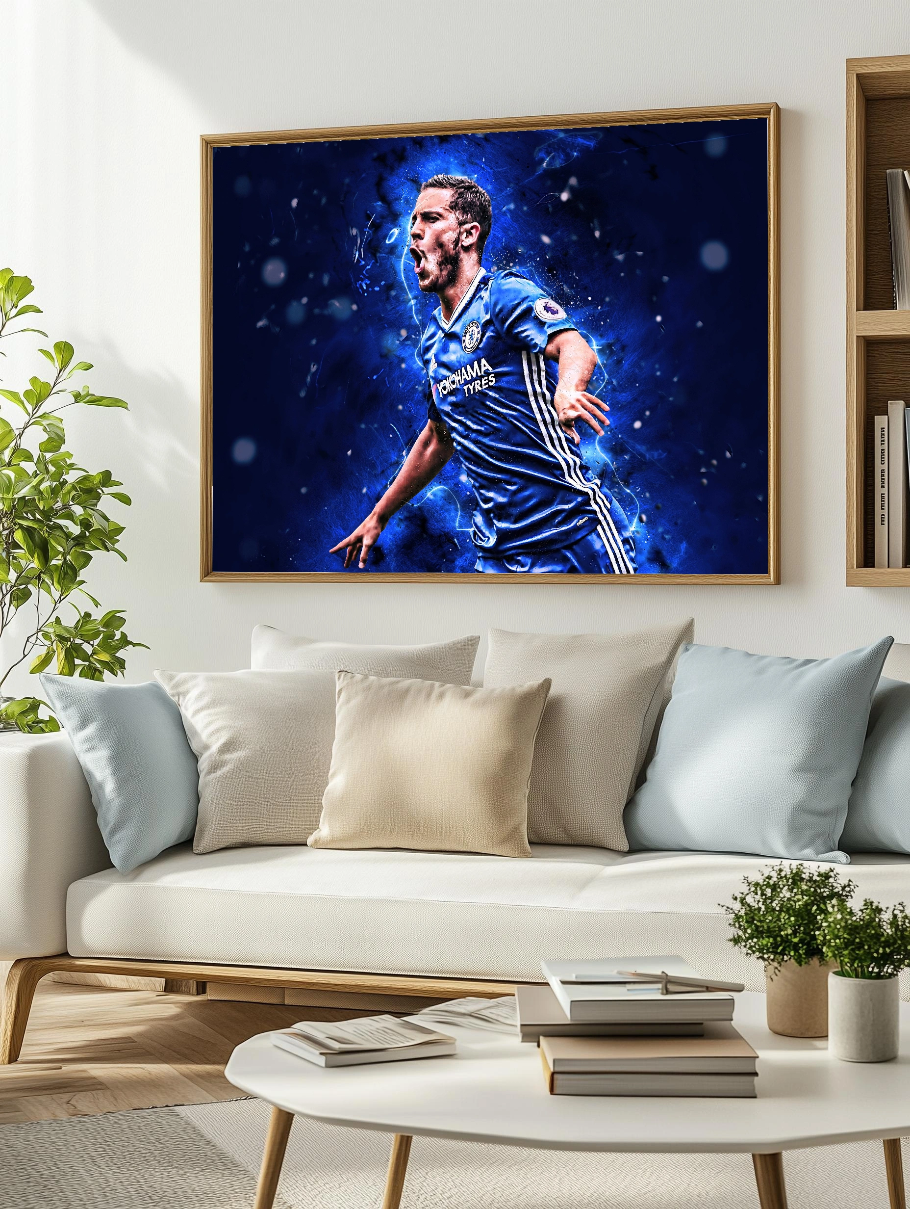 Декоративный плакат с изображением футболиста в форме Челси в динамичном порыве, выполненный в ярких синих тонах. Настенный декор передает энергетику и страсть игры, идеально подходит для интерьера спортзала или уютной гостиной. Картина для офиса и дома с уникальным принтом футбольной тематики.