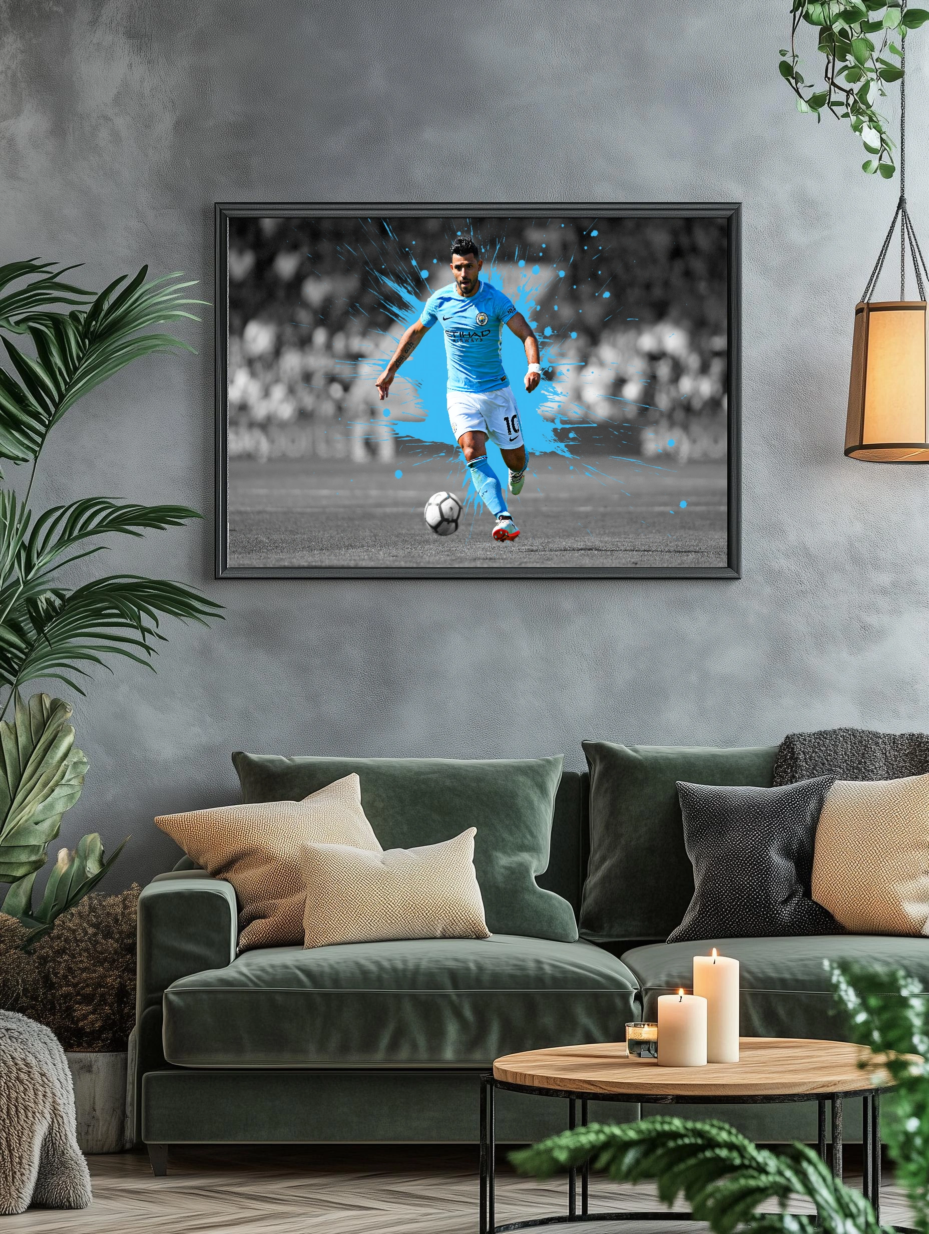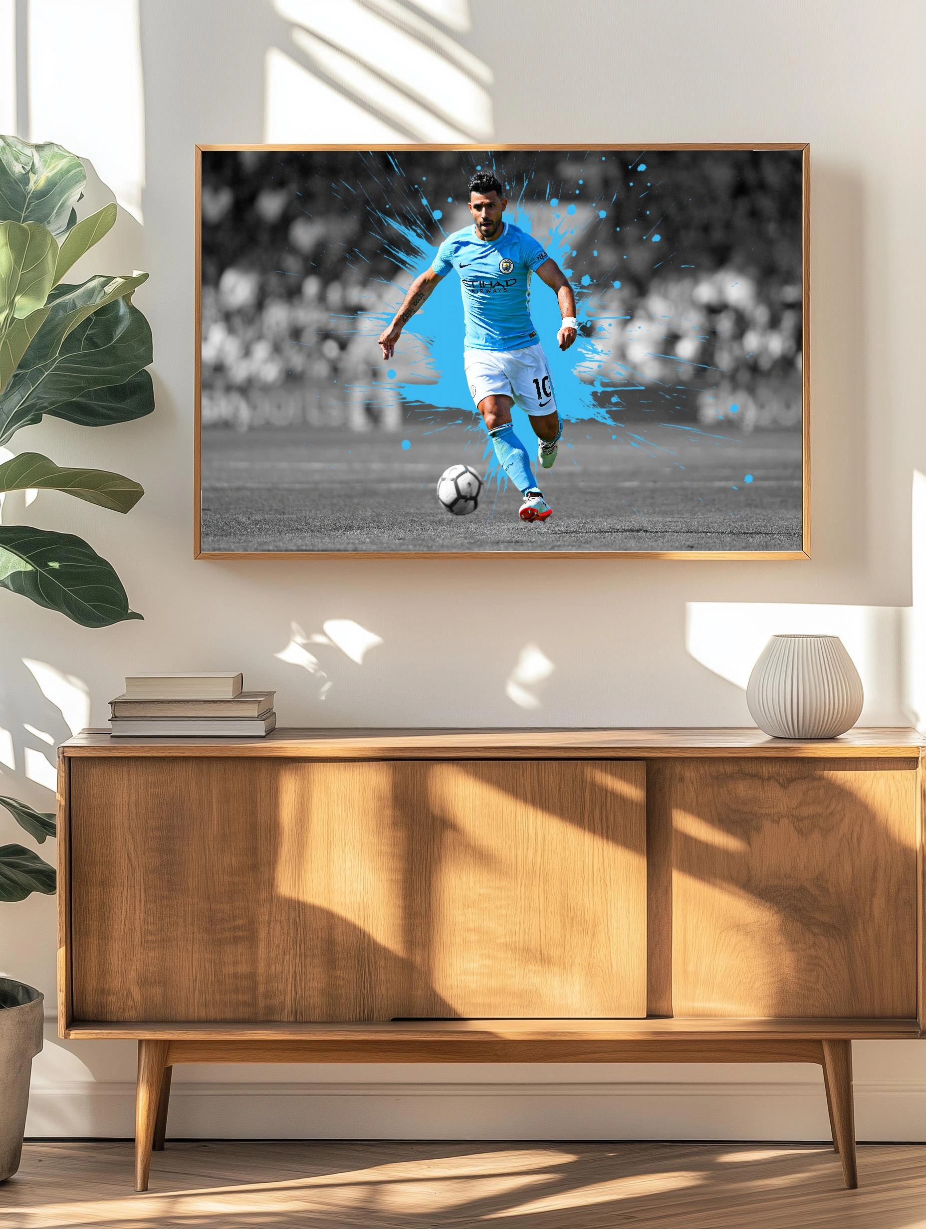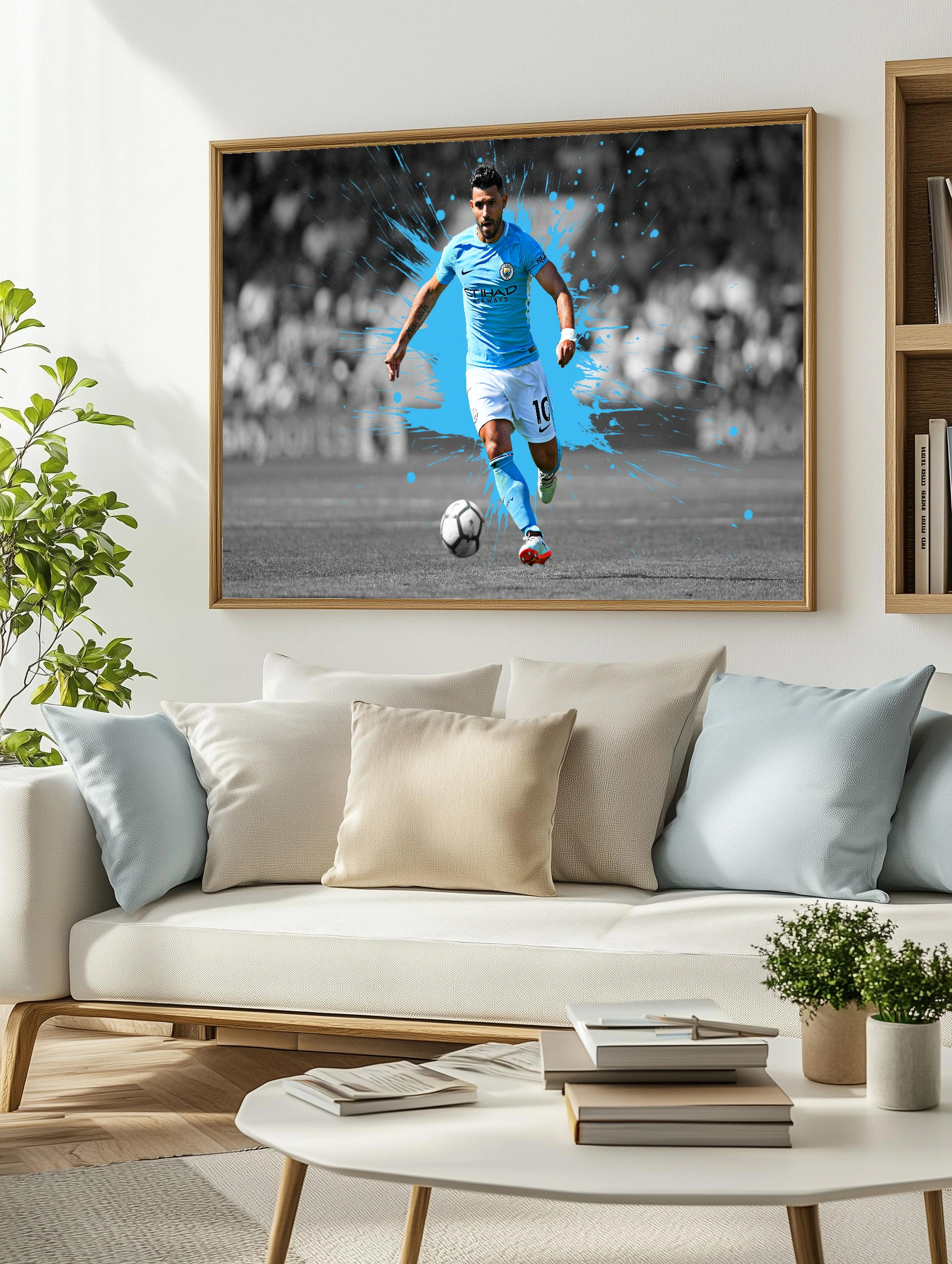 Изображение демонстрирует динамичное фото футболиста в форме Манчестер Сити с номером 10. Фон сделан в черно-белом стиле, а центральный персонаж выделен яркими голубыми красками в сочетании с белым. Картина для гостиной или офиса станет стильным декоративным элементом для любителей футбола и современного искусства.