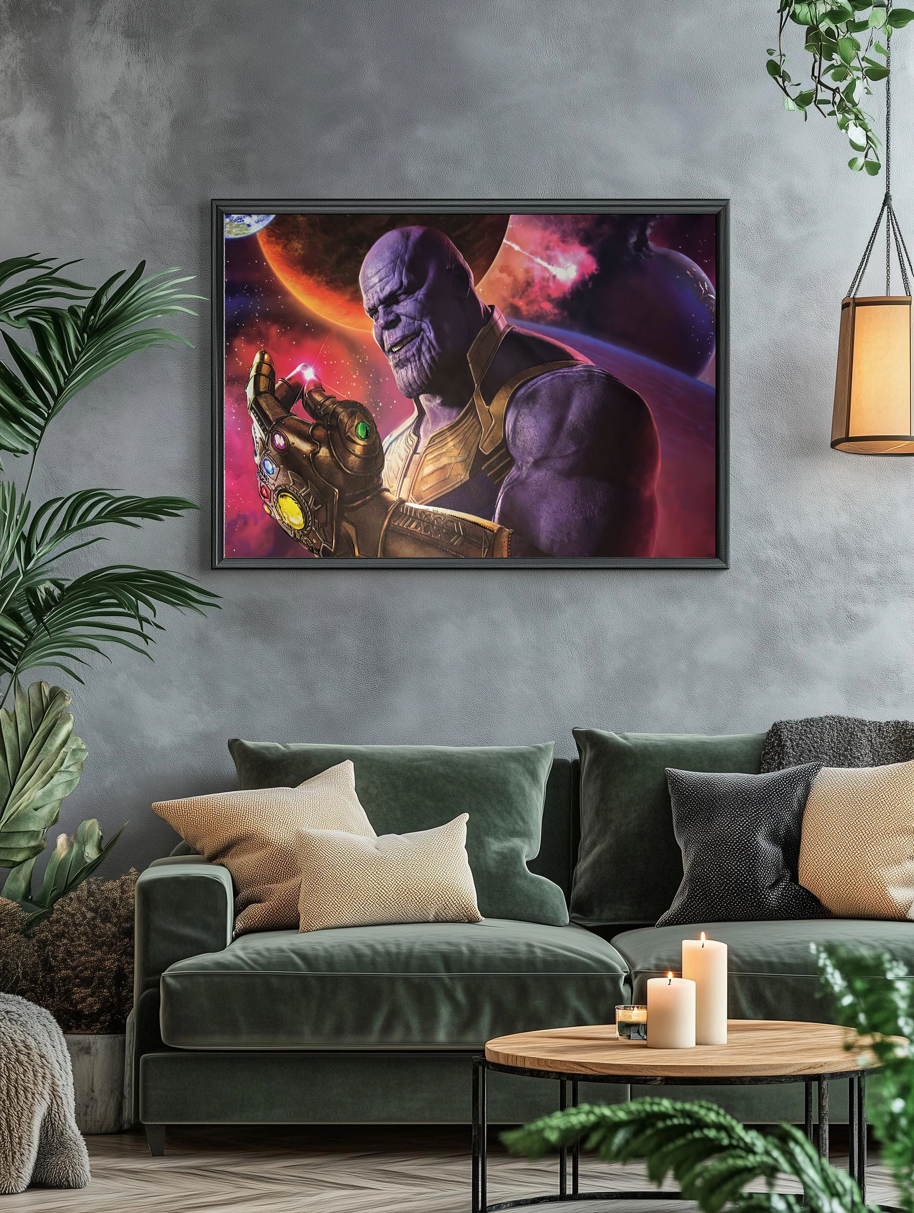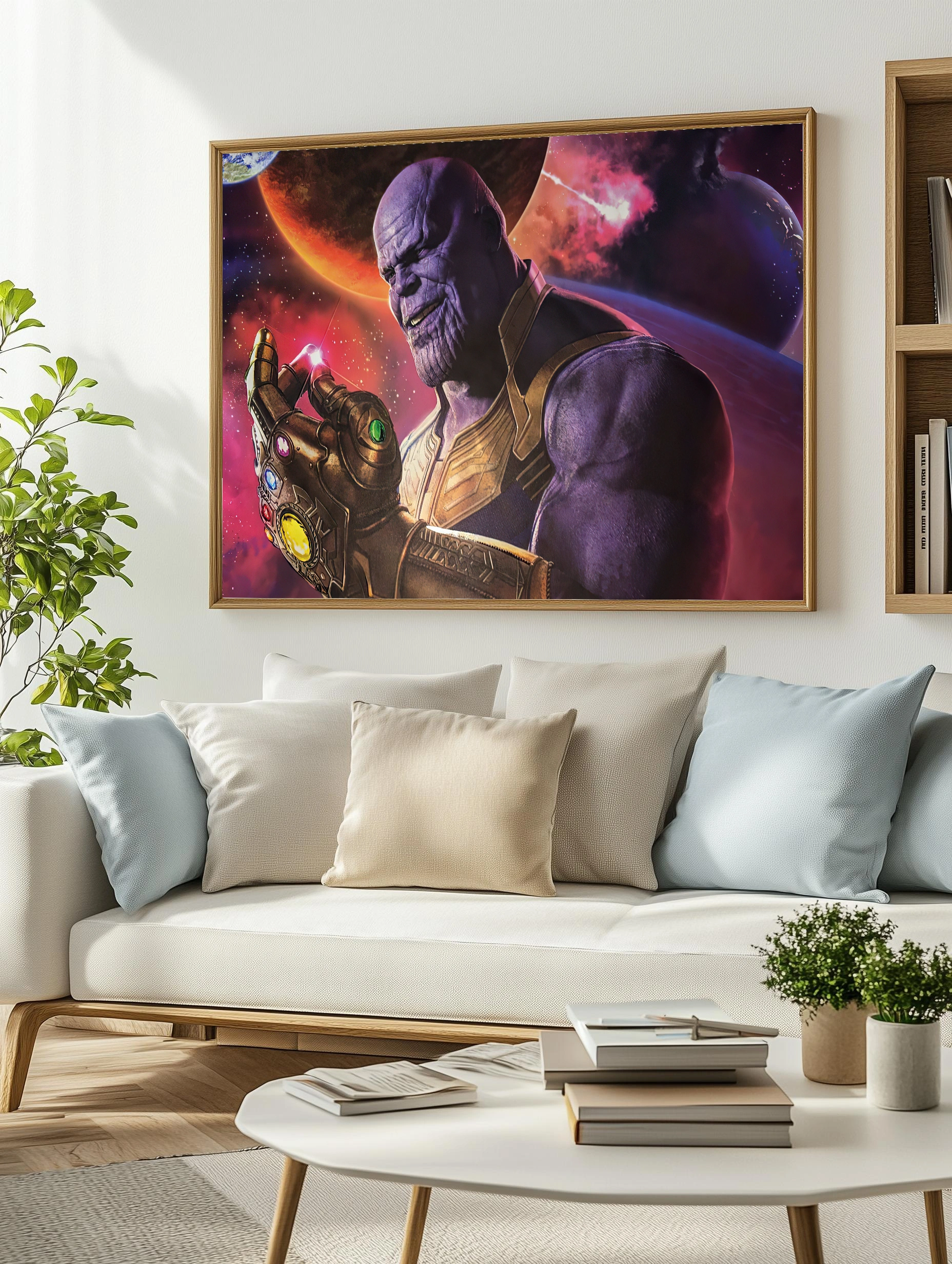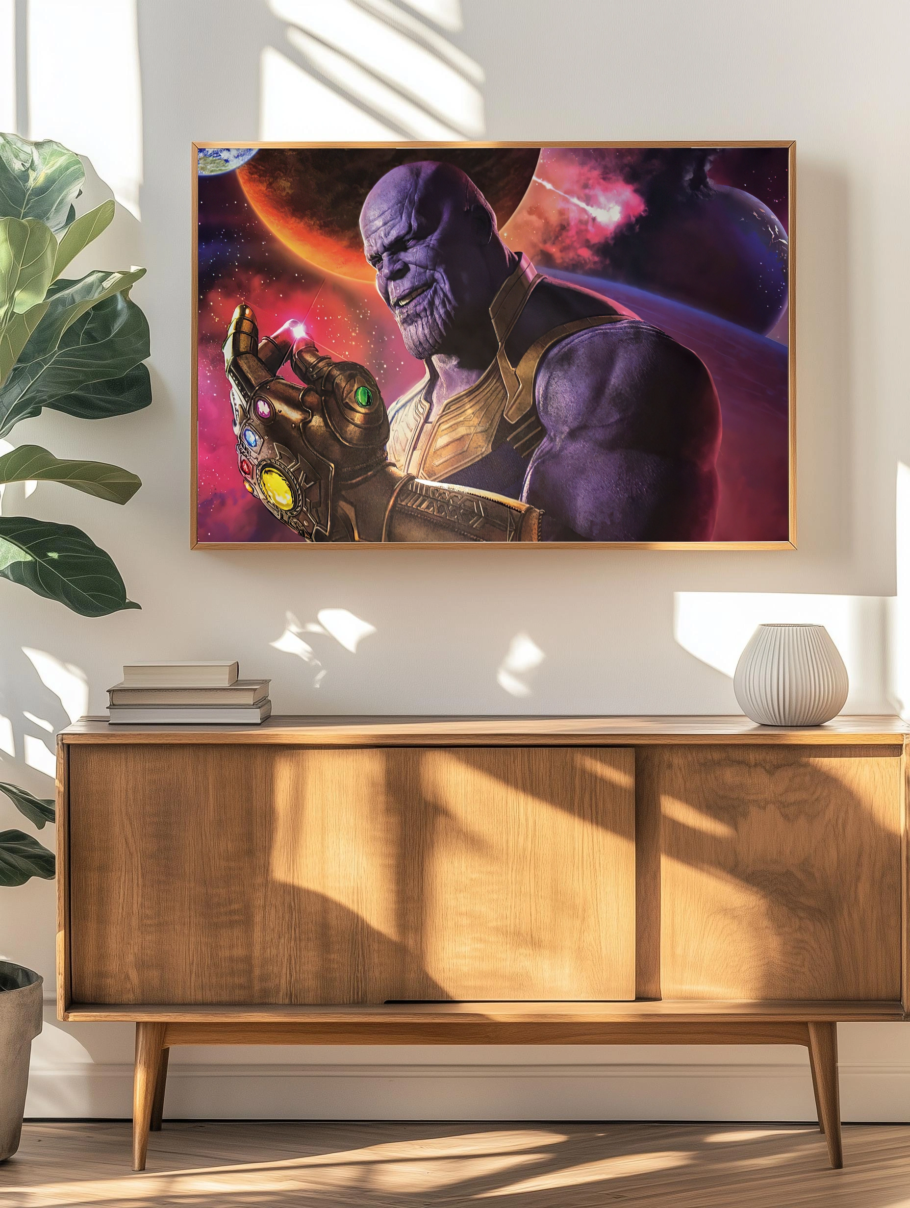 Изображение представляет Таноса — культового персонажа из вселенной Marvel — с Перчаткой Бесконечности, наполненной сверкающими Камнями Бесконечности. Фон оформлен в космическом стиле с планетами и взрывами, создавая атмосферу космического эпоса. Это современное искусство для стен отлично подойдет как декоративная картина для гостиной или офиса, добавляя мощь и динамику интерьеру.