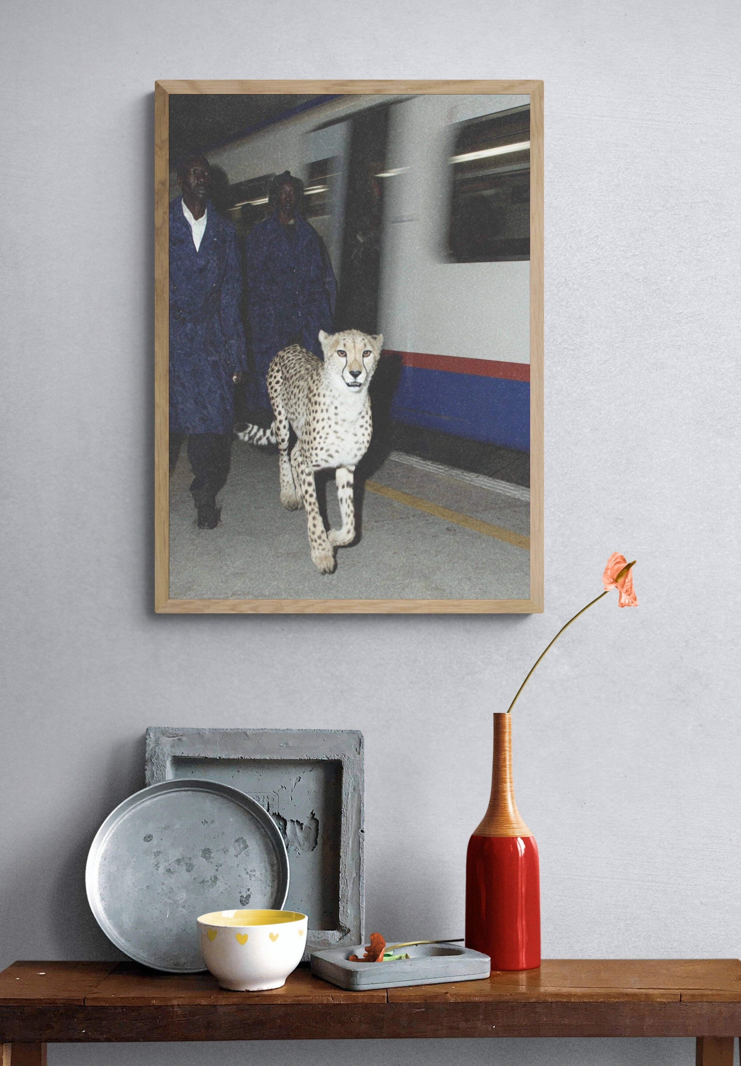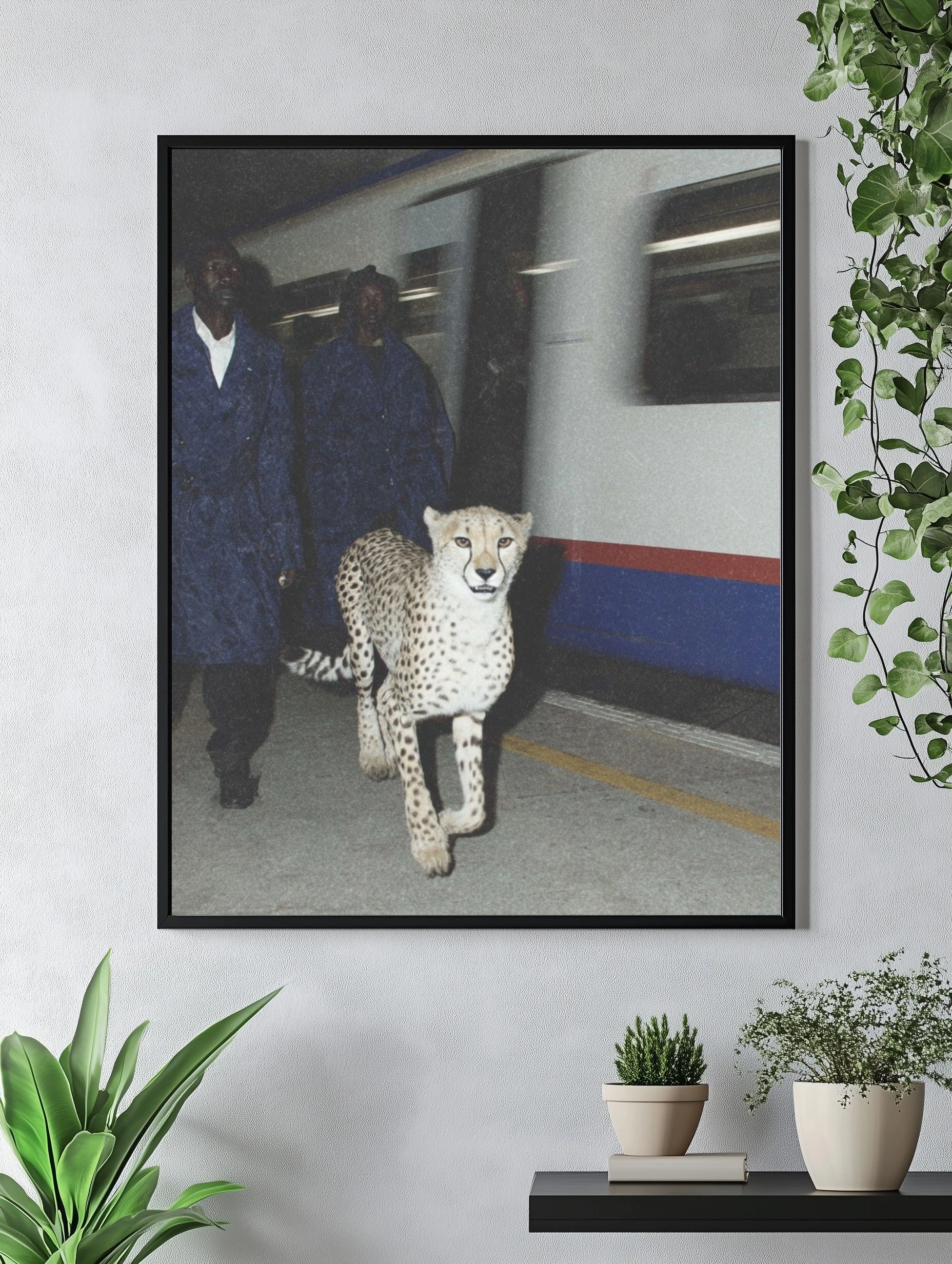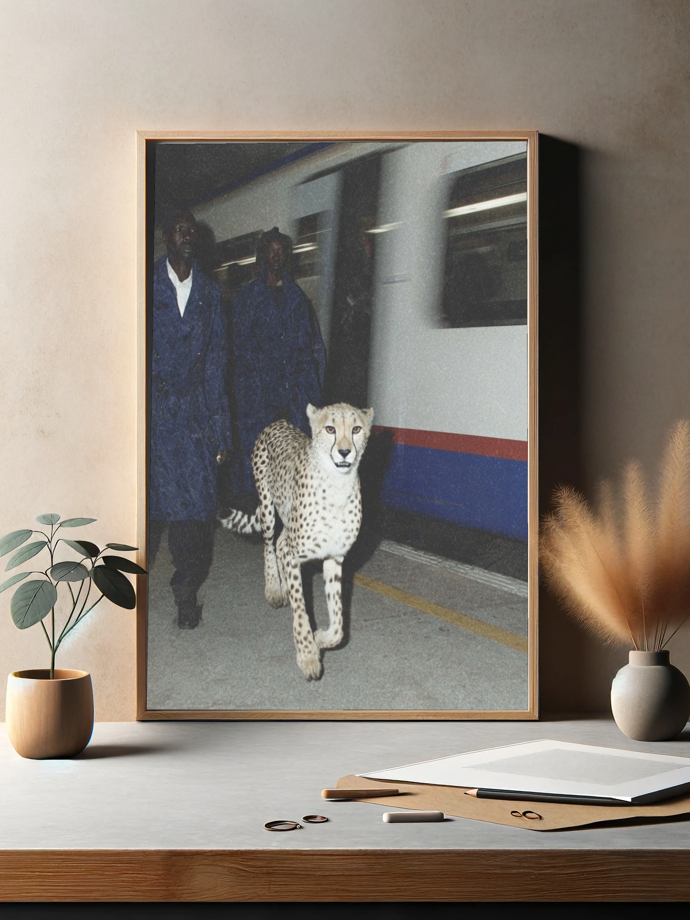 Этот уникальный постер запечатлел момент, когда гепард уверенно шагает по платформе метро, привнося в обыденную городскую атмосферу нотку дикой природы. На переднем плане выделяется грациозный силуэт гепарда с характерными пятнами, который привлекает внимание своей элегантностью и мощью. На заднем плане два человека в темных длинных пальто, создающие контраст с ярким фоном. Синяя линия по краю платформы добавляет динамики и подчеркивает движение. Постер выполнен в стиле реализма, передающем атмосферу неожиданности и удивления. Идеально подходит для оформления интерьеров в гостиных, офисах или креативных пространствах, где ценят уникальность и оригинальность. Целевая аудитория — молодежь и креативщики, стремящиеся выделиться.