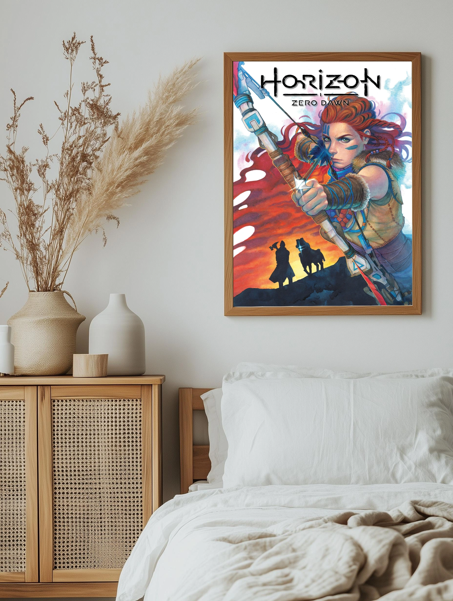 Яркое изображение героини Алоy из игры Horizon Zero Dawn, выполненное в стиле акварели с детальной прорисовкой лица и луком, направленным зрителю. Фон выполнен в теплых оттенках заката с силуэтами фигур и животных. Это интерьерное искусство отлично подходит для гостиной, спальни или офиса, придавая атмосферу силы и приключений.