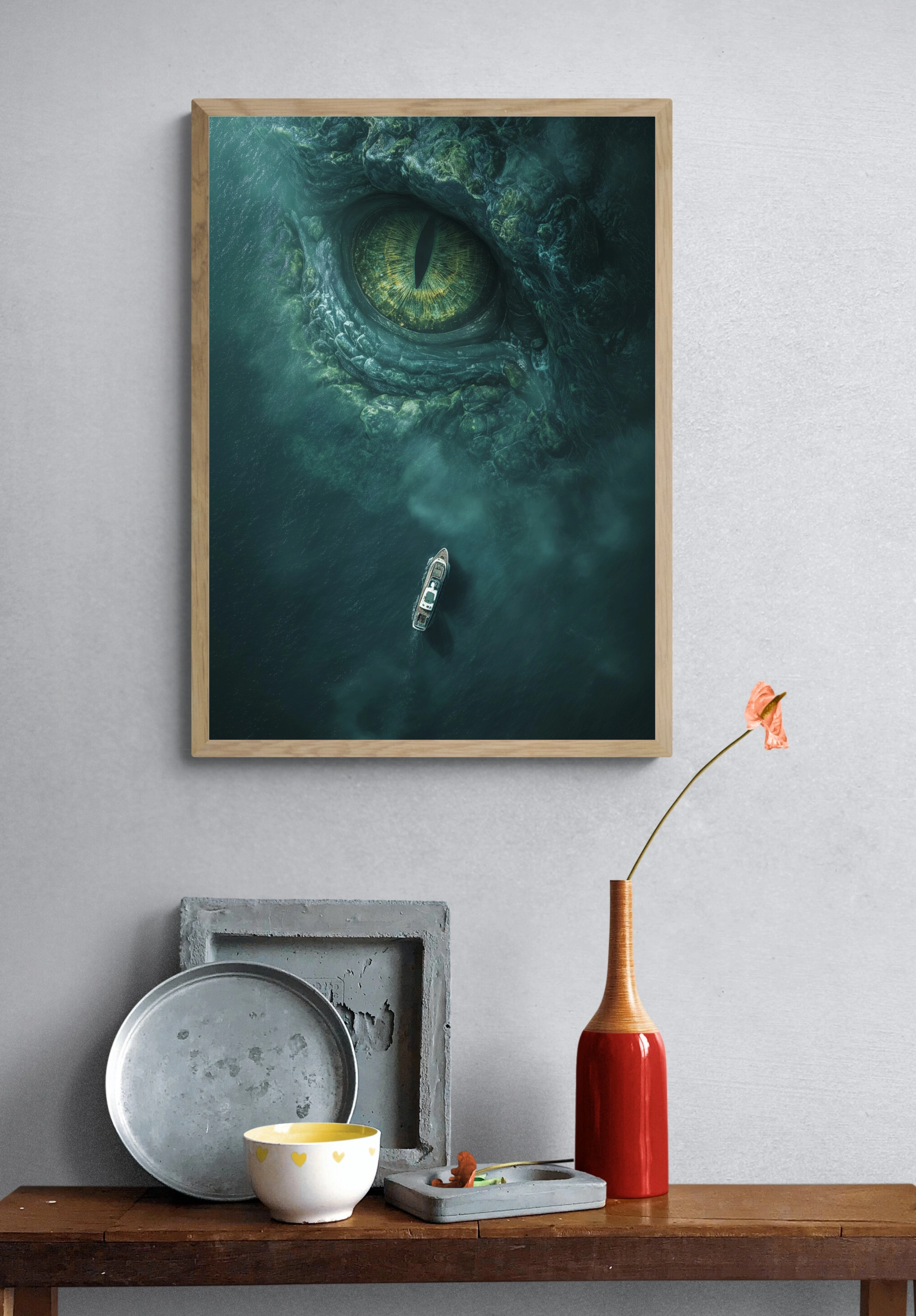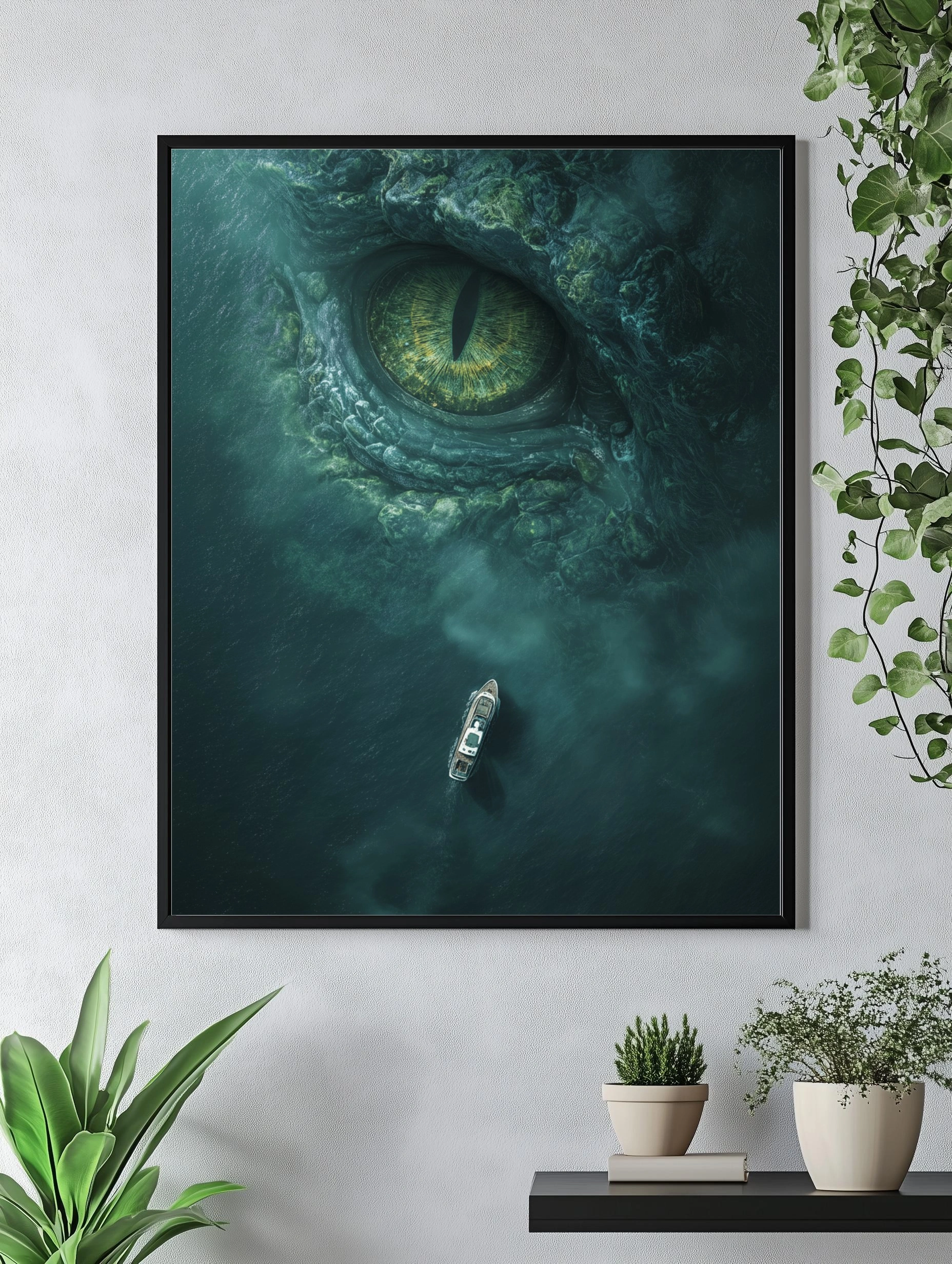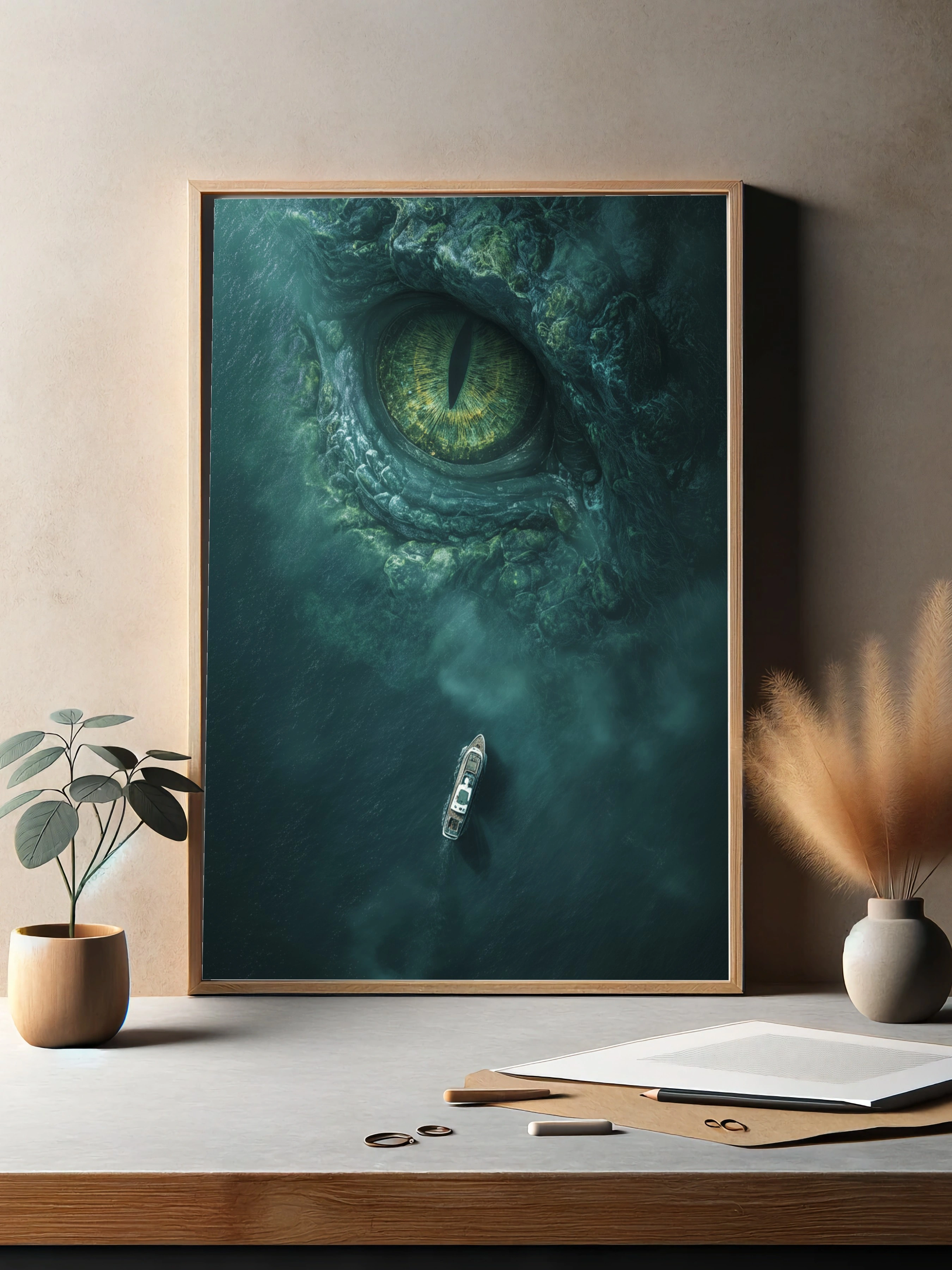 Погрузитесь в мир загадок и тайн с этим потрясающим постером, изображающим гигантский глаз морского чудовища, который смотрит из глубин океана. В центре композиции — массивный глаз с ярко-зелеными радужками и зрачком, который вызывает чувство трепета и восхищения. Внизу, на фоне темной воды, маленькая лодка, словно точка на фоне огромного существа, добавляет ощущение масштаба и драматизма. Цветовая гамма включает глубокие оттенки синего и зеленого, создавая атмосферу мистики и напряжения. Этот постер идеально впишется в интерьер гостиной или кабинета, привнося в пространство элементы приключений и фантазии. Подходит для молодежи и любителей морских легенд.