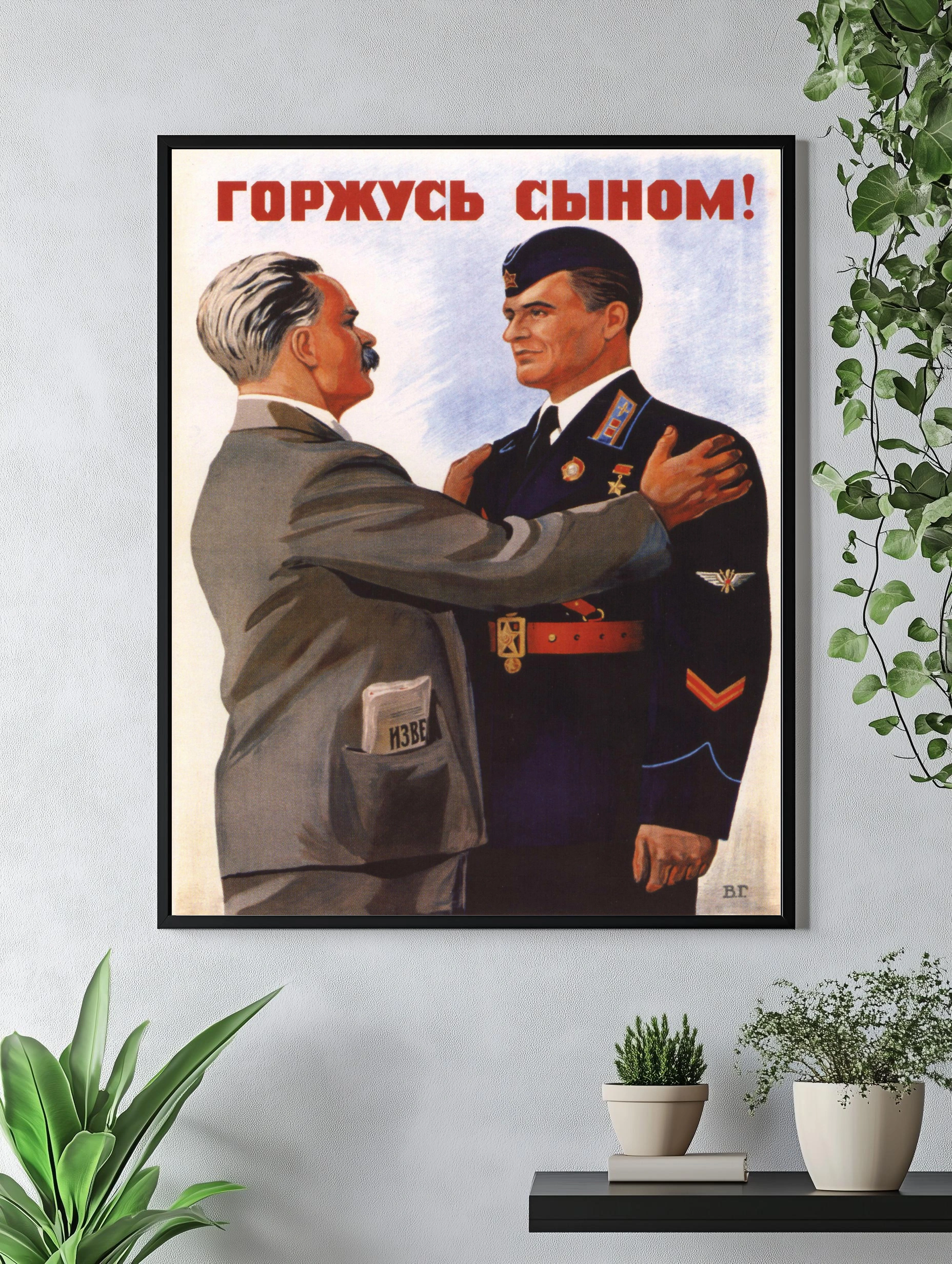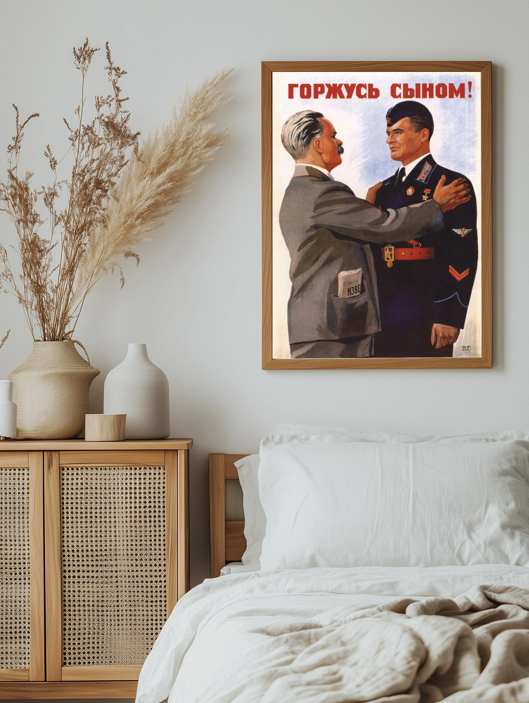 Яркий советский плакат с надписью «Горжусь сыном!» показывает отца, с гордостью смотрящего на своего сына-военнослужащего в парадной форме с медалями. Стиль реализован в реалистичной манере, характерной для советской пропаганды. Это интерьерный постер, который подчеркнёт тему патриотизма и семейных ценностей в доме или офисе.