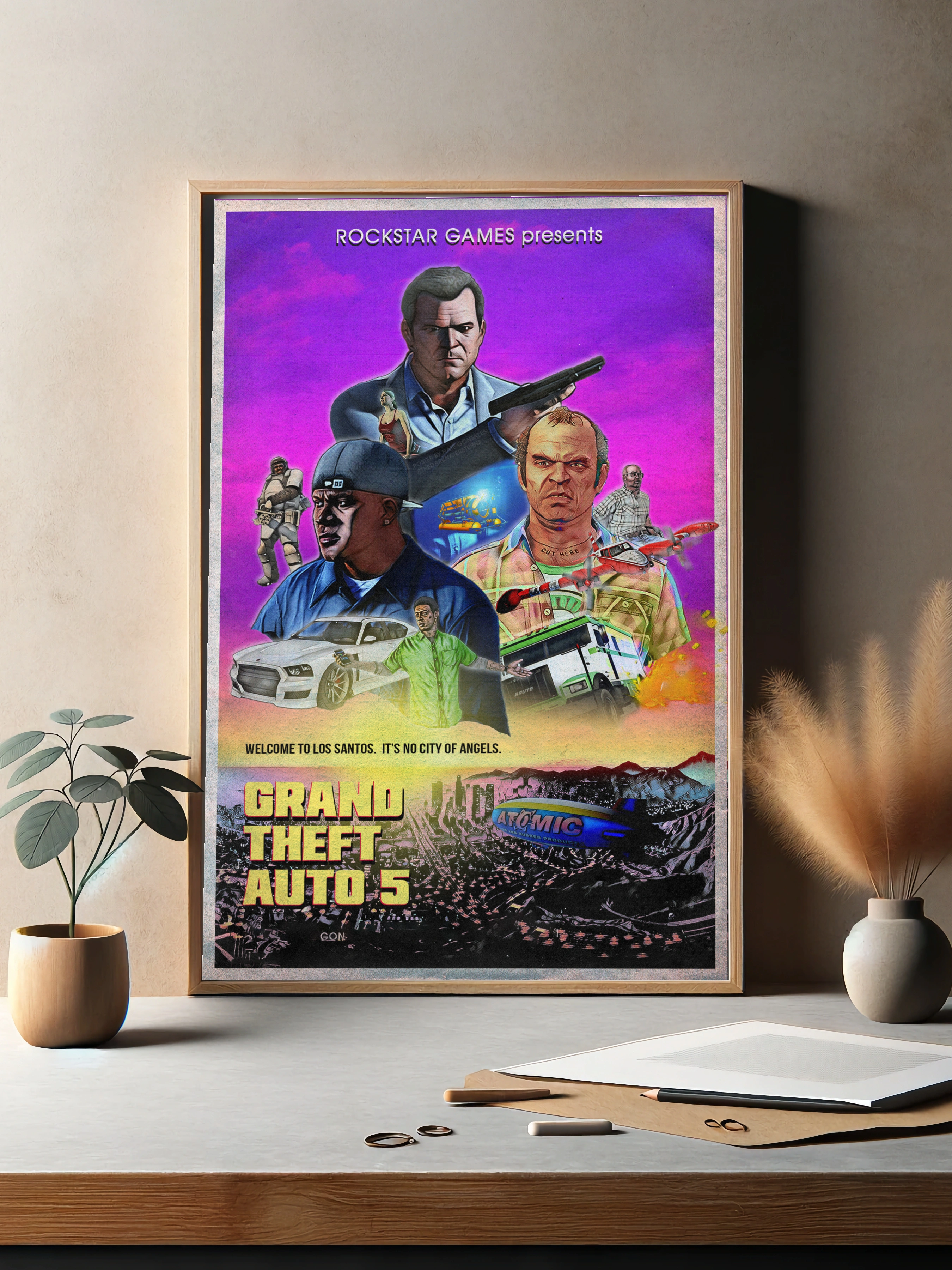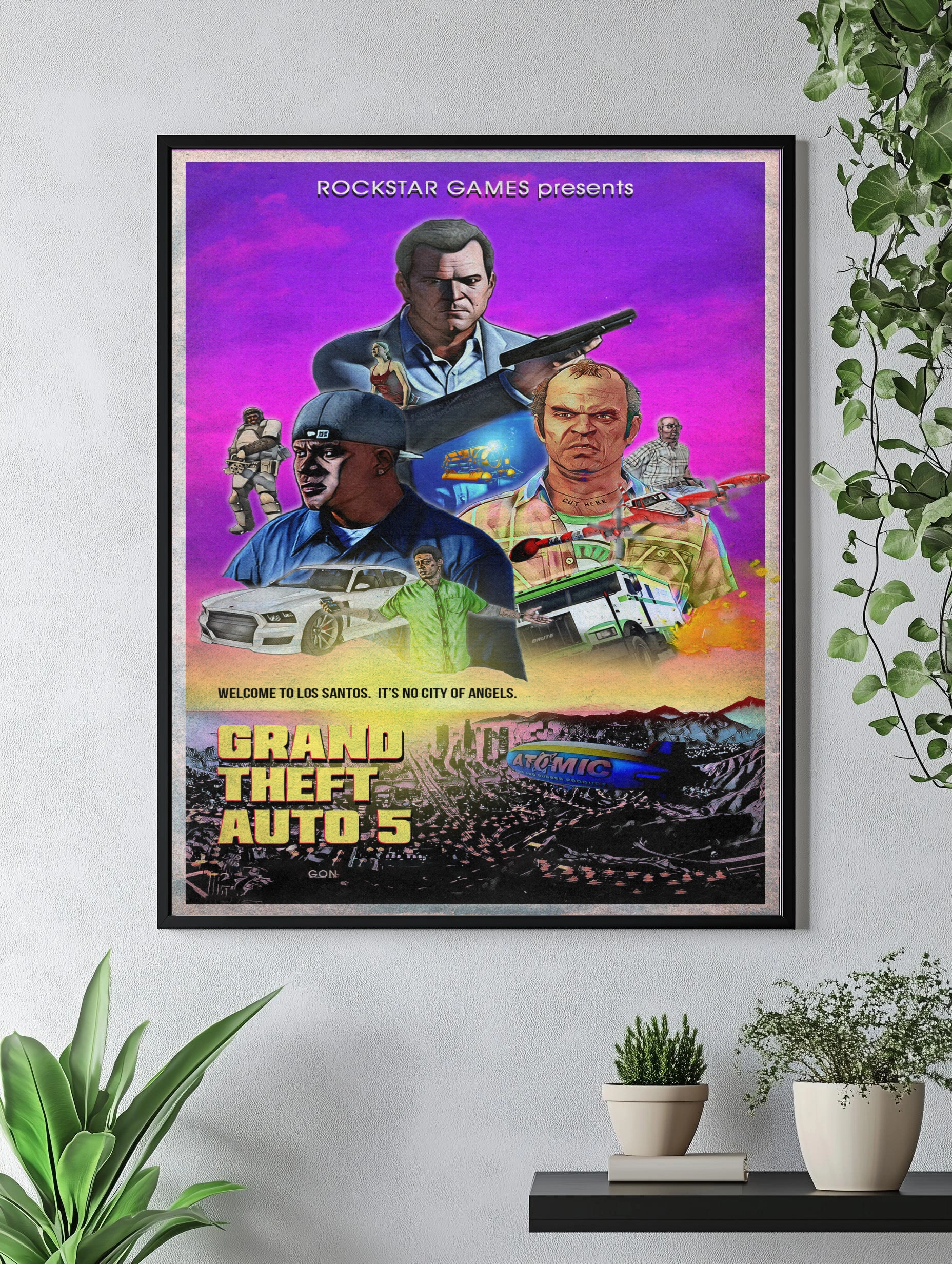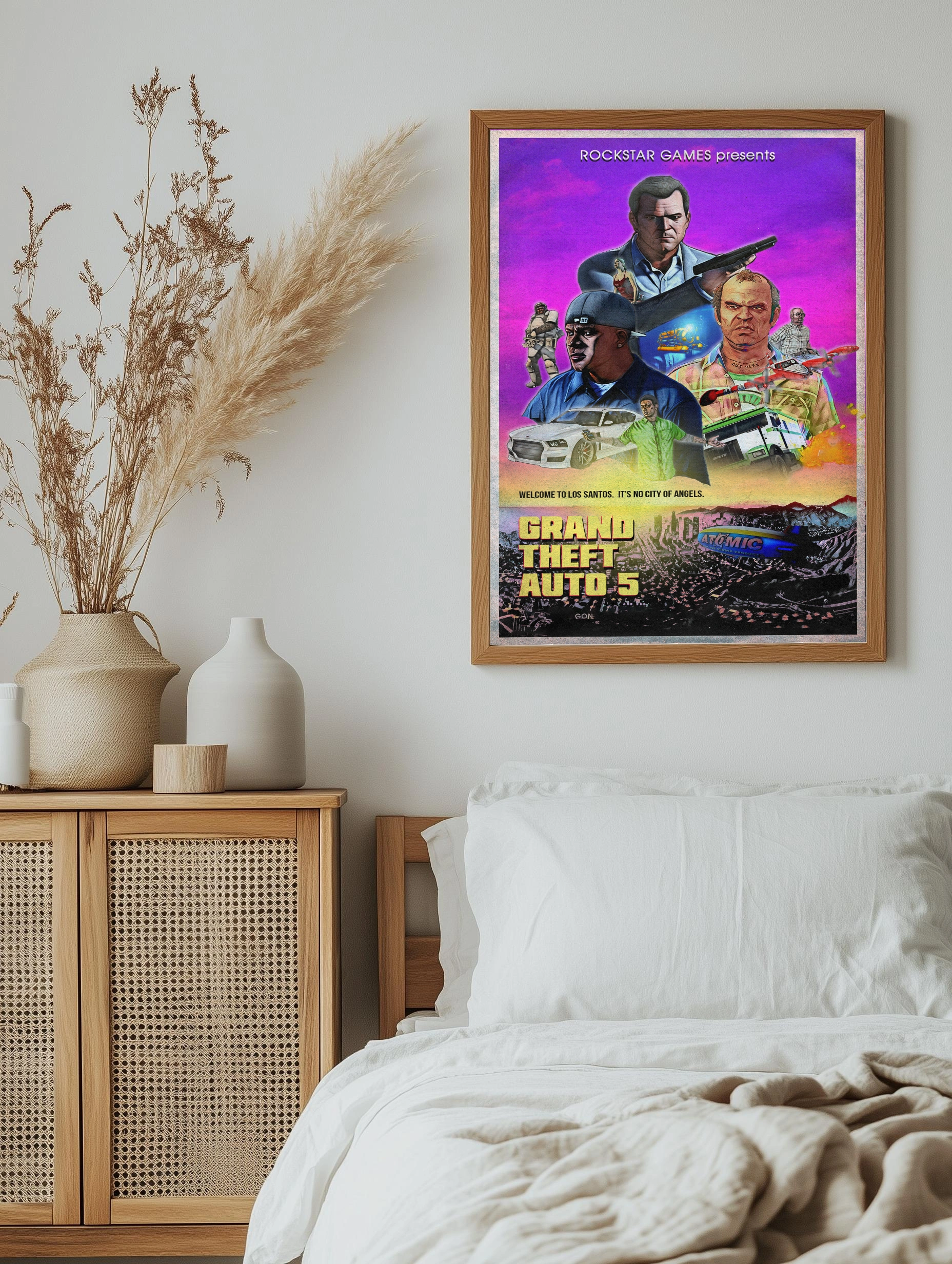 На изображении изображён постер культовой игры Grand Theft Auto 5 от Rockstar Games. В центре композиции три главных персонажа — Майкл, Франклин и Тревор — на фоне насыщенного градиента от ярко-фиолетового к розовому. Внизу показан город Лос-Сантос и элементы криминального мира — машины, оружие, а также слоган «Welcome to Los Santos. It’s no city of angels». Яркий, драматичный интерьерный плакат идеально подходит для фанов игры и ценителей современного искусства для стен.