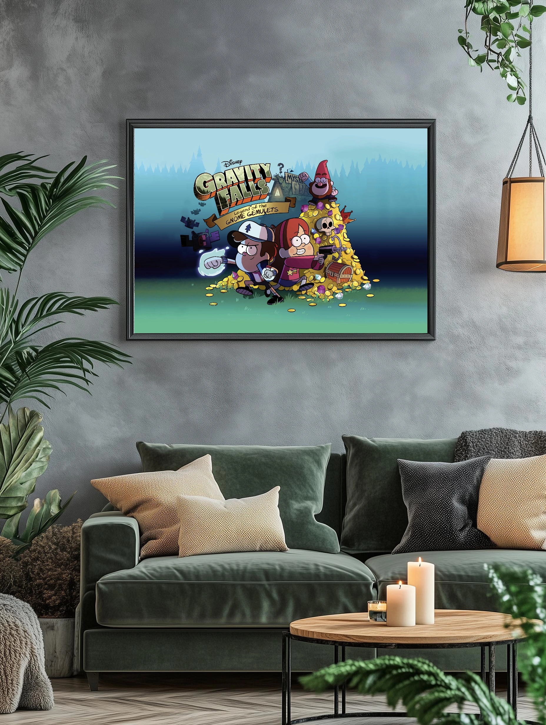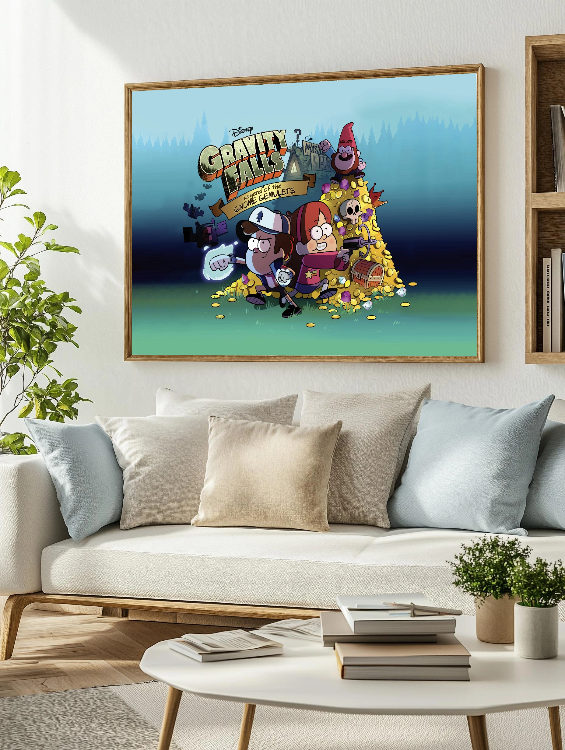 Яркий интерьерный рисунок из мультфильма Gravity Falls, где главные герои Диппер и Мэйбл стоят на фоне горы золота и драгоценных камней с кубком и сундуком. В стиле мультяшной графики с насыщенными цветами он отлично дополнит детскую комнату или творческое пространство. Стильное современное искусство для стен с элементами волшебства и приключений.