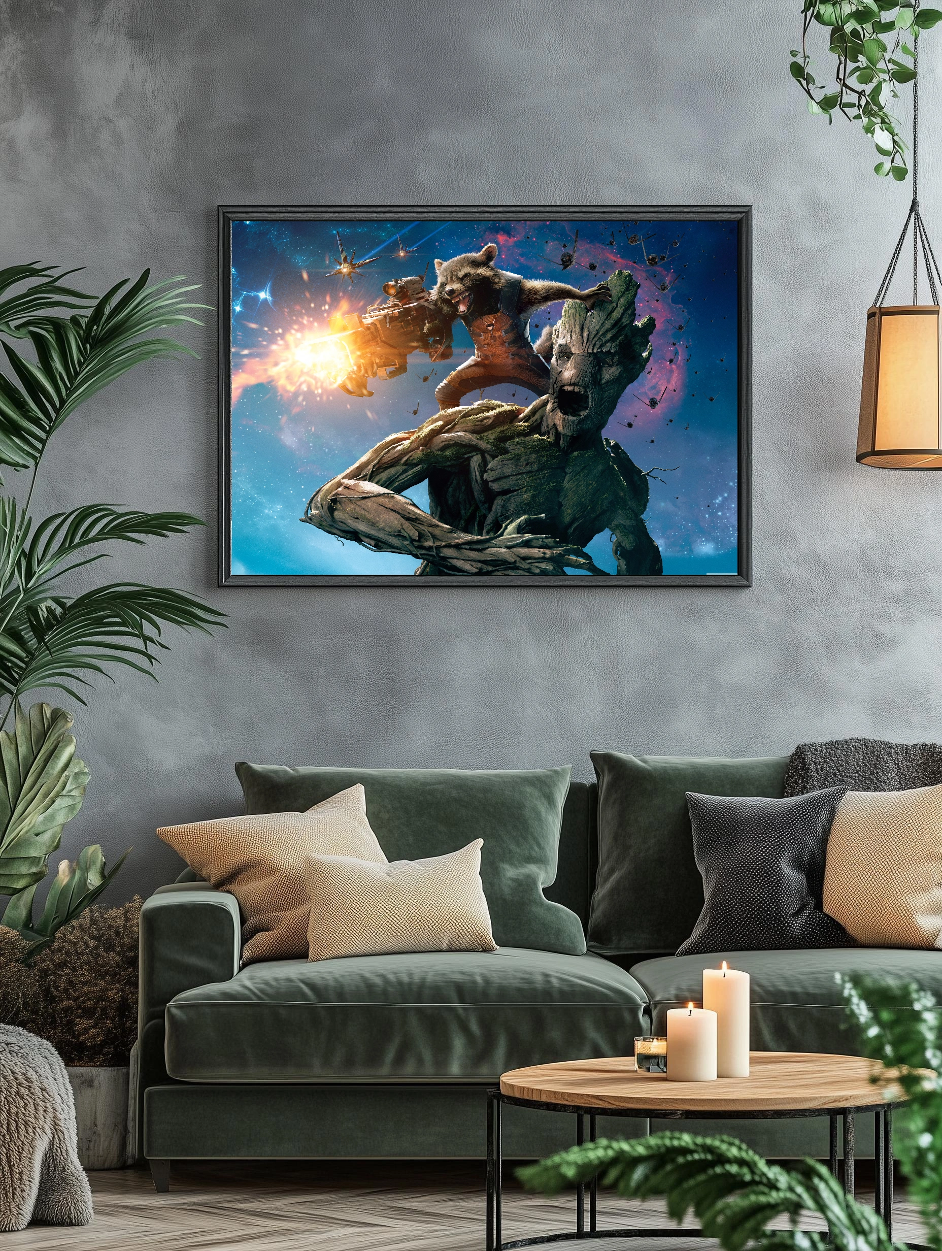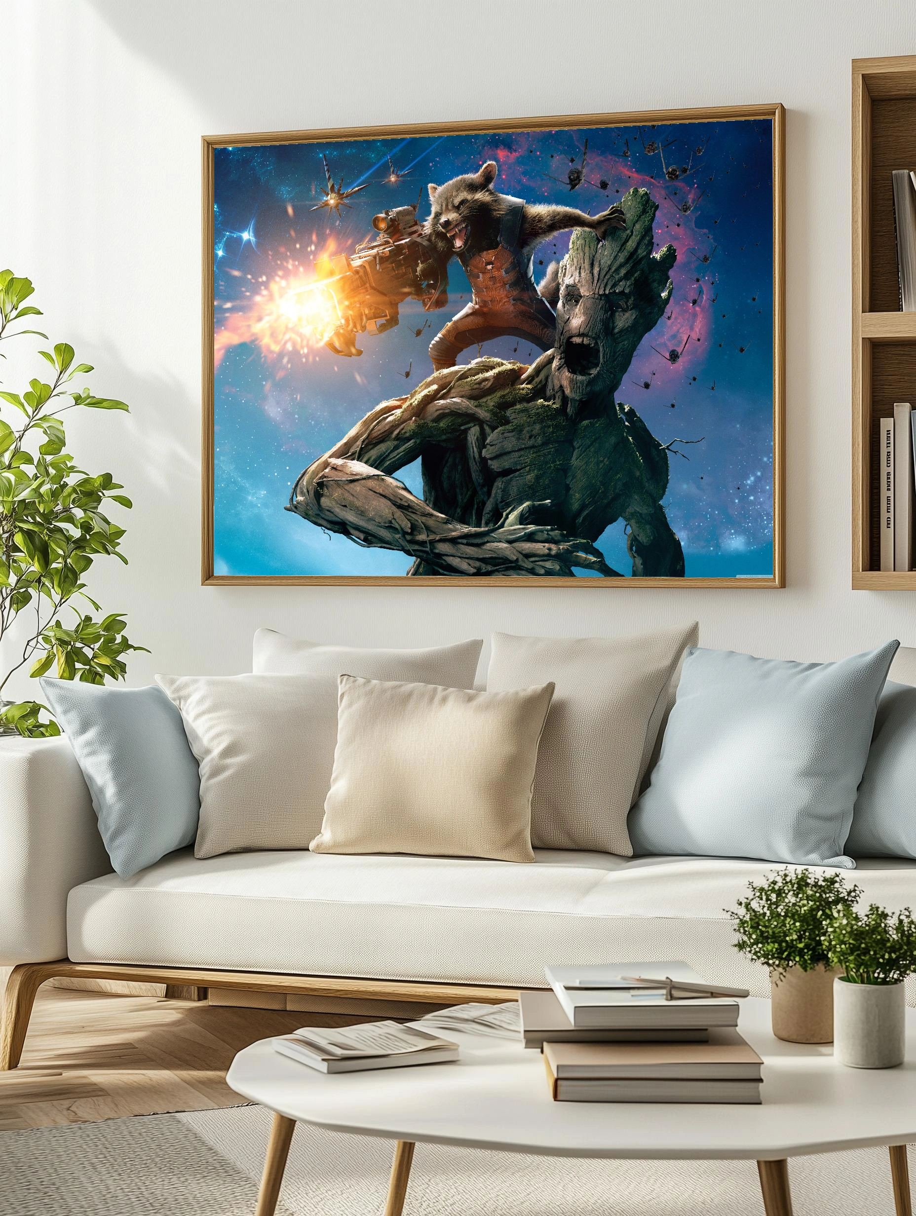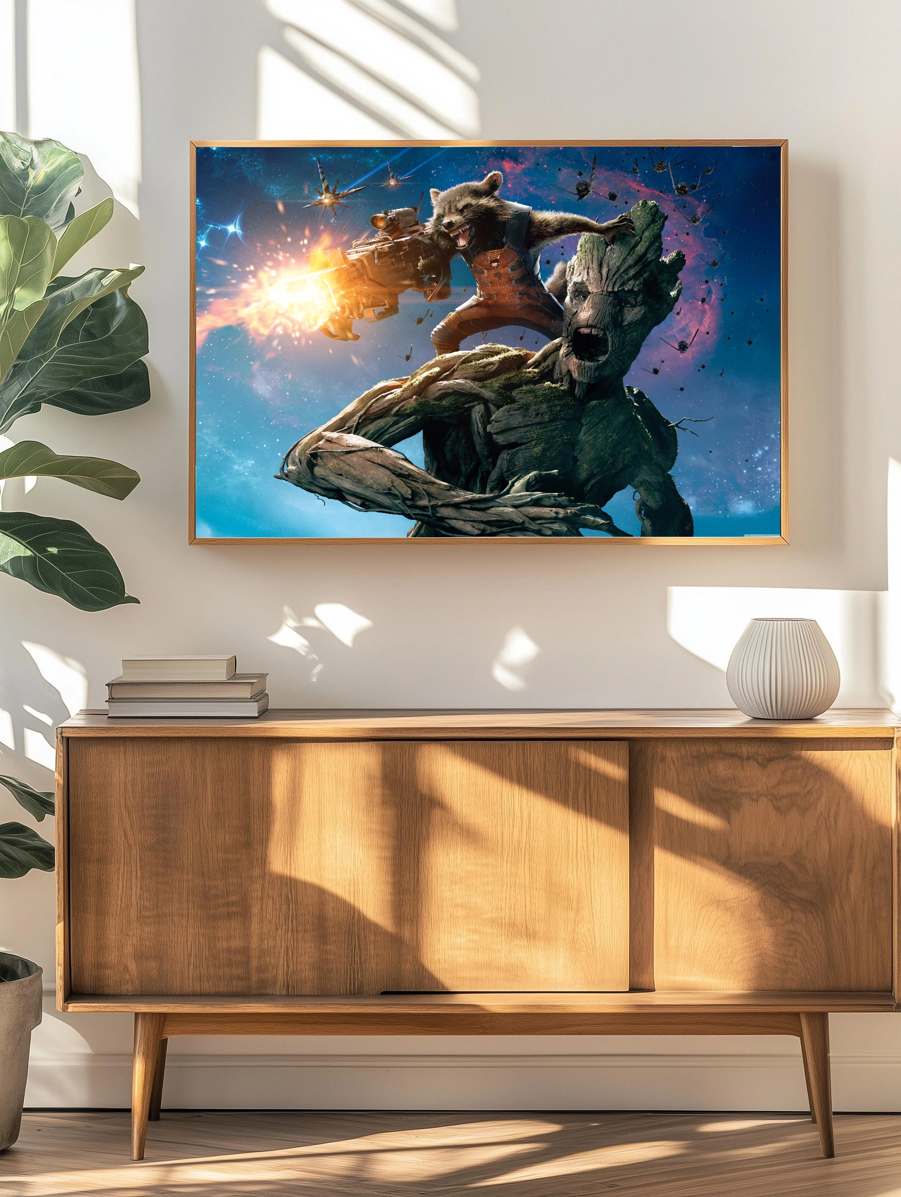 Изображение показывает двух известных персонажей из фильма ‘Стражи Галактики’: Грута — огромного древесного существа с мохом на поверхности кожи, и Ракету, антропоморфного енота с крупным оружием, стреляющего по врагам. Фон выполнен в космическом стиле с яркими всполохами и звёздами, передаёт динамику и напряжение боя. Этот интерьерный постер отлично подойдет для современного декора дома или офиса, добавляя стиль и энергию космического приключения.