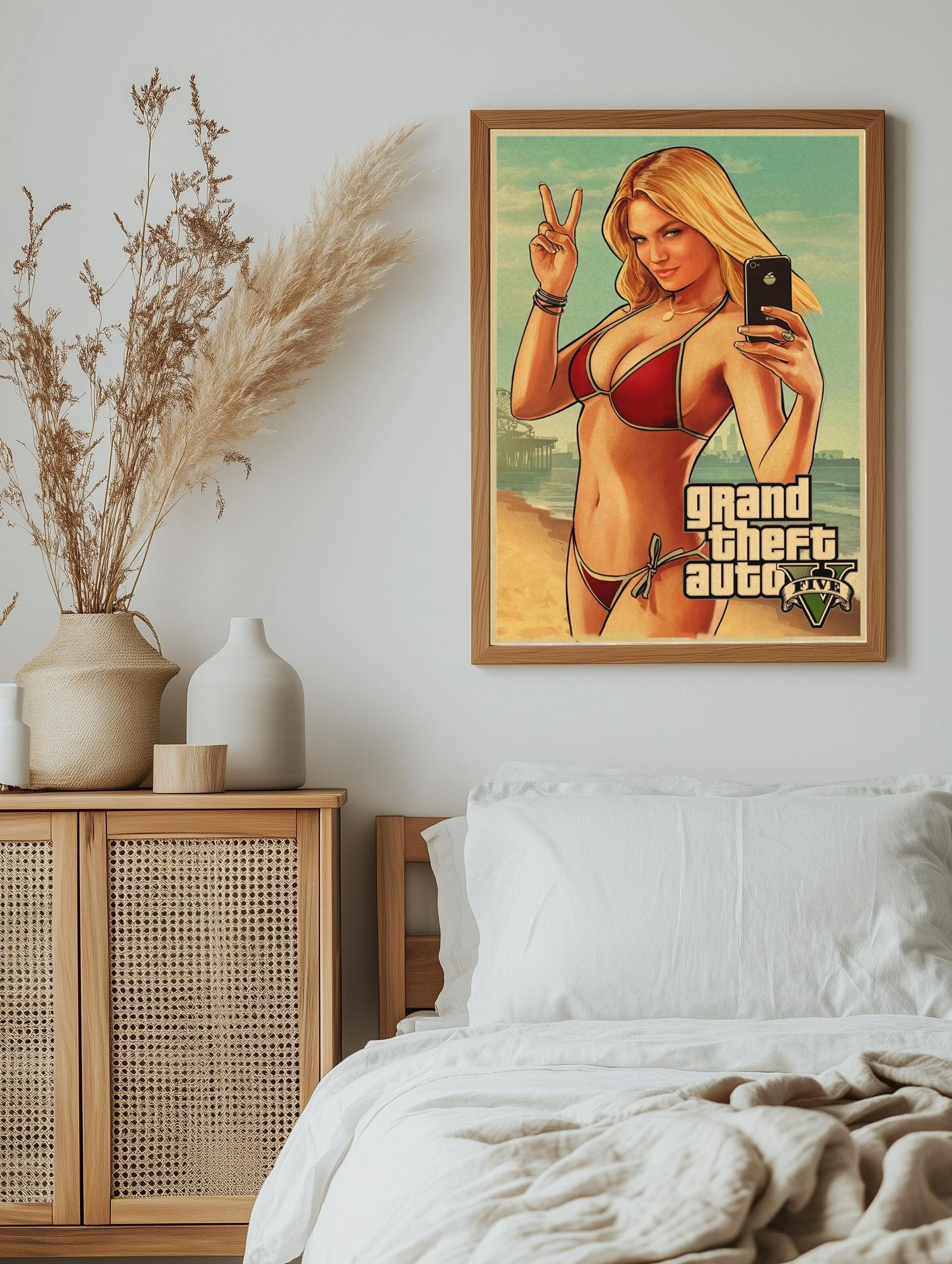 Этот интерьерный плакат изображает знаменитую героиню из видеоигры Grand Theft Auto V в стиле яркой и сочной иллюстрации. Девушка в красном купальнике позирует с телефоном на фоне городского пейзажа Лос-Сантоса. Это художественный плакат, отлично подходящий для декора офиса или гостиной, придающий интерьеру современный и динамичный характер.