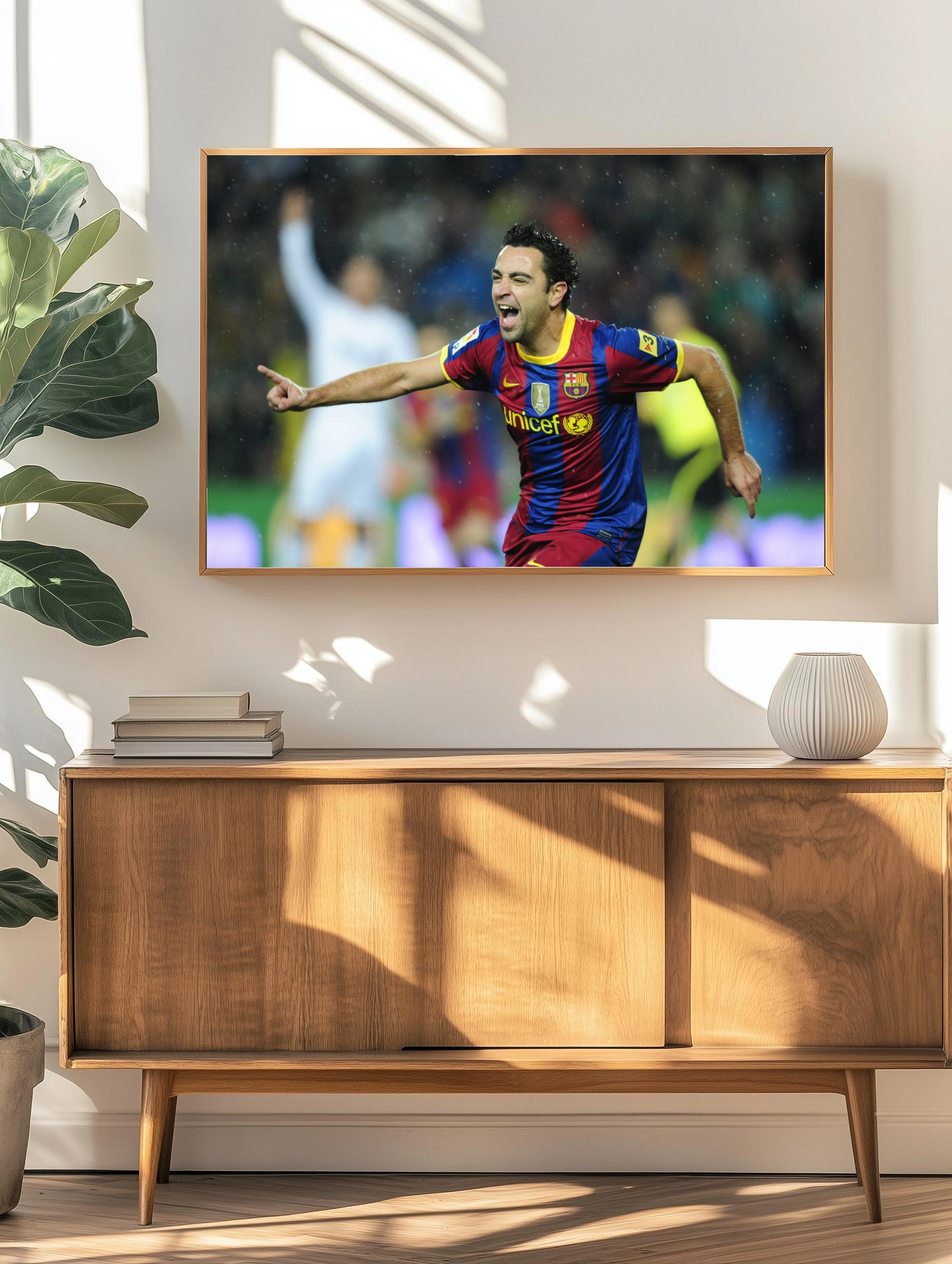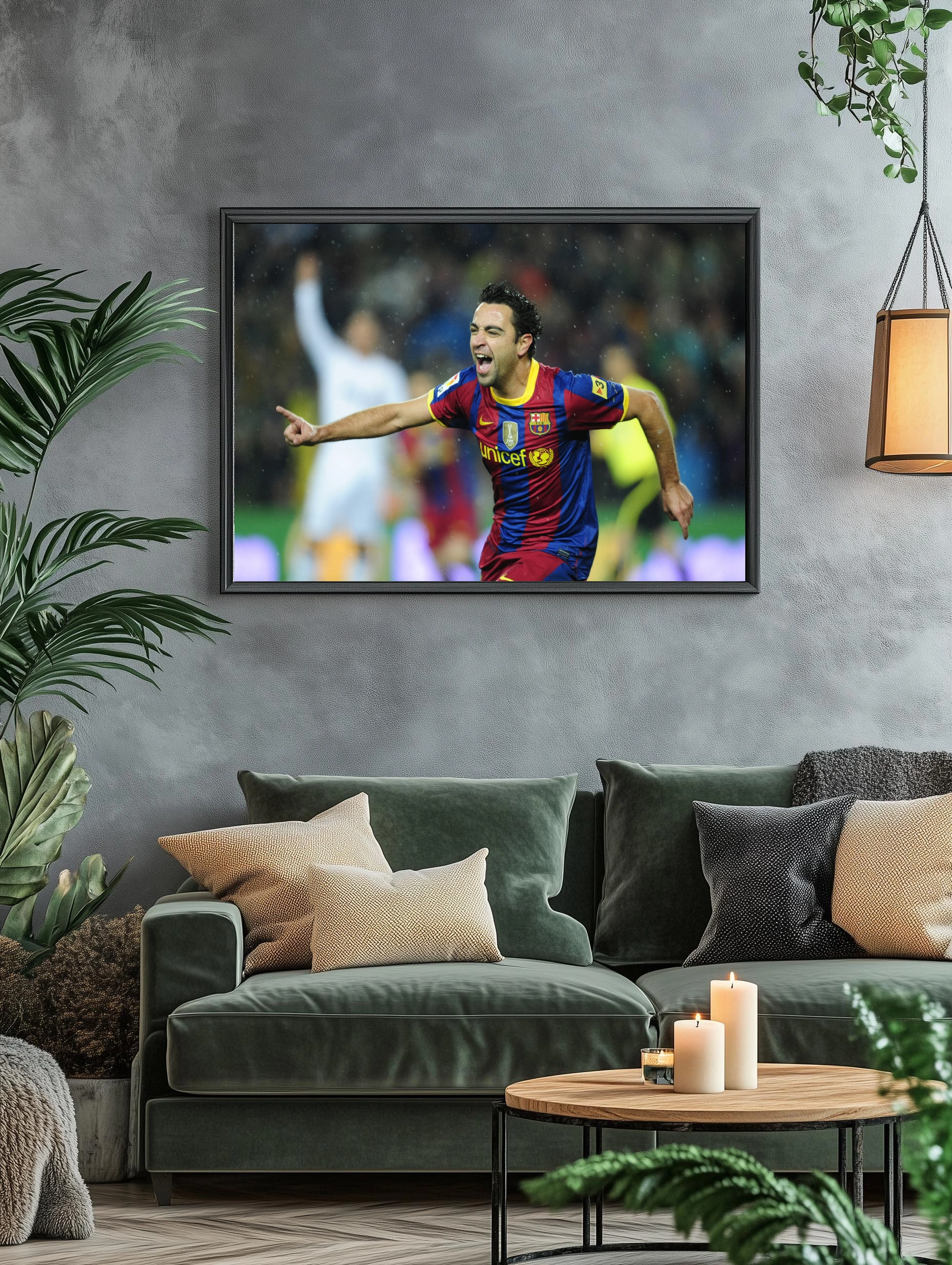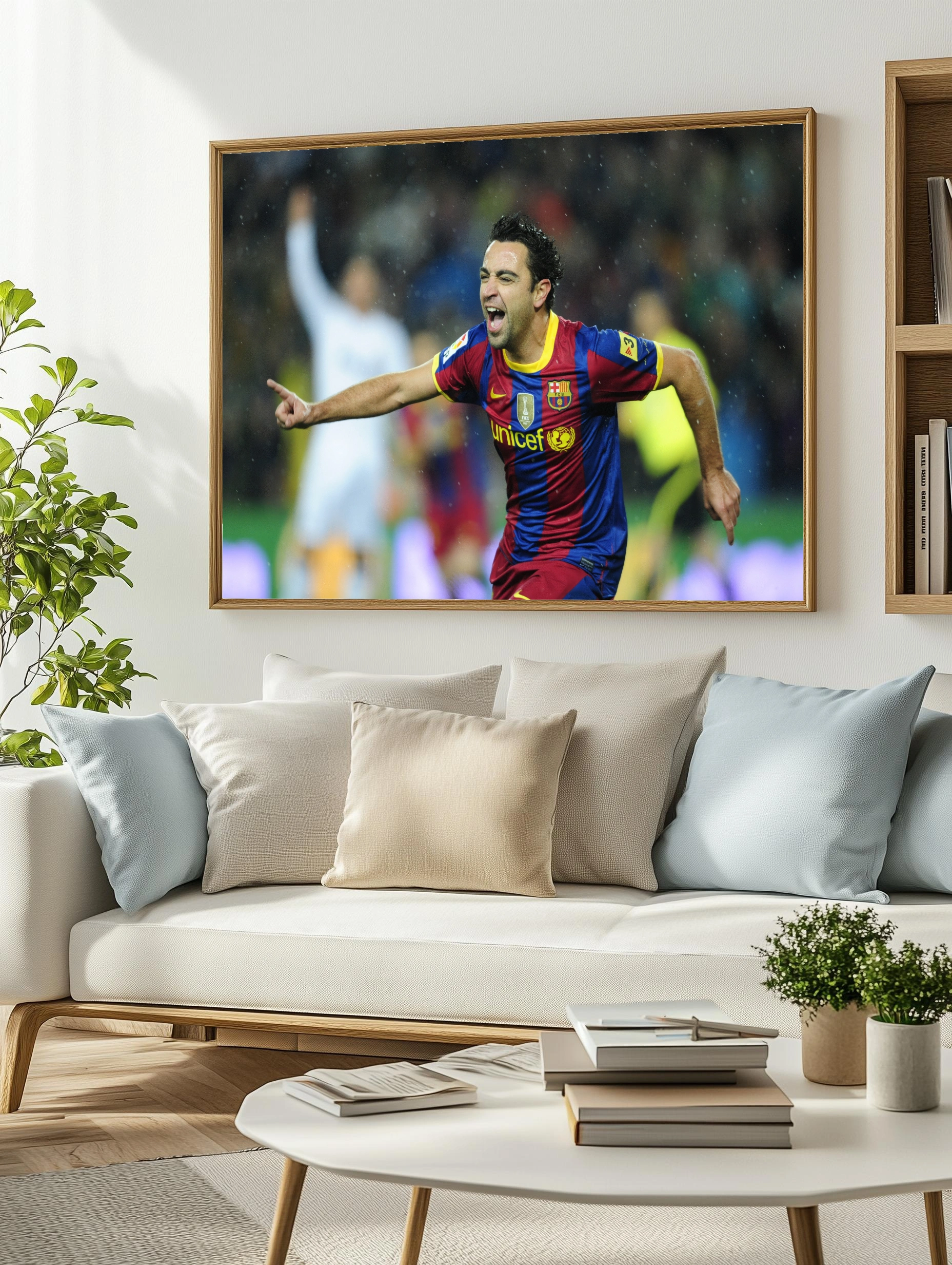 На изображении представлен известный испанский футболист Хави в игровом моменте, одетый в форму футбольного клуба Барселона с красно-синими цветами, отмечая гол или удачное действие на поле. Фотография передает динамичное настроение, спортивную энергию и эмоции триумфа. Этот интерьерный арт для футбольных болельщиков — идеальное украшение для гостиной или игрового зала.