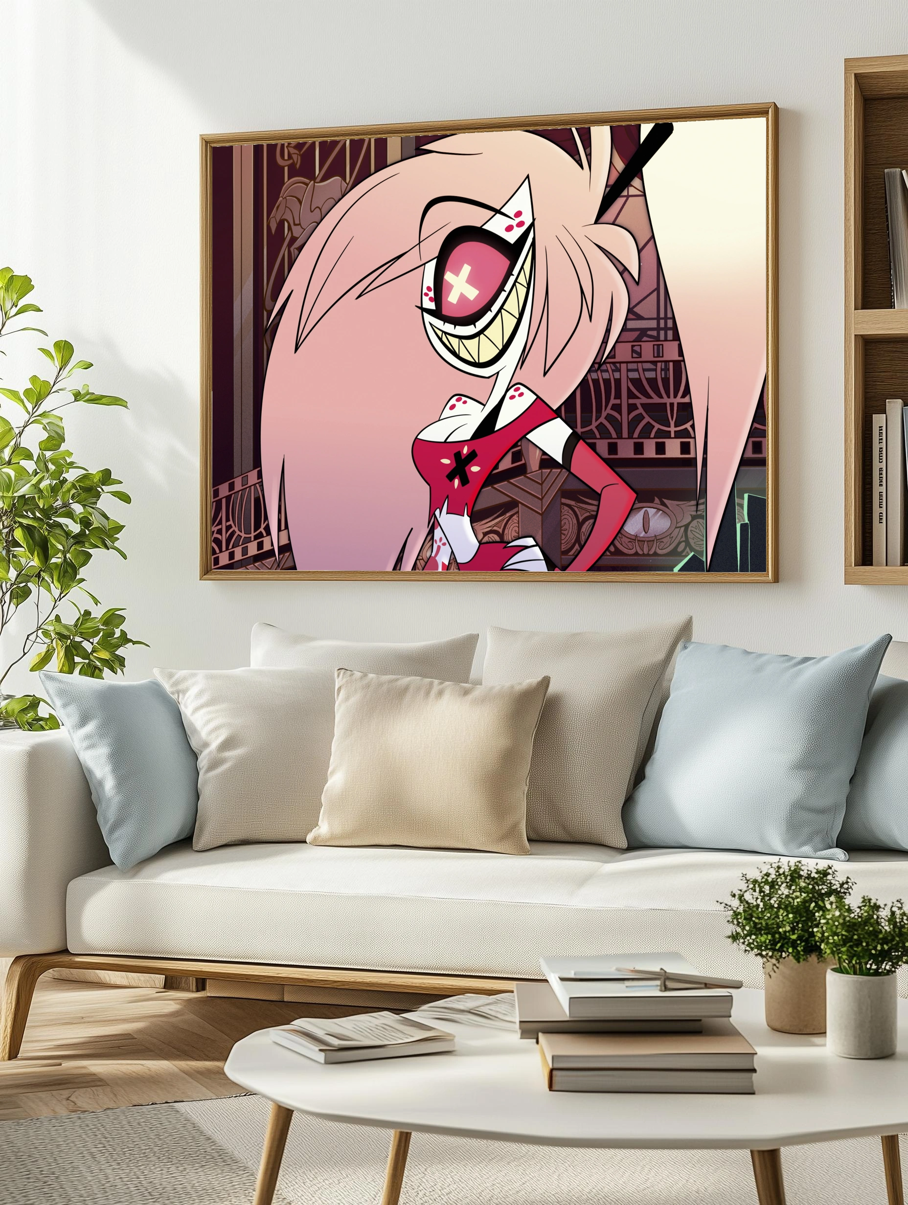 Изображена Хозяюшка Хелл — узнаваемый персонаж анимационного сериала с ярким и выразительным стилем дизайна. Основные цвета — розовый, красный и черный — создают динамичную и немного мрачную атмосферу. Эта картина для спальни или гостиной станет эффектным декоративным плакатом и уникальным элементом интерьерного искусства для поклонников современного анимационного искусства.