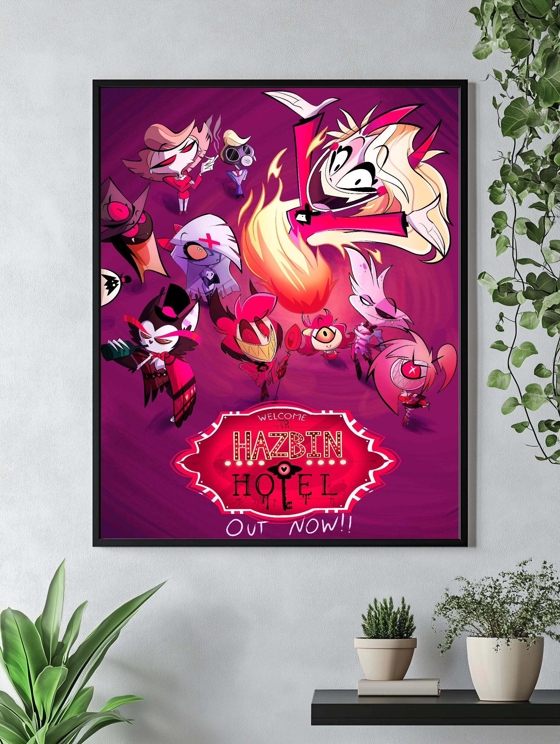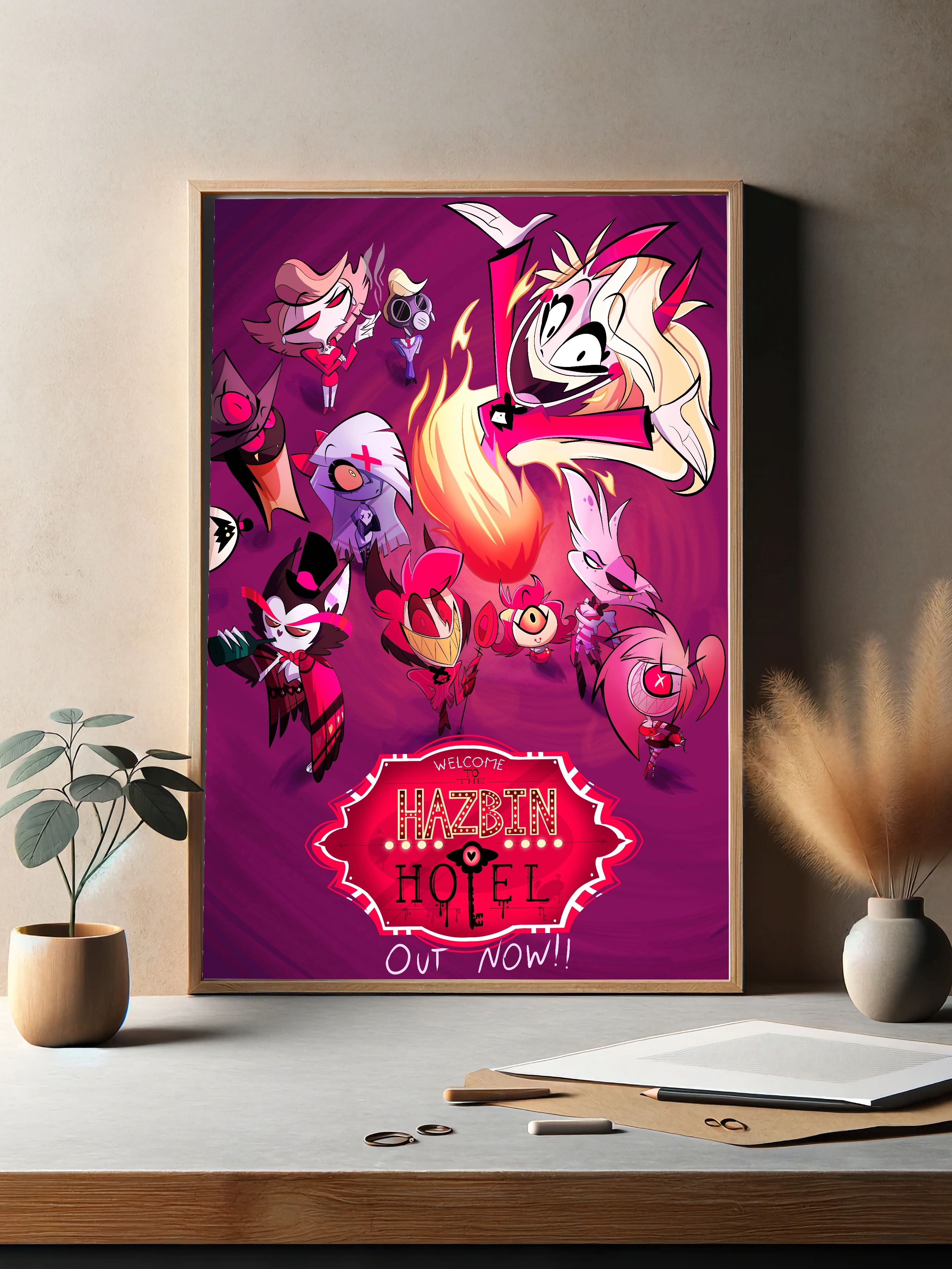 Яркий и динамичный постер с персонажами анимационного сериала Hazbin Hotel, выполненный в насыщенных красных, розовых и фиолетовых тонах. Образец современного искусства для интерьера с узнаваемым логотипом и живым настроением, идеально подходит для гостиной, спальни или офиса как декоративный плакат с принтом.